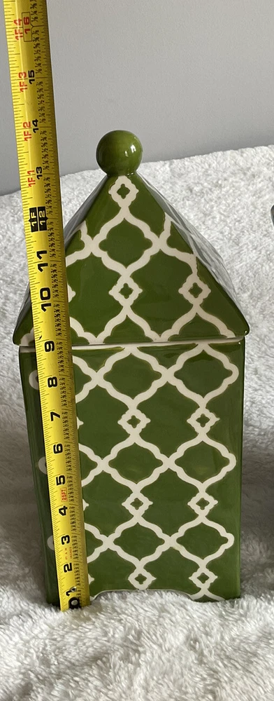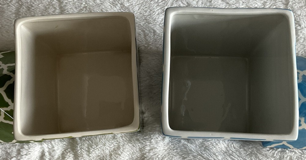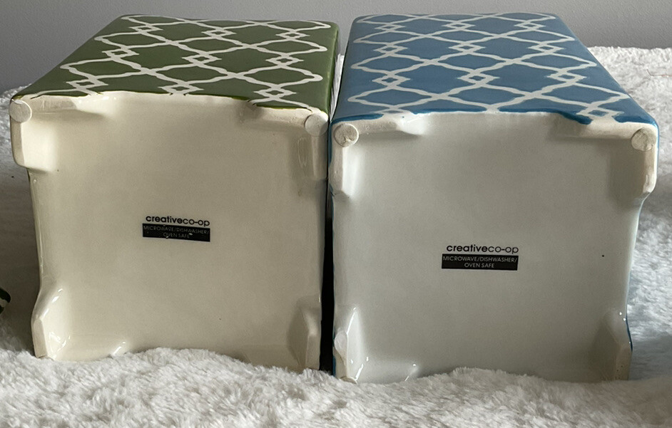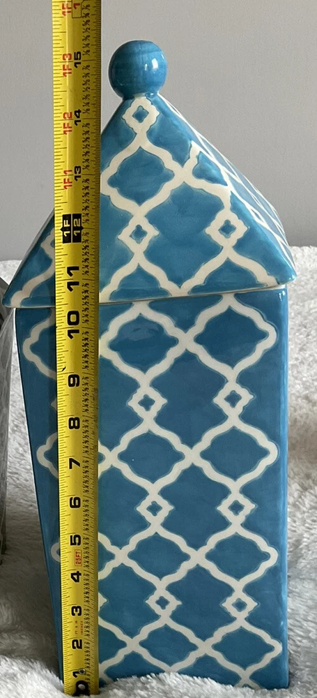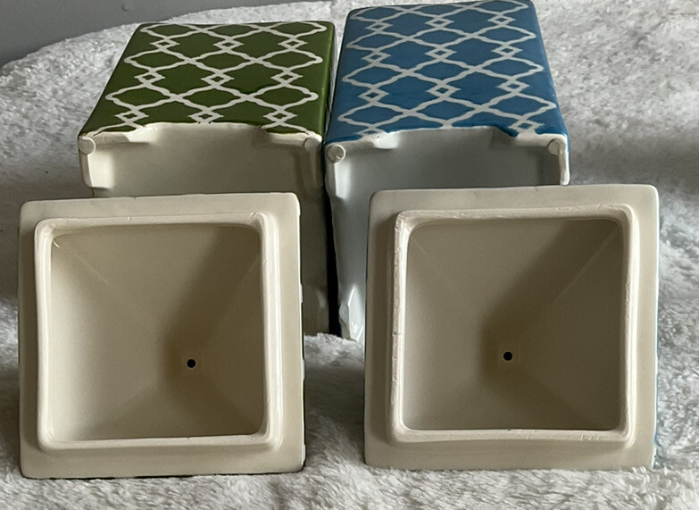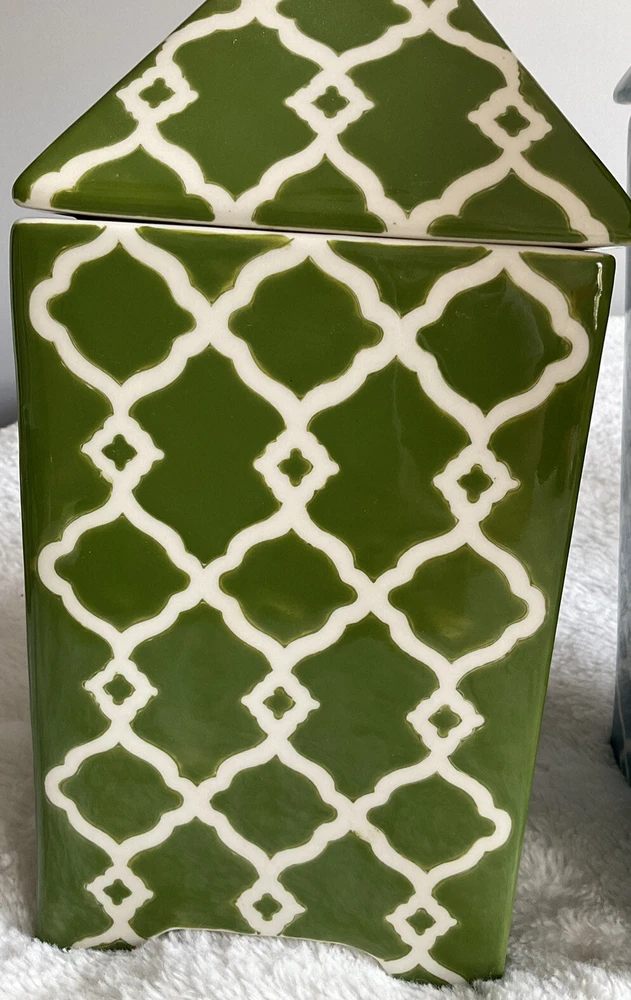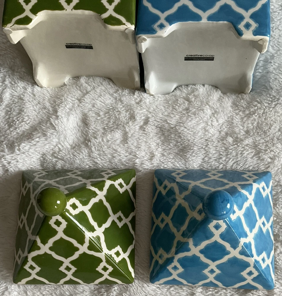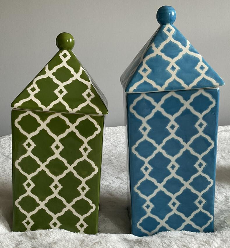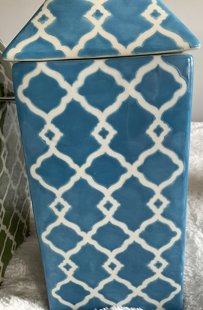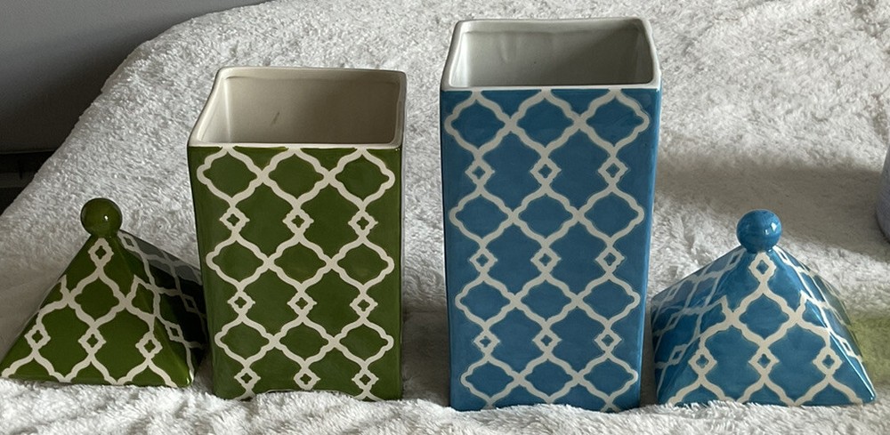 Creative Co-Op Set Of 2 Ceramic Trellis Canisters Blue And Green With Lids. EUC. Beautiful canisters, they are very heavy! Blue canister weighs 7 lbs and the green canister weighs 5.5 lbs. They are dishwasher, microwave and oven safe. No chips or cracks noted. In excellent condition. Will be packaged well to insure safe arrival. This seller reserves the right to change shipping mode and carrier as needed. Thank you.