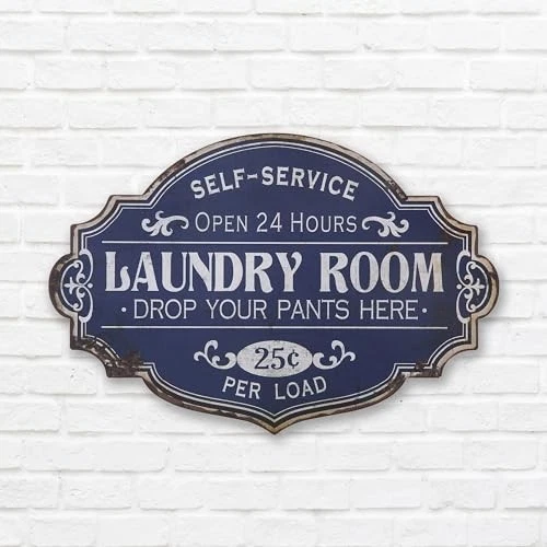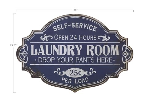 Product Page Add a vintage and humorous touch to the laundry room with this metal wall sign with distressed finish in blue colorThis wall sign is suitable for any rustic, farmhouse, or industrial style of home decor, as it creates a nostalgic and quirky look with its metal construction and witty phrasesThese wall décor pieces have an integrated hanging mechanism that can hang them horizontallyThis wall sign is made of metalThis wall sign measures 20 inches long and 13.25 inches highHeavily distressed finish Enhance the laundry room with this metal wall sign with a distressed finish in blue color. This wall sign features a metal sign that has the words "Self-service 25 Description: Enhance the laundry room with this metal wall sign with a distressed finish in blue color. This wall sign features a metal sign that has the words "Self-service 25 Features: Add a vintage and humorous touch to the laundry room with this metal wall sign with distressed finish in blue color This wall sign is suitable for any rustic, farmhouse, or industrial style of home decor, as it creates a nostalgic and quirky look with its metal construction and witty phrases These wall décor pieces have an integrated hanging mechanism that can hang them horizontally This wall sign is made of metal This wall sign measures 20 inches long and 13.25 inches high Heavily distressed finish