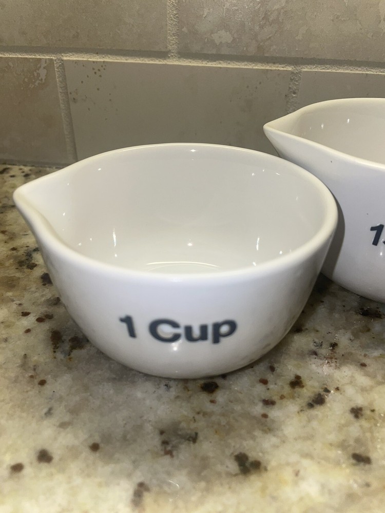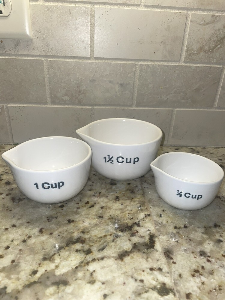 Creative Co-Op White Ceramic Stoneware Measuring Cups Set of 3. Never been used. No chips or cracks. Set includes 1 1/2 cup, 1 cup and 1/2 cup.