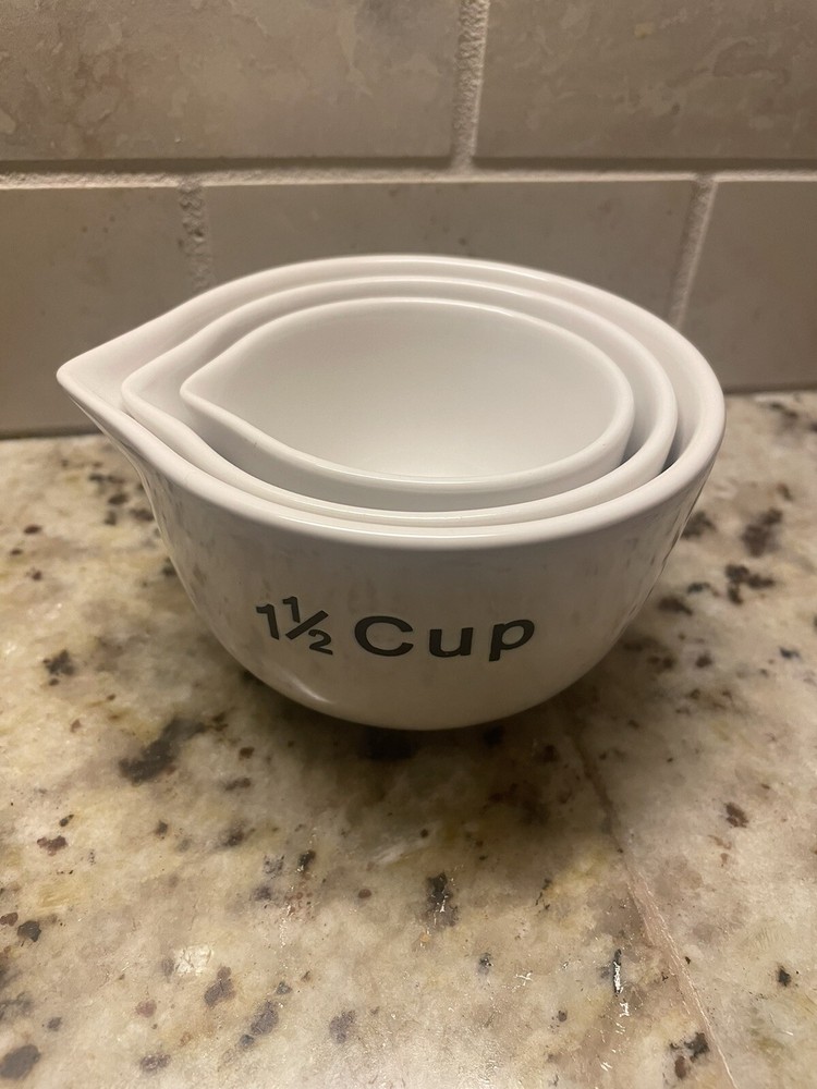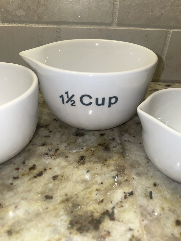 Creative Co-Op White Ceramic Stoneware Measuring Cups Set of 3. Never been used. No chips or cracks. Set includes 1 1/2 cup, 1 cup and 1/2 cup....