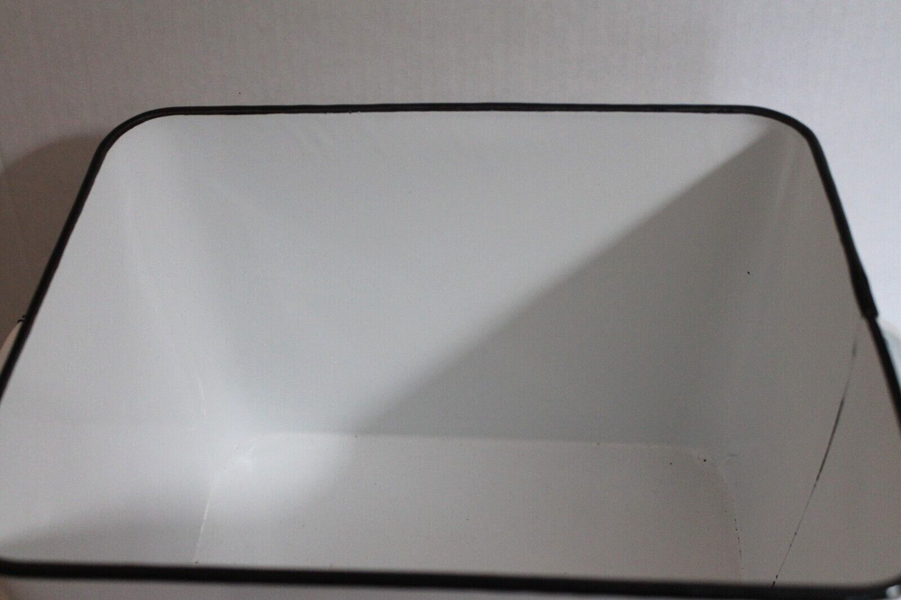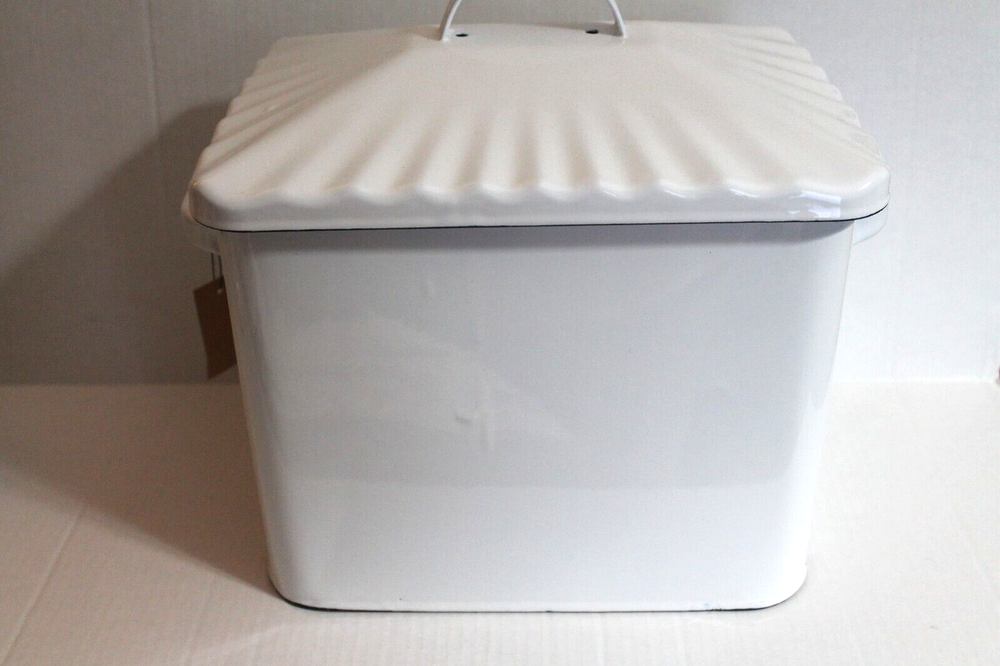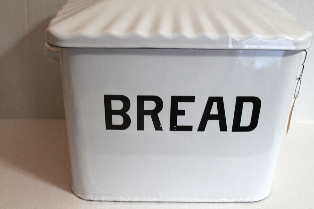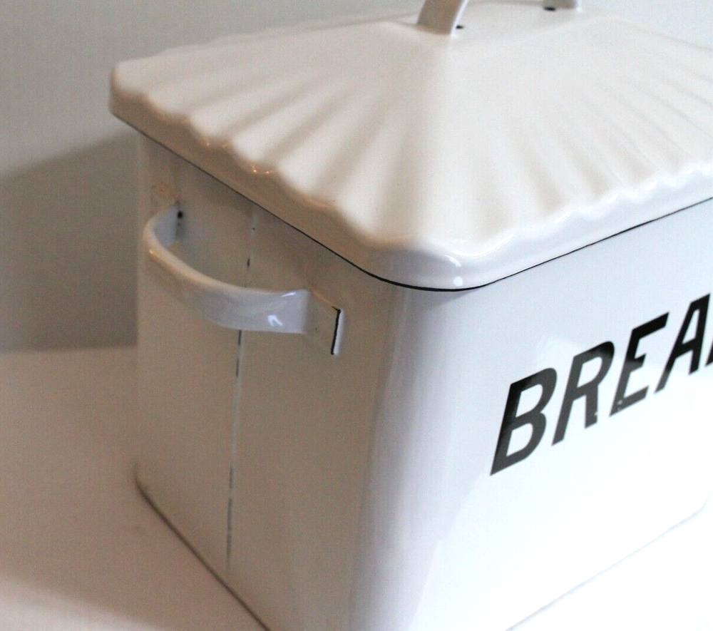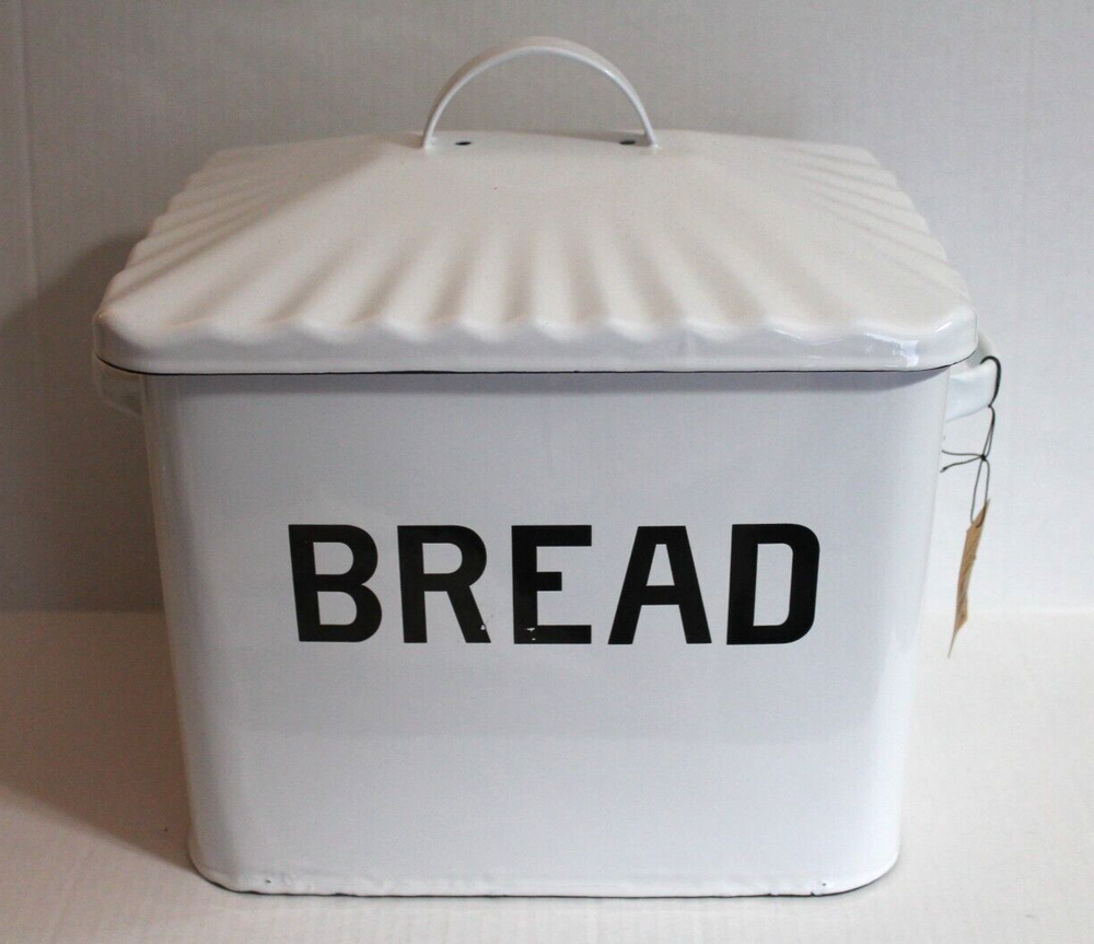 Creative Co-Op White Metal Bread Box Measures 915" L x 9" W x 10" H White enamel metal bread box with a lid on the top. It has the word BREAD in black lettering on the front. Looks like the old vintage bread boxes of the past, but it is new with tags. Great to store bread in, or just for kitchen decor! I ship quickly, the day after payment is received, or sometimes even the same day. My home is smoke free.