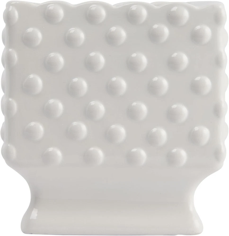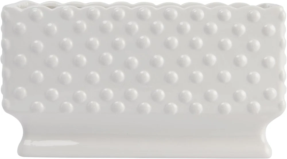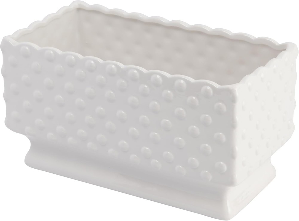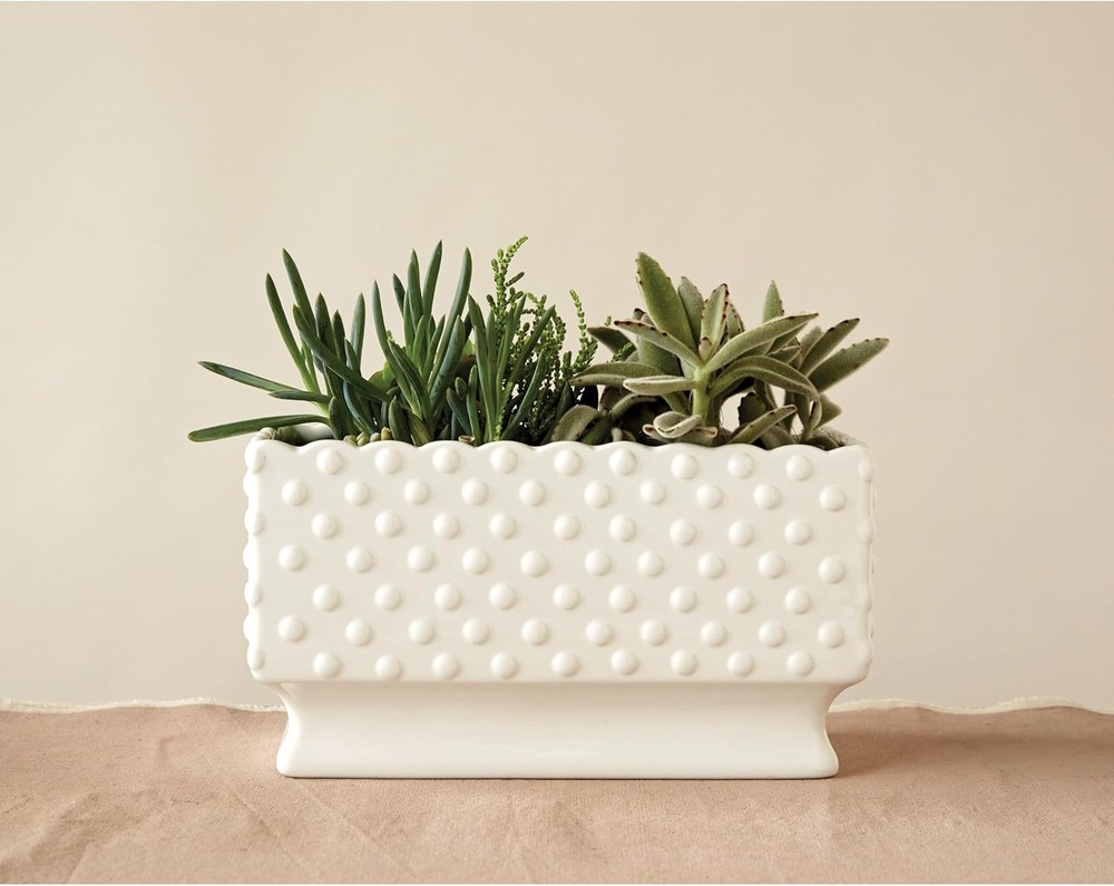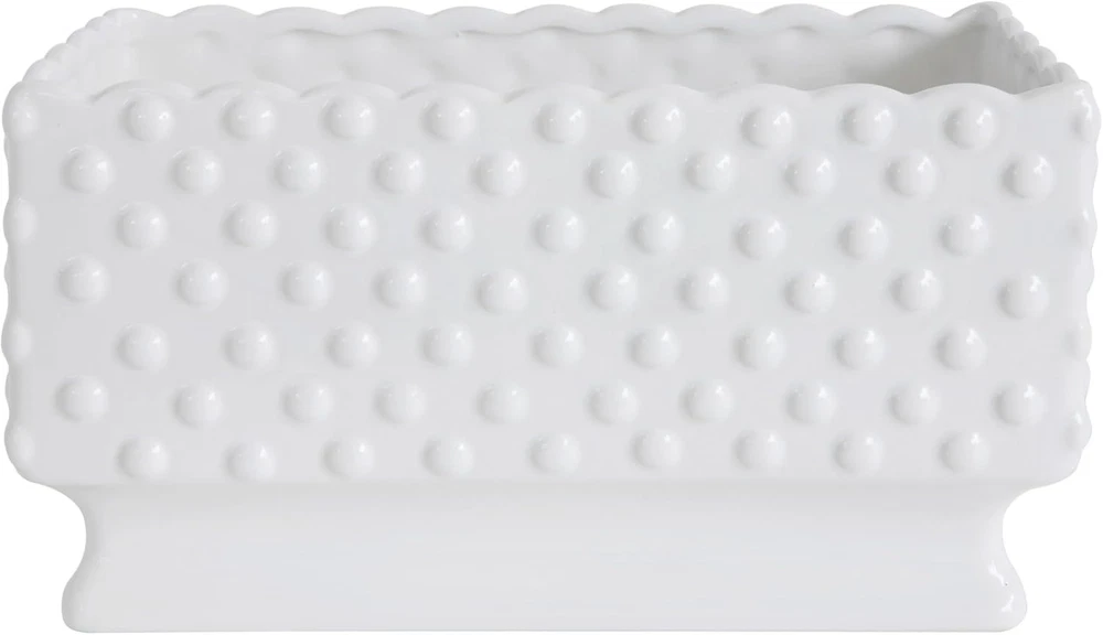 Creative Co-Op White Hobnail Rectangle Ceramic Planter Select Color Product Details Material: Ceramic Color: White Special Feature: Portable Style: Classic Planter Form: Plant Pot Shape: Rectangular Indoor/Outdoor Usage: Indoor Mounting Type: Tabletop Plant or Animal Product Type: Herb Product Dimensions: 5.75"D x 11.25"W x 6"H Brand: Creative Co-Op Number of Pieces: 25 Pattern: Solid Included Components: White Ceramic Hobnail Planter Theme: Vintage Finish Type: Painted Number of Levels: 1 Item Weight: 3 Pounds Item Weight: 3 pounds Manufacturer: Creative Co-Op Country of Origin: China Item model number: DA7206 Finish types: Painted Assembly required: No Batteries required: No A beautiful and elegant ceramic planter with a hobnail texture, a scalloped edge, and polka dots that will add some charm and style to the home Suitable for classic, vintage, or cottage style décor This planter can hold a variety of plants, flowers, or herbs in any room Made of Dolomite The planter measures 11.25 inches long, 5.75 inches wide, and 6 inches tall Add some beauty and elegance to any home with this ceramic hobnail planter with a scalloped edge and polka dots. This lovely planter is white in color and has a hobnail texture that gives it a vintage and cozy look. It also has a scalloped edge and polka dots that add some charm and personality to the planter. The planter can hold any plants, flowers, or herbs of choice, whether it's a rose, a succulent, or a basil. It can be placed on any flat surface, such as a table, shelf, or windowsill, to create a lovely display in any room. Whether adding some color, fragrance, or texture to any home, this ceramic hobnail planter with a scalloped edge and polka dots will surely impress anyone and their guests.
