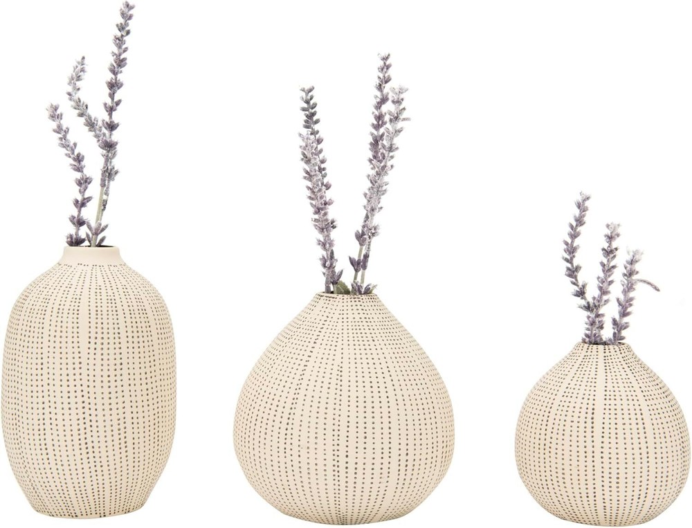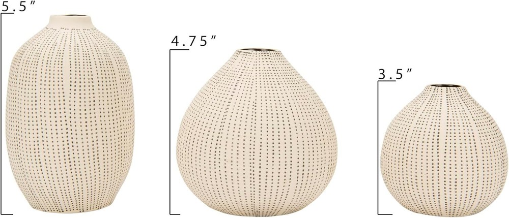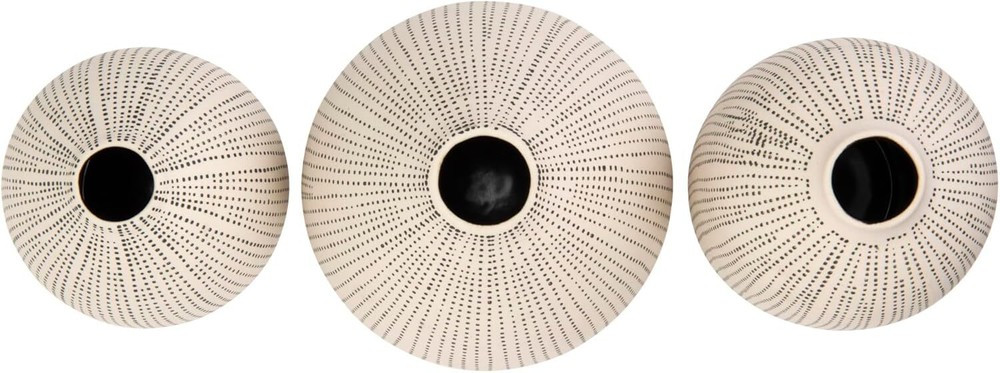 Creative Co-Op White Stoneware Vases with Textured Black Polka Dots (Set of 3 Sizes) Item Description Add some fun and whimsy to the space with these white and black stoneware vases that feature a polka dot finish and a round shape These vases are suitable for any modern, eclectic, or retro style home décor Best used for displaying dried or artificial flowers Made of stoneware The vases come in a set of 3, and they have different sizes › See more product details A lovely and playful way to display flowers or enhance any space, these white and black stoneware vases with polka dot finish have a round shape and a slightly tapered rim that adds some elegance and charm. The vases are crafted from premium stoneware that has a smooth and glossy finish. The vases have a polka dot finish that is applied on the surface of the vases and creates a stunning visual effect. They can also be used as decorative accents on their own or in a group. The small vase measures 3.5 inches round, and 3.5 inches in height. The medium vase measures 4.75 inches round, and 4.5 inches in height. The large vase measures 3.5 inches round, and 5.5 inches in height. The opening diameter of the vases are 0.86 inch, 0.95 inch, and 1 inch respectively. They can be placed on tables, shelves, mantels, or floors. They can also be used as a gift for friends or family who love flowers and design. Whether used indoors or outdoors, these white and black stoneware vases with polka dot finish add some personality and beauty to any space. Payment fast and free shipping Shipping safe payment via ebay . Return 30 Day's returns