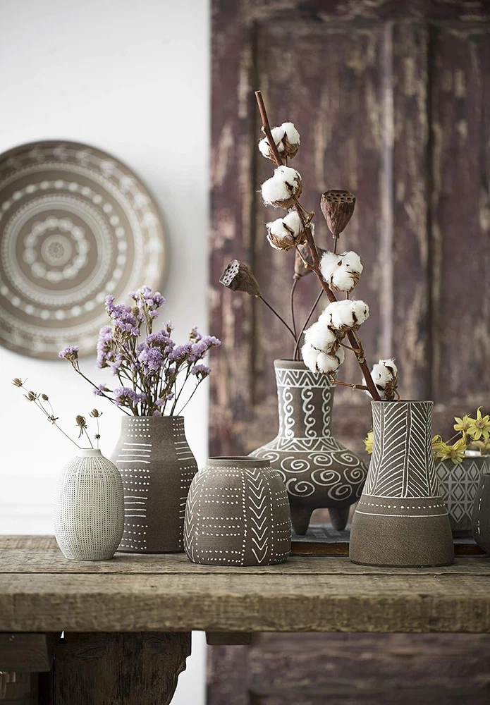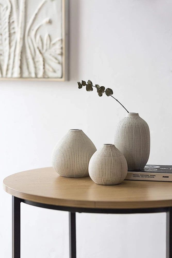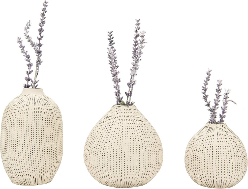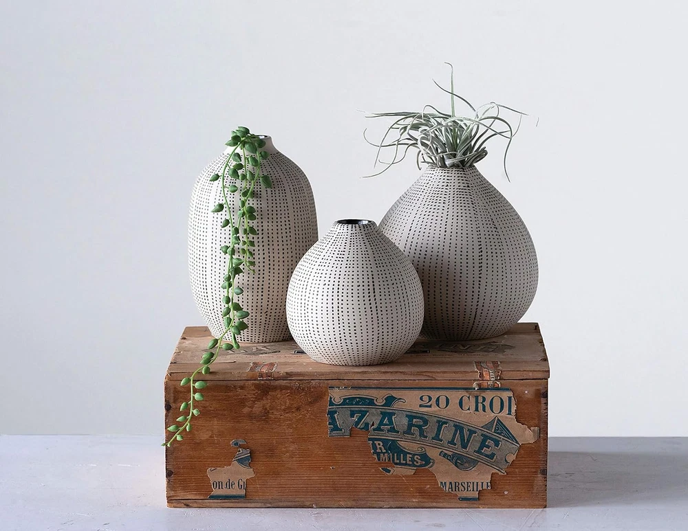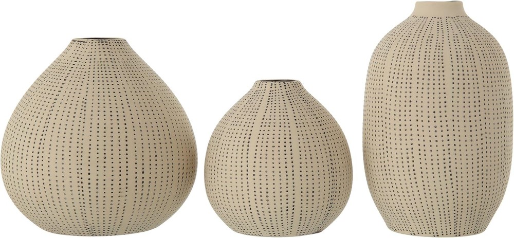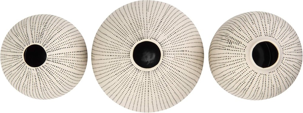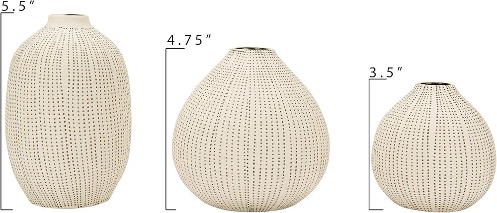 Creative Co-Op White Stoneware Vases with Textured Black Polka Dots Product Details Material: Stoneware Color: White Brand: Creative Co-Op Product Dimensions: 4.75"L x 4.75"W x 5.5"H Shape: Round Style: Vase Set Special Feature: Watertight Pattern: Polka Dots Theme: Flowers Recommended Uses For Product: Decoration Room Type: Bathroom, Living Room, Bedroom Number of Pieces: 3 Occasion: Women, Mother's Day, Wedding, Graduation Item Weight: 0.95 Pounds Installation Type: Countertop UPC: 191009202479 Global Trade Identification Number: 00191009202479 Manufacturer: Creative Co-Op Item Weight: 15.1 ounces Country of Origin: China Item model number: DF0842 Batteries required: No Add some fun and whimsy to the space with these white and black stoneware vases that feature a polka dot finish and a round shape These vases are suitable for any modern, eclectic, or retro style home décor Best used for displaying dried or artificial flowers Made of stoneware The vases come in a set of 3, and they have different sizes A lovely and playful way to display flowers or enhance any space, these white and black stoneware vases with polka dot finish have a round shape and a slightly tapered rim that adds some elegance and charm. The vases are crafted from premium stoneware that has a smooth and glossy finish. The vases have a polka dot finish that is applied on the surface of the vases and creates a stunning visual effect. They can also be used as decorative accents on their own or in a group. The small vase measures 3.5 inches round, and 3.5 inches in height. The medium vase measures 4.75 inches round, and 4.5 inches in height. The large vase measures 3.5 inches round, and 5.5 inches in height. The opening diameter of the vases are 0.86 inch, 0.95 inch, and 1 inch respectively. They can be placed on tables, shelves, mantels, or floors. They can also be used as a gift for friends or family who love flowers and design. Whether used indoors or outdoors, these white and black stoneware vases with polka dot finish add some personality and beauty to any space.