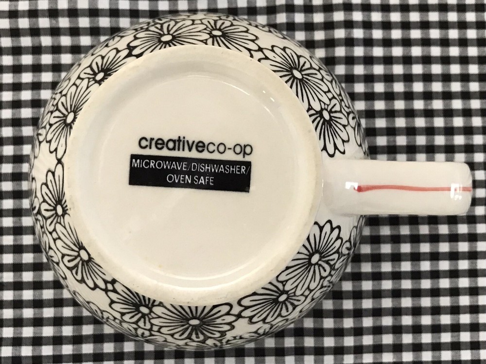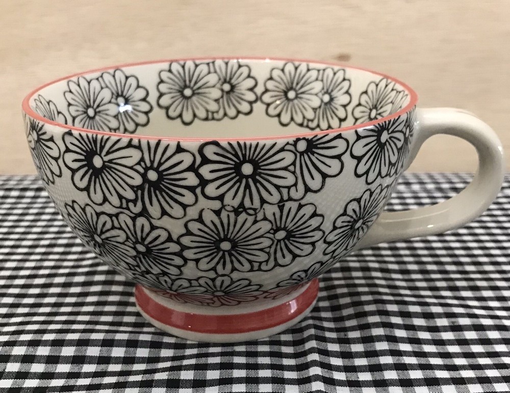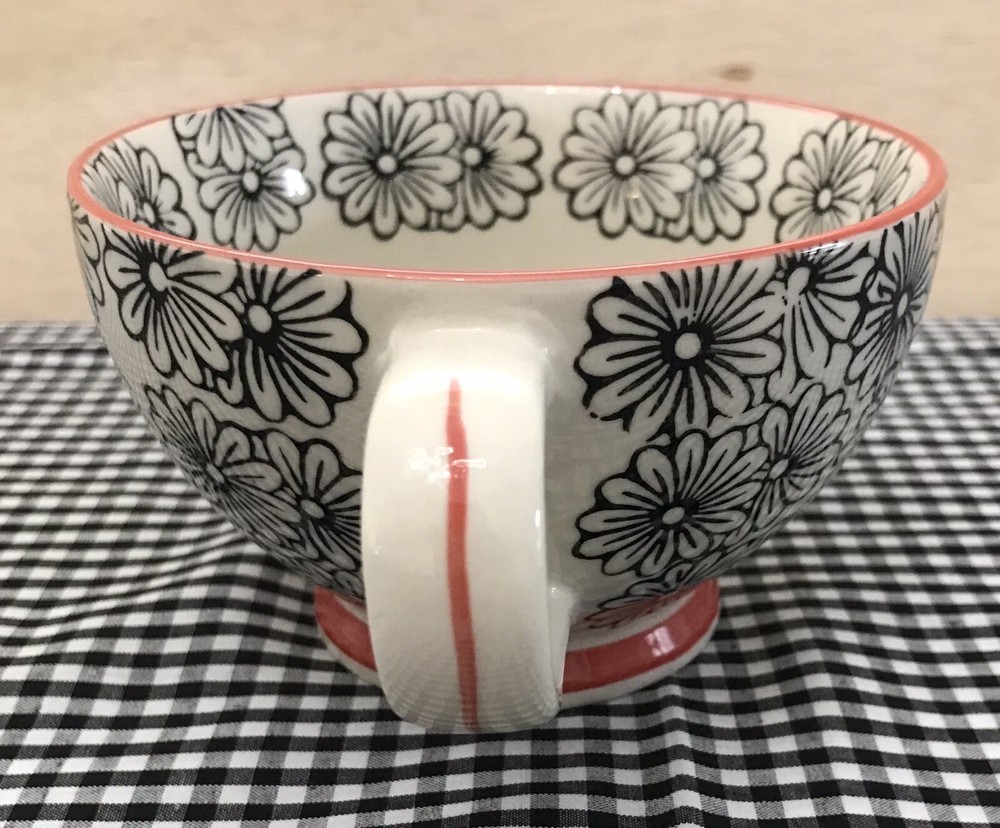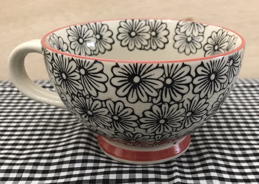 Very cool mug with graphic design Black flowers with dark orange accents comfortable handle grip Micro dishwasher and oven safe Nice and large Very good condition No chips or cracks Footed design See pictures Packaged with extreme care