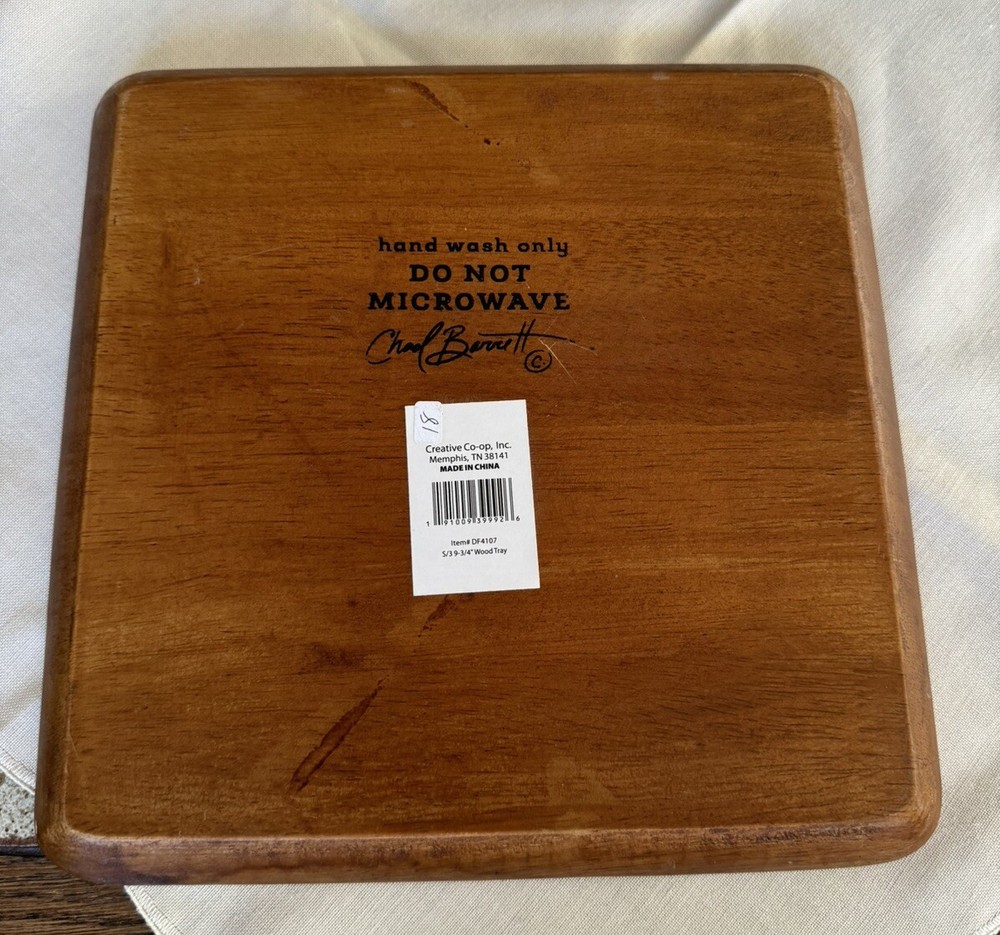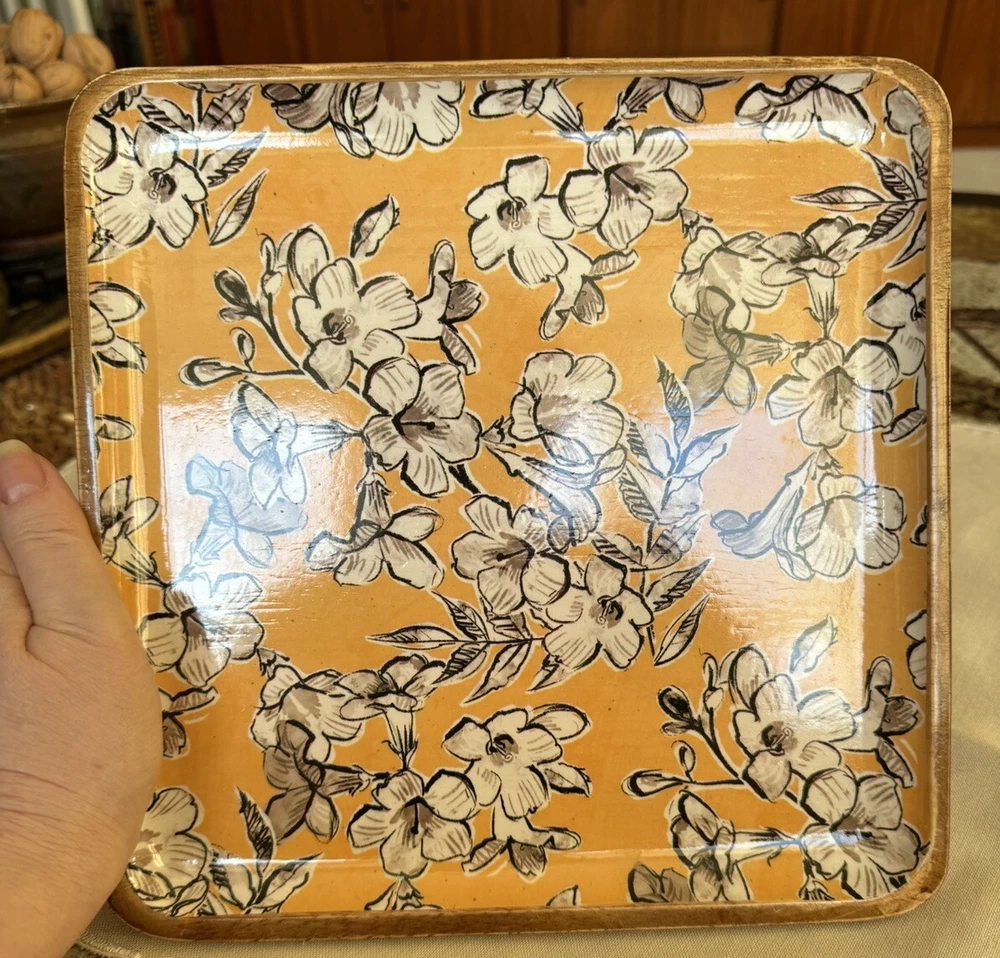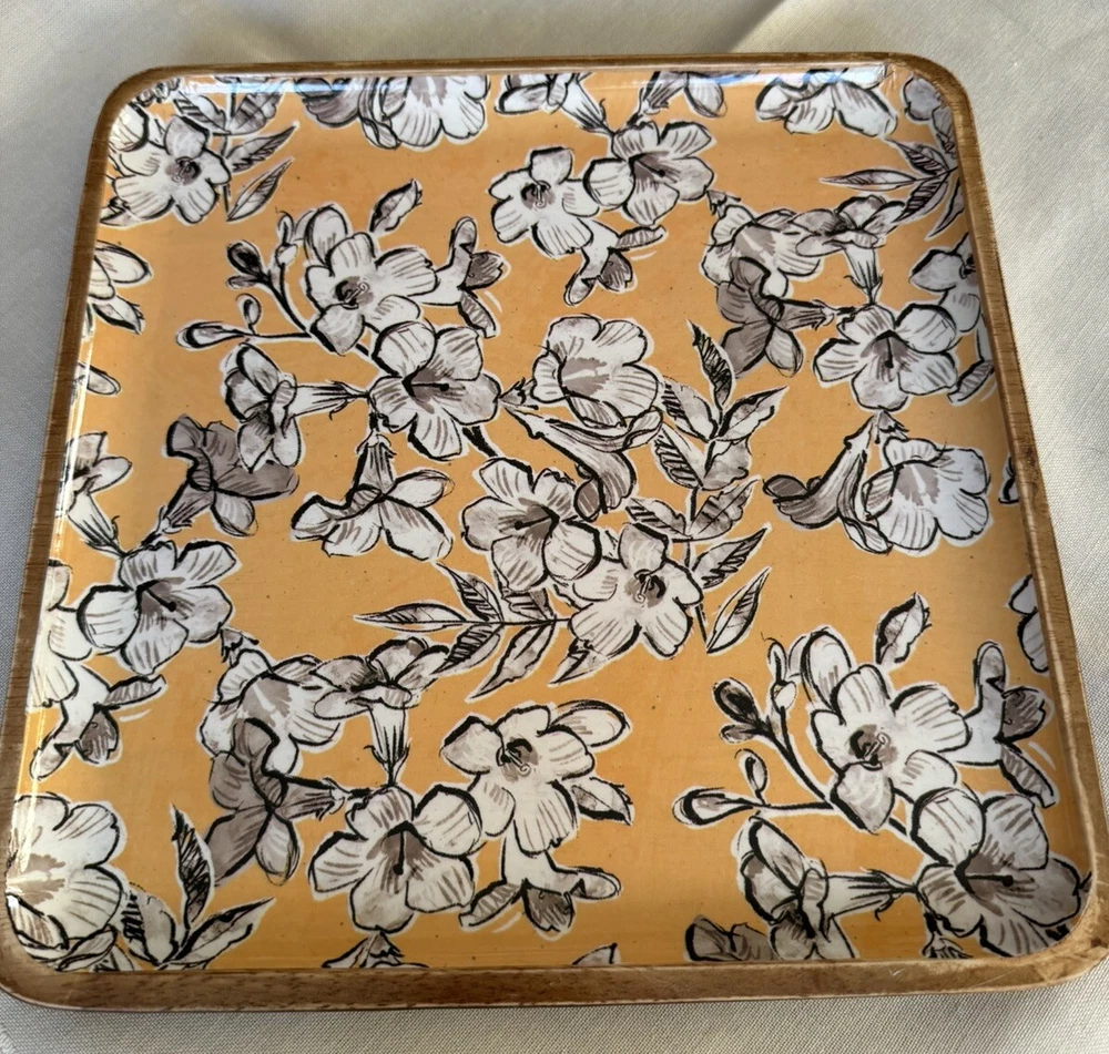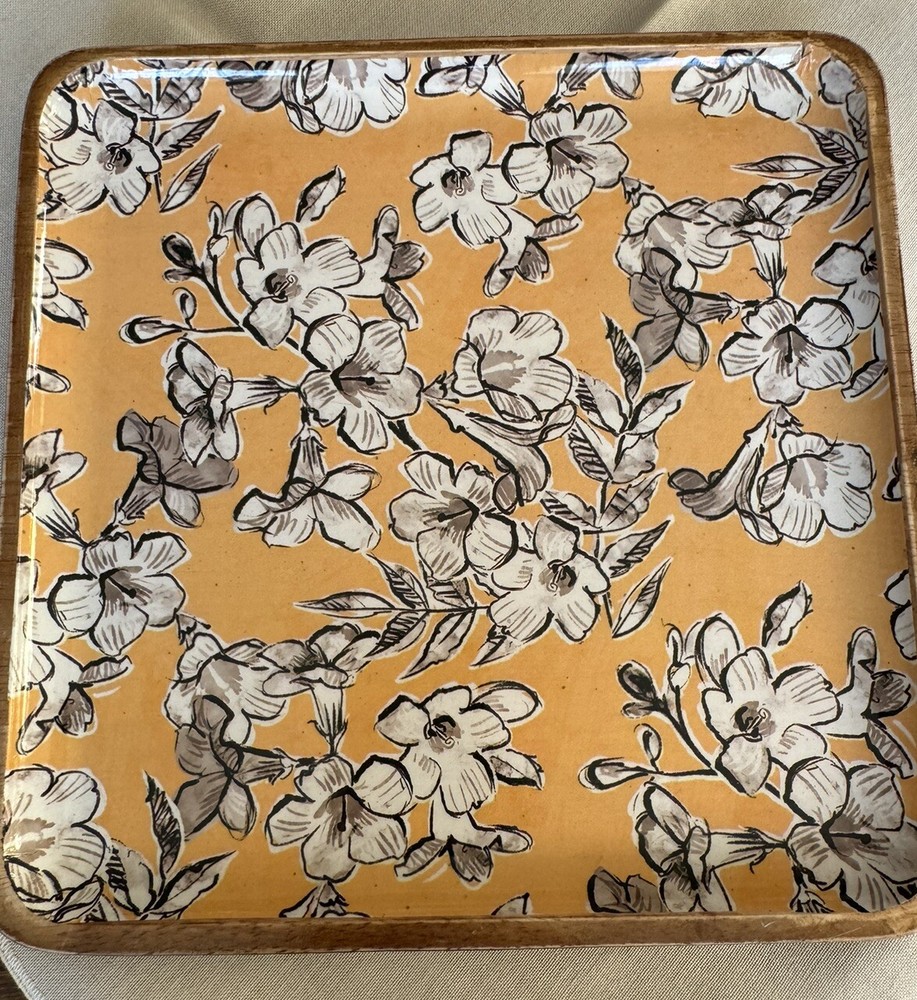 This Creative Co-Op wood tray is a beautiful addition to any home decor. The tray is square in shape and has a medium brown wood tone with a yellow color and white flower design. It measures 9.75 inches in both length and width, making it the perfect size for displaying decorative items or serving food and drinks. The tray is made of high-quality wood and features a unique design that is both elegant and stylish. It is perfect for use in the kitchen, dining room, or living room, and can be used to serve guests or display decorative items. This tray is a must-have for anyone who wants to add a touch of sophistication to their home decor. Lovely item! Please see all photos for details! Thank you for checking it out and please visit our store for more great and unique finds!