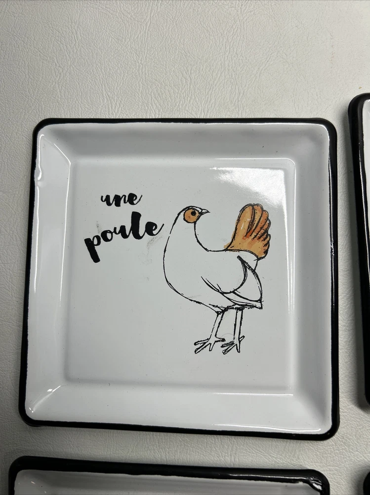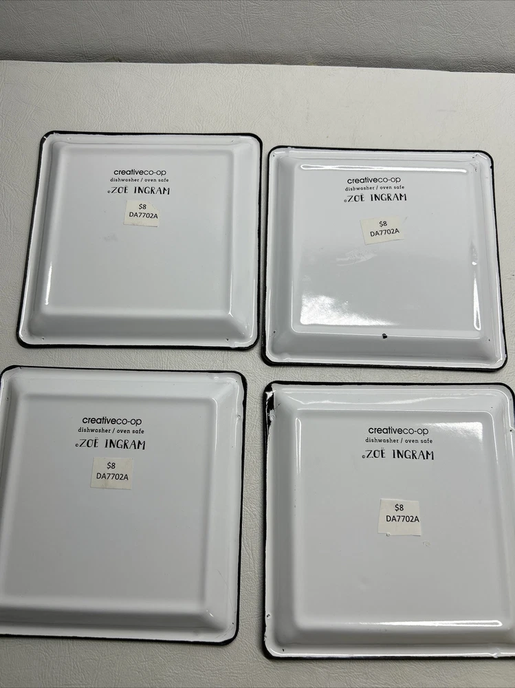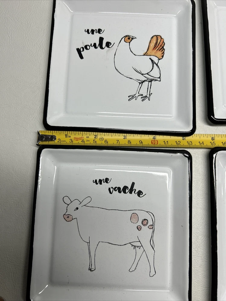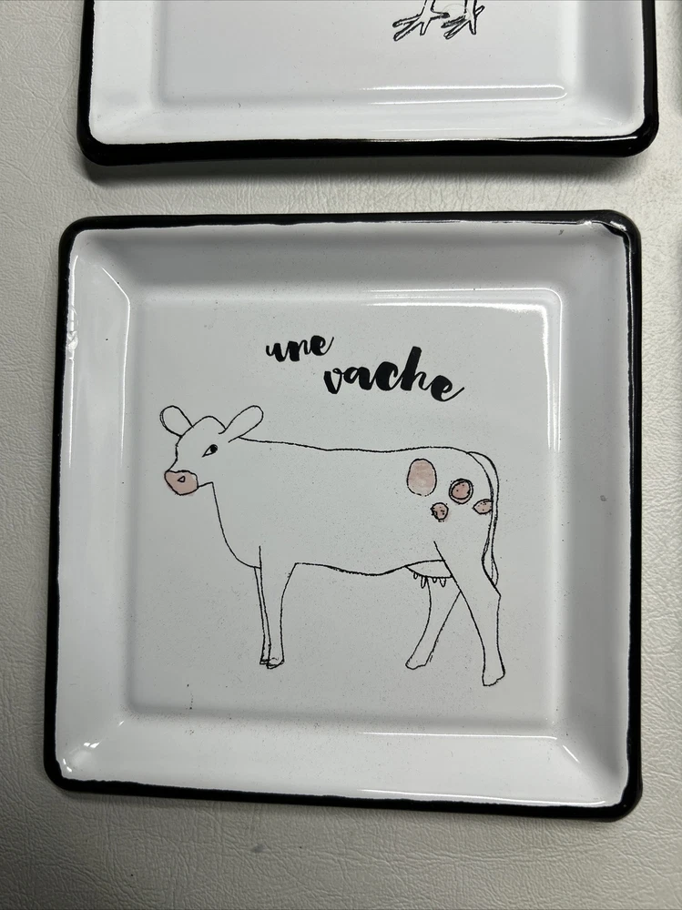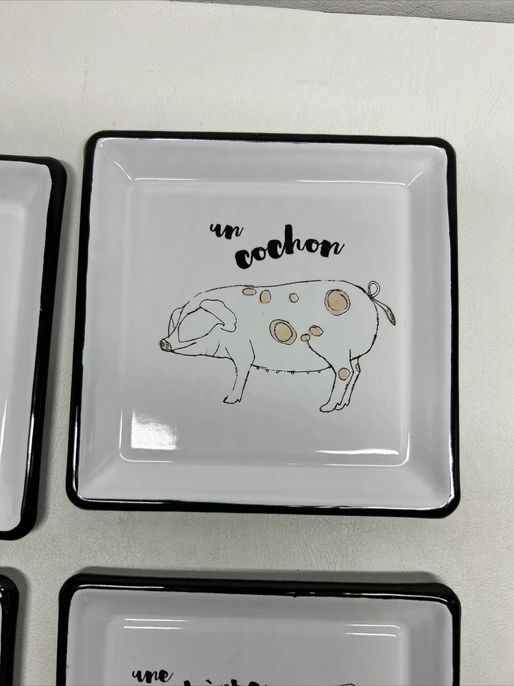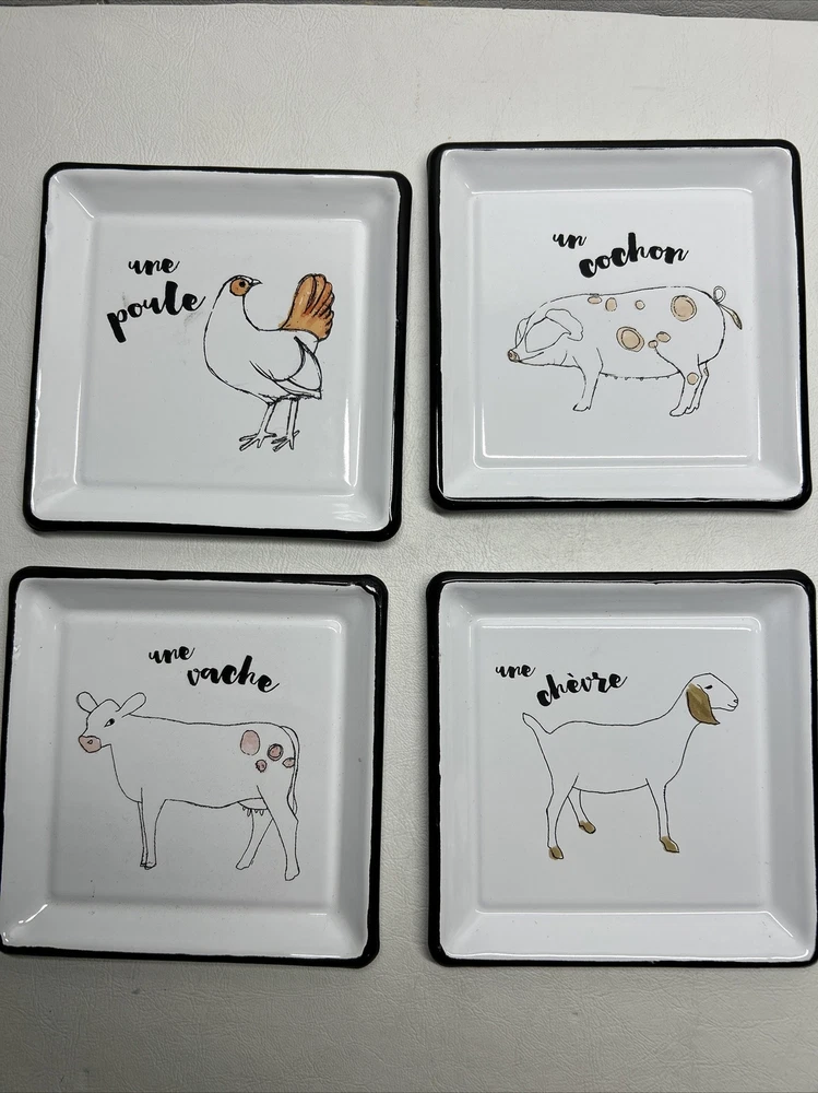 Add a touch of farmhouse charm with this four-piece Creative Co-Op Zoe Ingram Square Cheese Tins set featuring rustic farm animal patterns. The square ceramic and metal tray has one compartment, measuring 4” in length and width. Perfect for all occasions, this tray is ideal for serving cheese and other hors d'oeuvres. The white tray is dishwasher safe and has a shiny finish. Ideal for teens, adults, and kids, this tray set is a great addition to any kitchen, dining, or bar area. Get ready for your next gathering with this delightful farm animal-themed tray set.