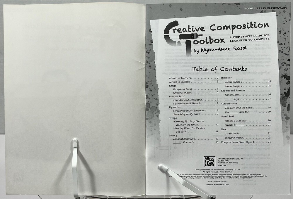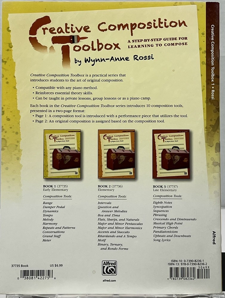 Unleash your creativity with Wynn-Anne Rossi's Creative Composition Toolbox, Book 1. Get the chance to hone your composition skills with the help of this activity book that's perfect for young adults, ages 9-12, and adults alike. Discover a wide range of topics, including instruction and study on composition, musical instruments, and piano and keyboard, through its illustrated pages that provide a comprehensive guide to composing your music masterpiece. With 24 pages of fun and educational activities, this book will surely bring out the composer in you. FODDER & SUNS Thank you for visiting our store! Please be assured that we clean and inspect every item available to the best of our ability. Any defects or special features are noted either in pictures and/or the listing condition. We offer returns on most items except those that are for parts or repairs. Please review the listing carefully and ask any questions before purchase. Follow our store for new items added daily as well as special offers and coupons! We appreciate your business. Thanks for looking!