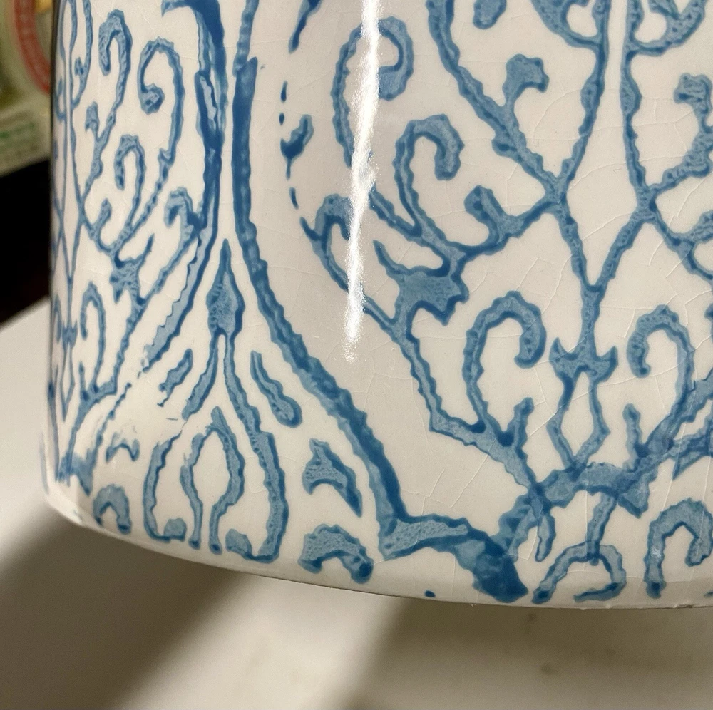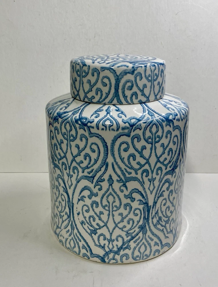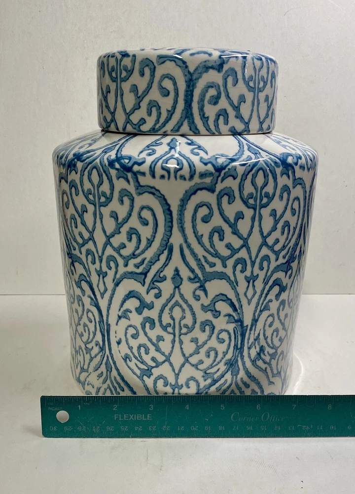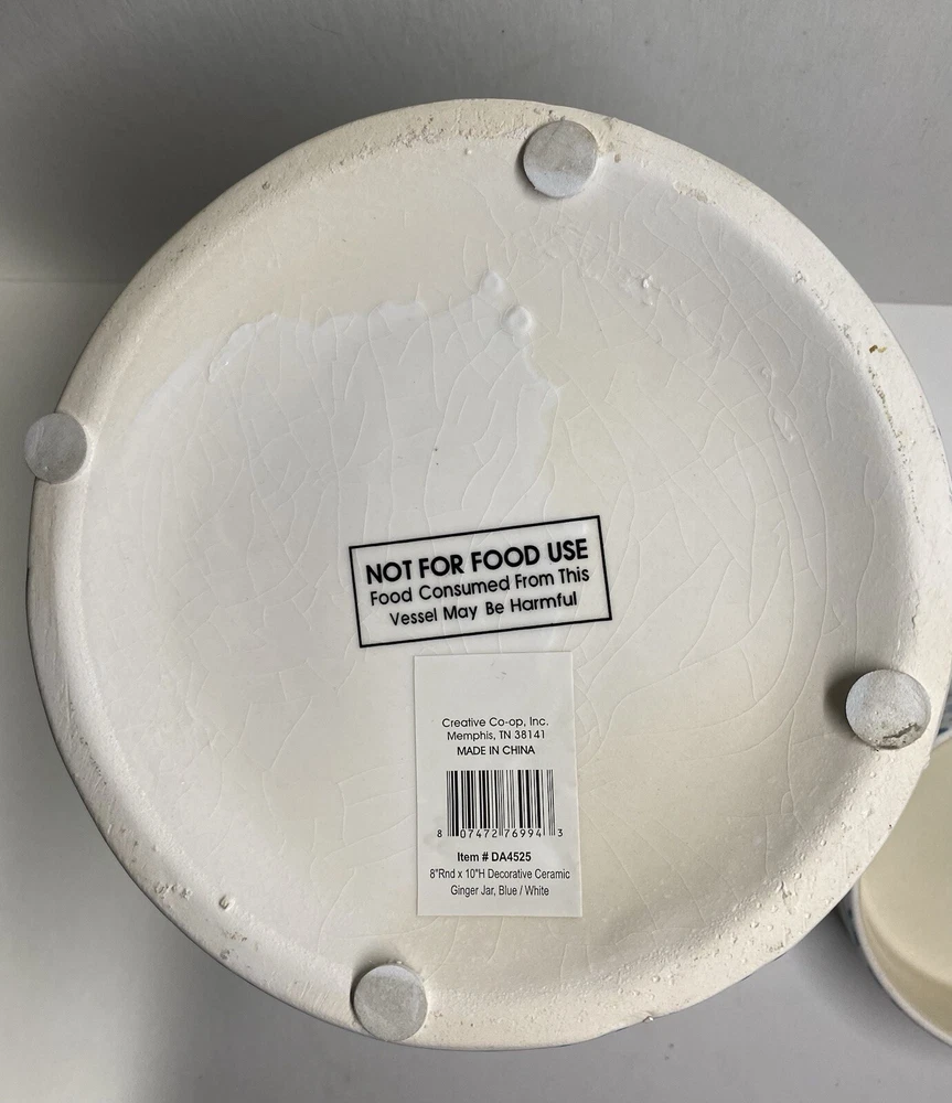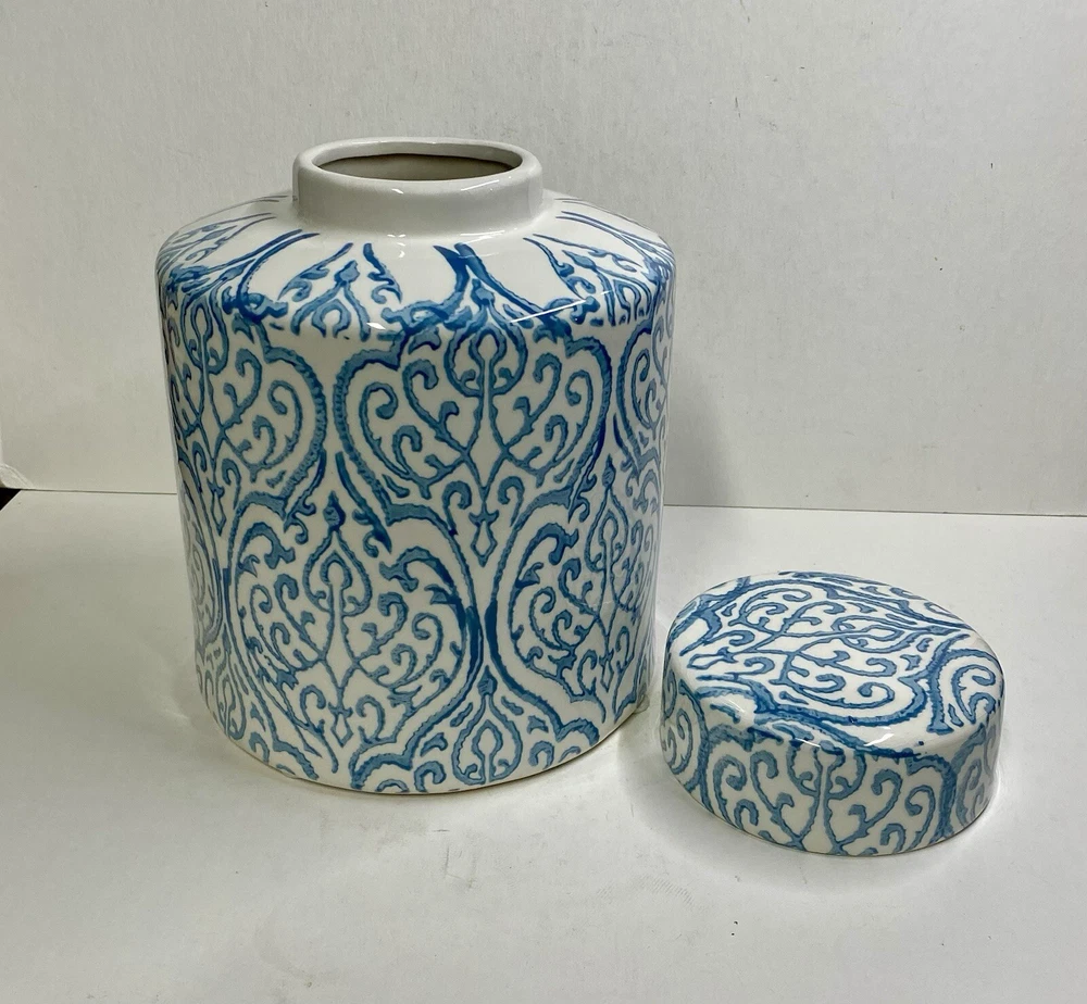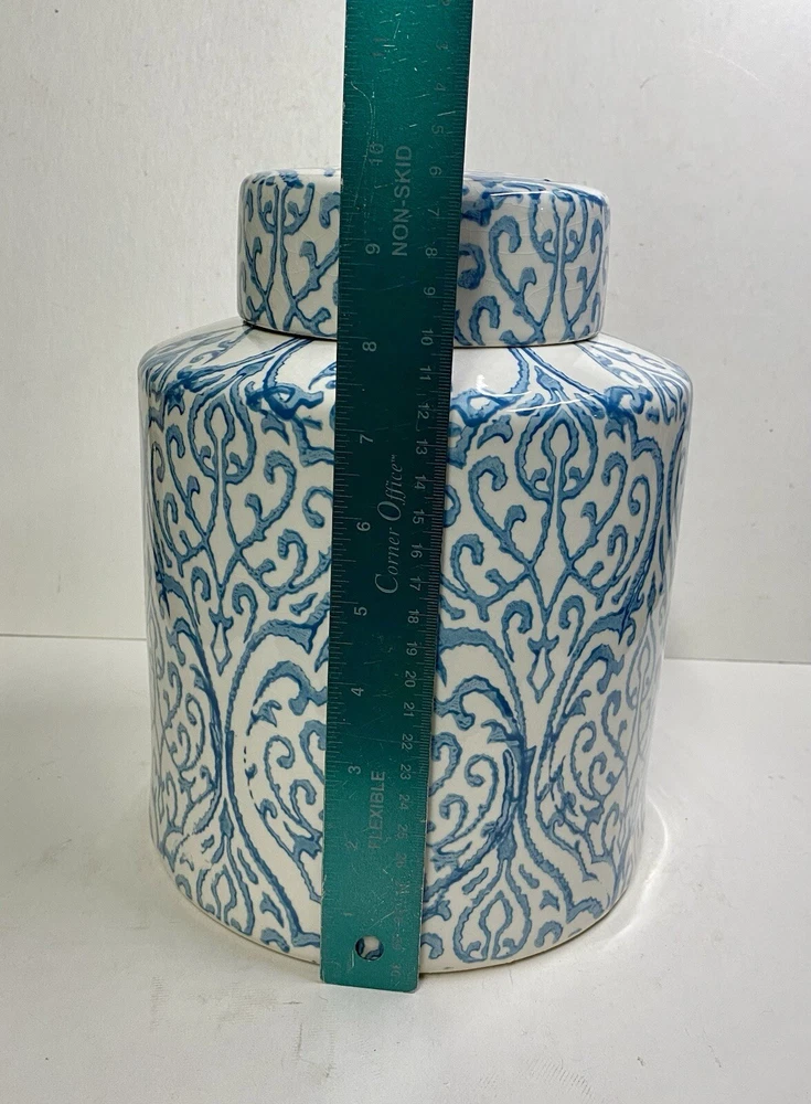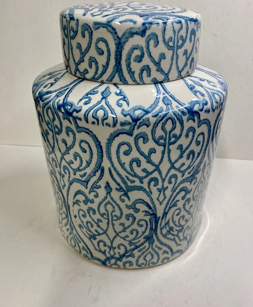 This Creative Co-op jumbo ginger jar is a beautiful addition to any collection. The decorative piece features a stunning country blue and white abstract design, making it a unique and eye-catching item. With a weight of 5.8 lbs, it is easy to move and display in any desired location. Height with lid on 10.5” Top opening diameter 3.5” Mid diameter 8.0” The jar was manufactured in China and has a model number of DA4525. The jar is perfect for storing multiple different items or simply as a decorative piece. Multipurpose ceramic piece of art Add this gorgeous ginger jar to your collection today! Does have some faint crazing, more so towards the bottom and the lid. See photos Lid is a set on, loose fitting