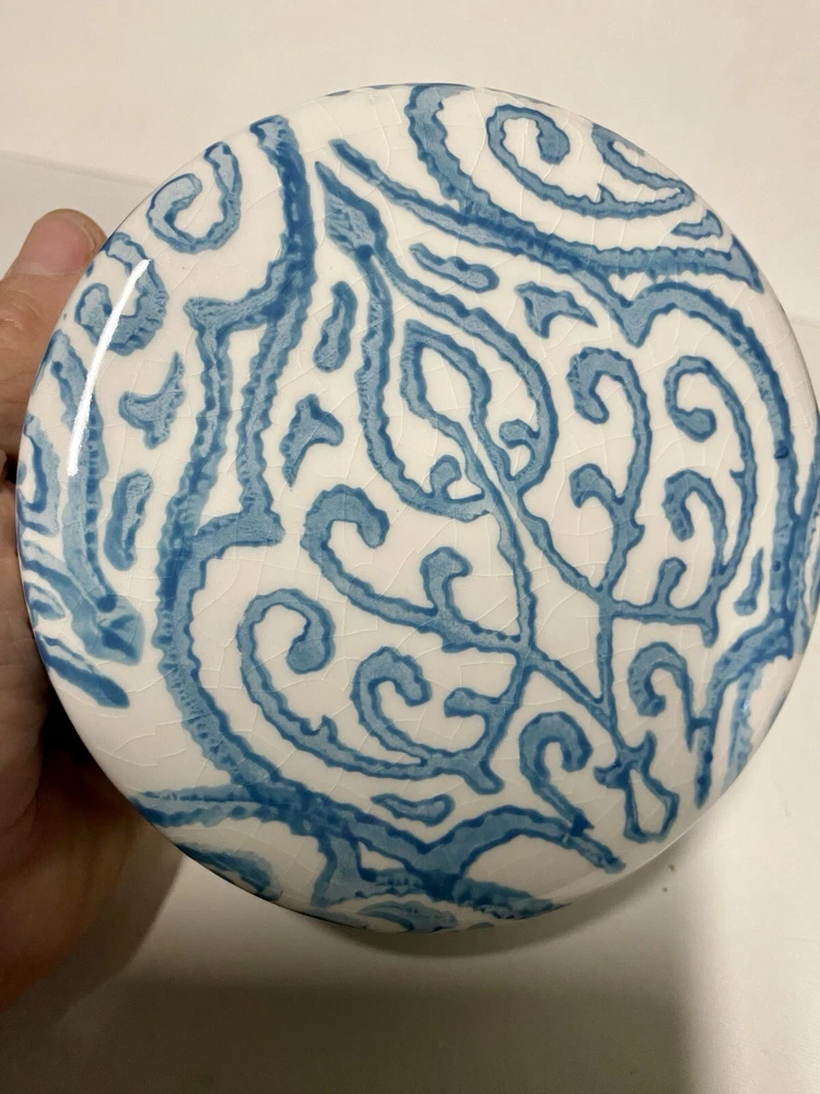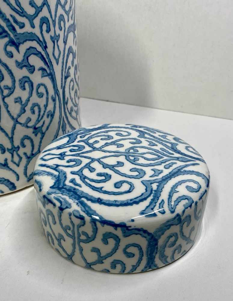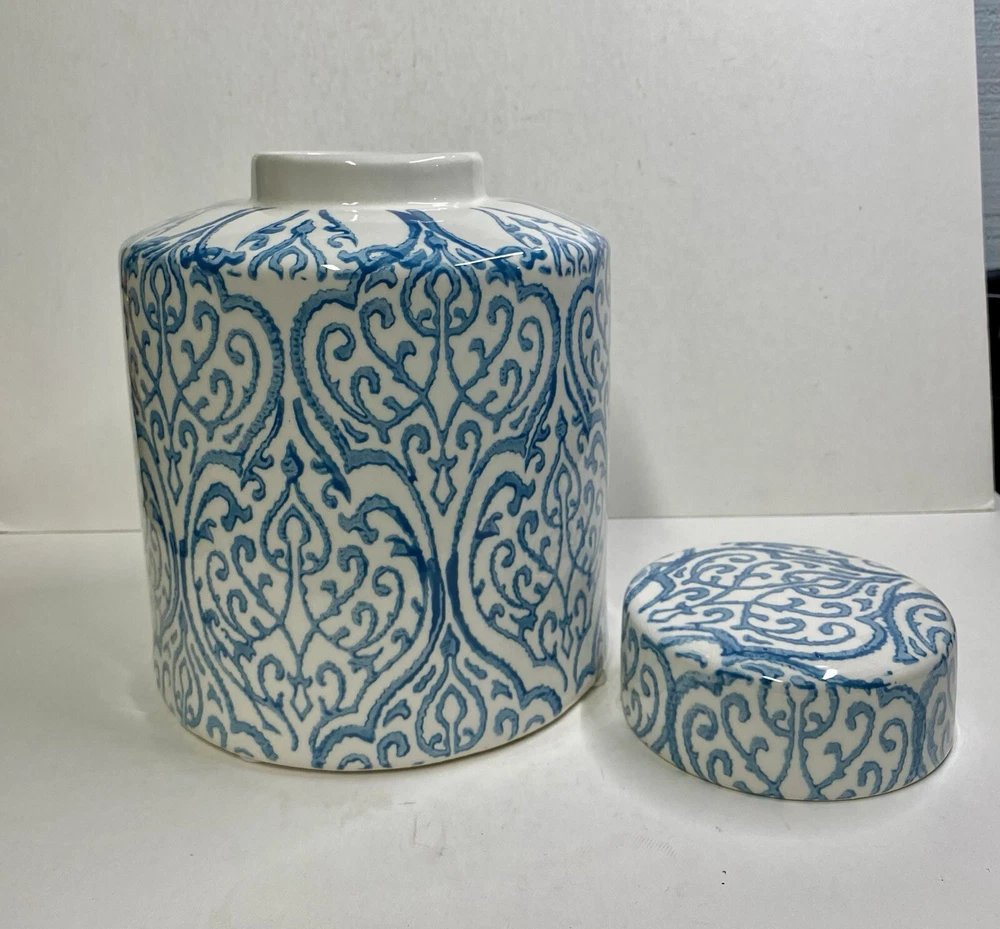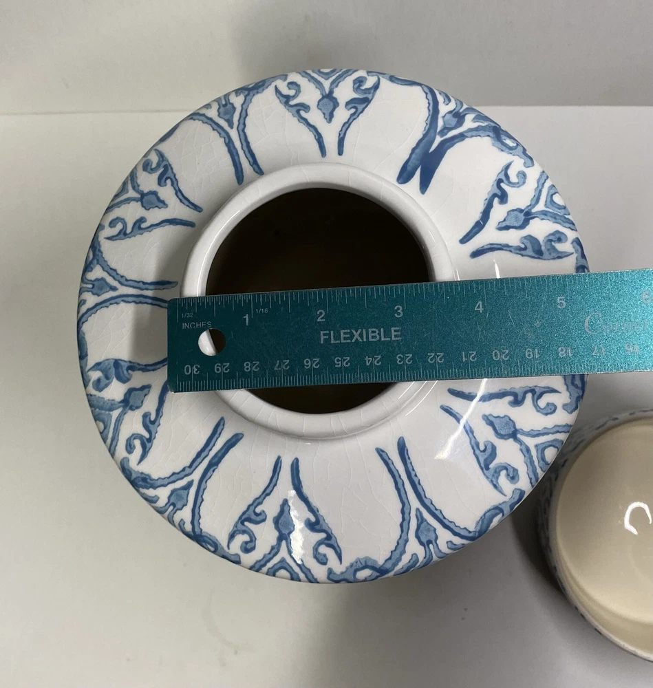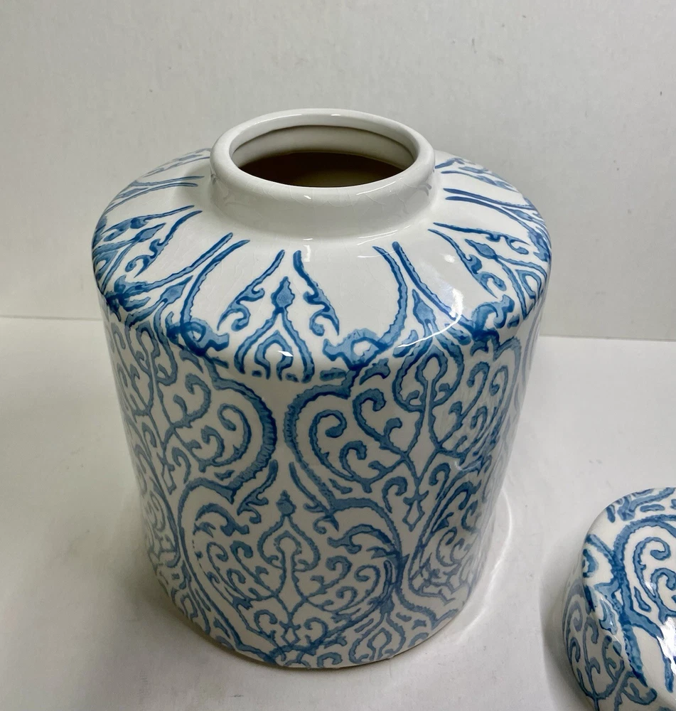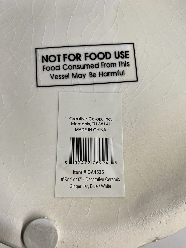 This Creative Co-op jumbo ginger jar is a beautiful addition to any collection. The decorative piece features a stunning country blue and white abstract design, making it a unique and eye-catching item. With a weight of 5.8 lbs, it is easy to move and display in any desired location. Height with lid on 10.5” Top opening diameter 3.5” Mid diameter 8.0” The jar was manufactured in China and has a model number of DA4525. The jar is perfect for storing multiple different items or simply as a decorative piece. Multipurpose ceramic piece of art Add this gorgeous ginger jar to your collection today! Does have some faint crazing, more so towards the bottom and the lid. See photos Lid is a set on, loose fitting