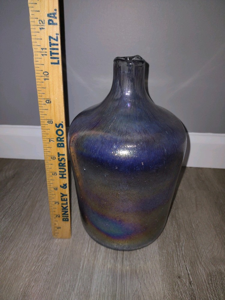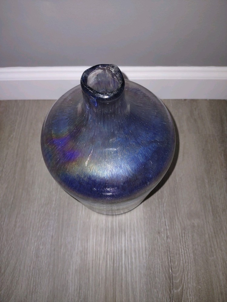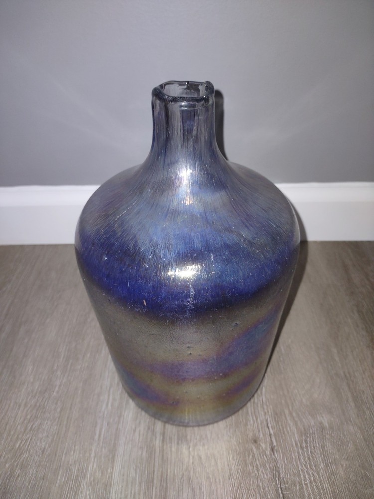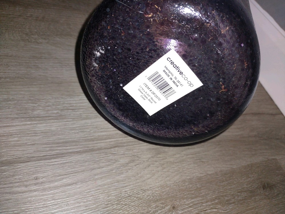 This Creative Co-Op vase is a stunning addition to any home decor. The 11" tall glass vase has a beautiful purple iridescent color that is sure to catch the eye of anyone who sees it. The vase is perfect for displaying flowers or other decorative items, and its unique design makes it a great conversation starter. Made from high-quality glass, this vase is durable and will last for years to come. It is a must-have for anyone looking to add a touch of elegance to their home. Measures 11" tall x 5.5" diameter, top opening measures 1.25" wide