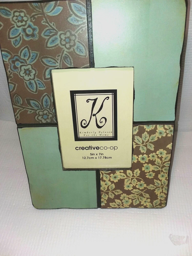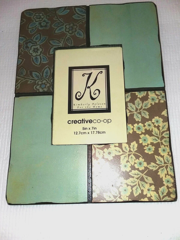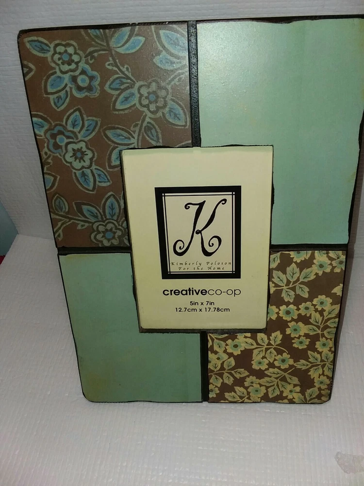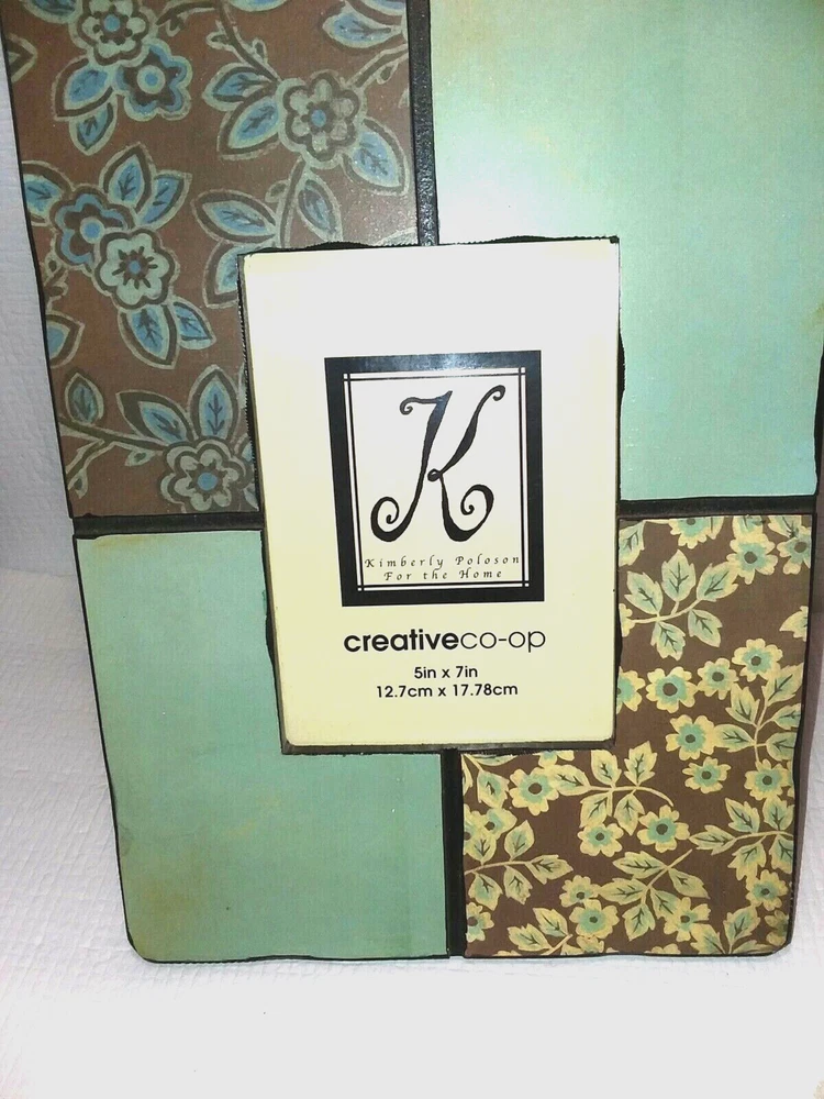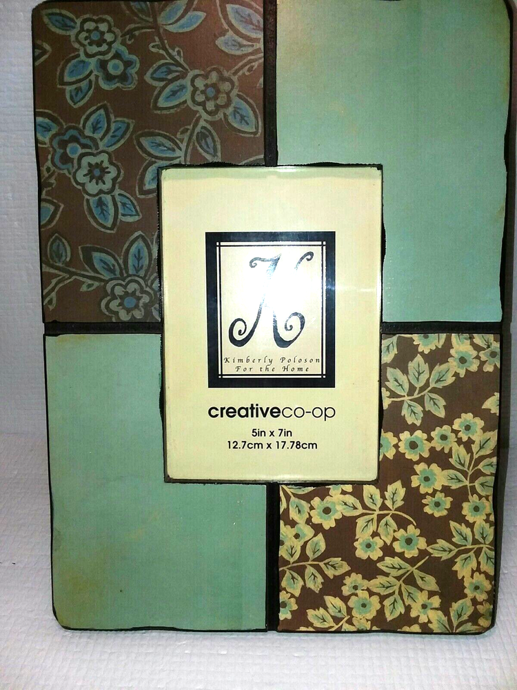 Creative Co-op 2009 Kimberly Poloson Decorative Picture Frame For 5X7 Photo. Aqua and brown base color with blue and cream floral pattern.Condition is Open Box Never Used. Shipped with USPS Priority Mail.