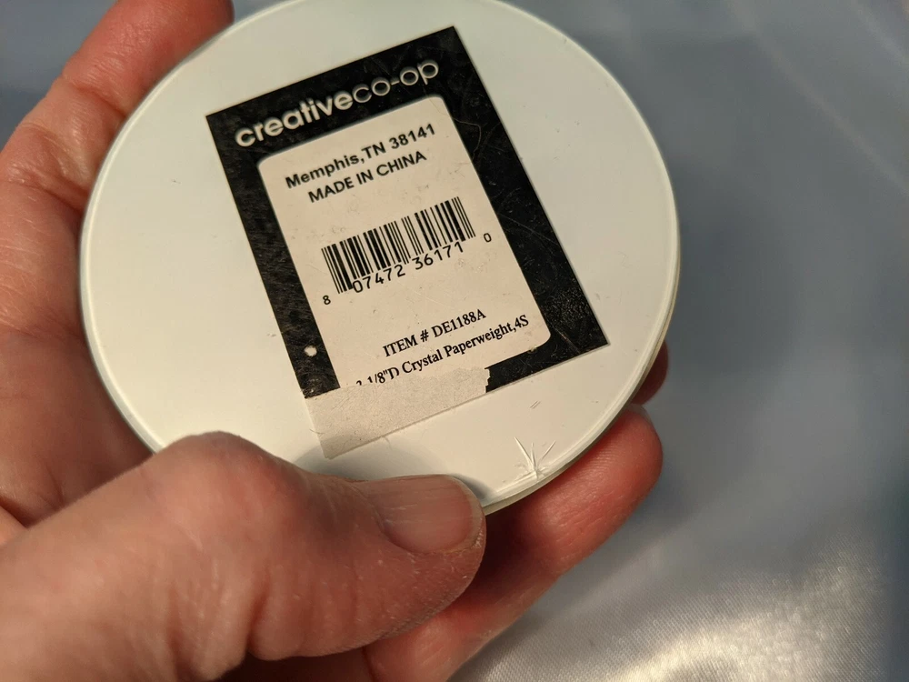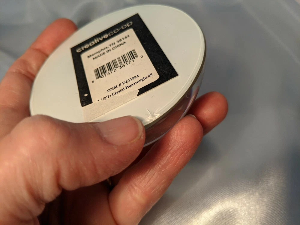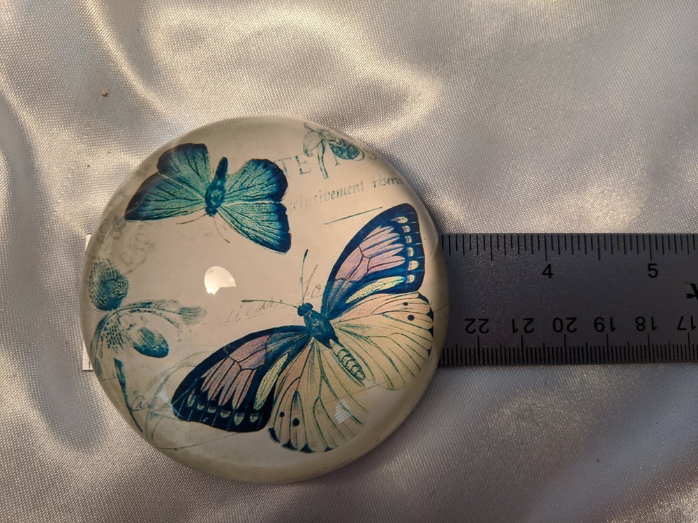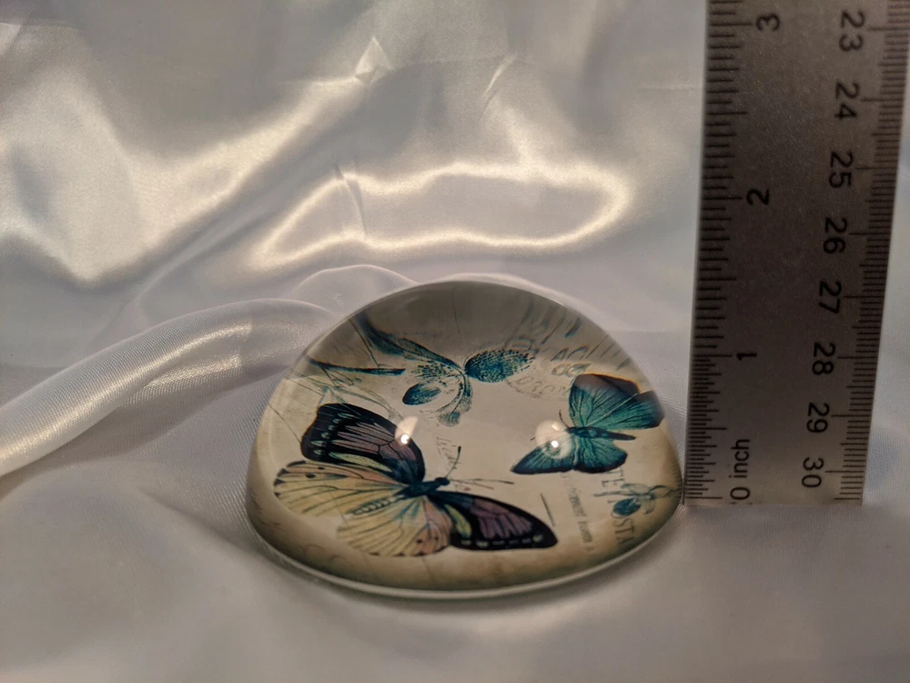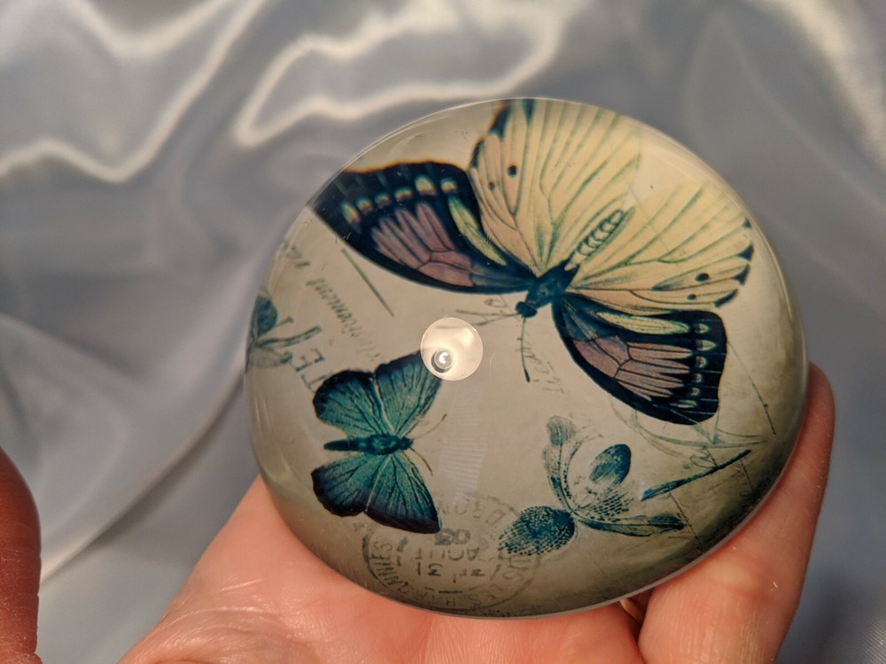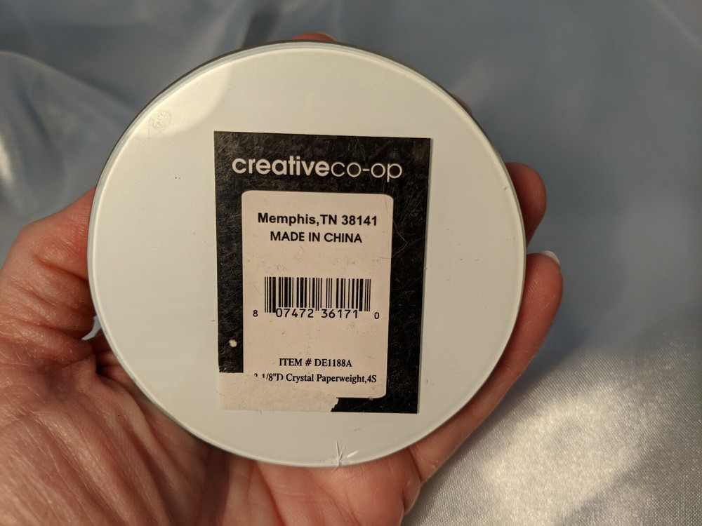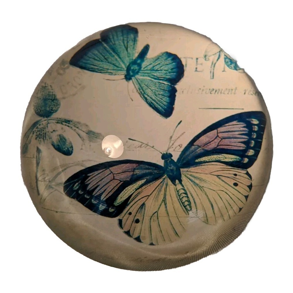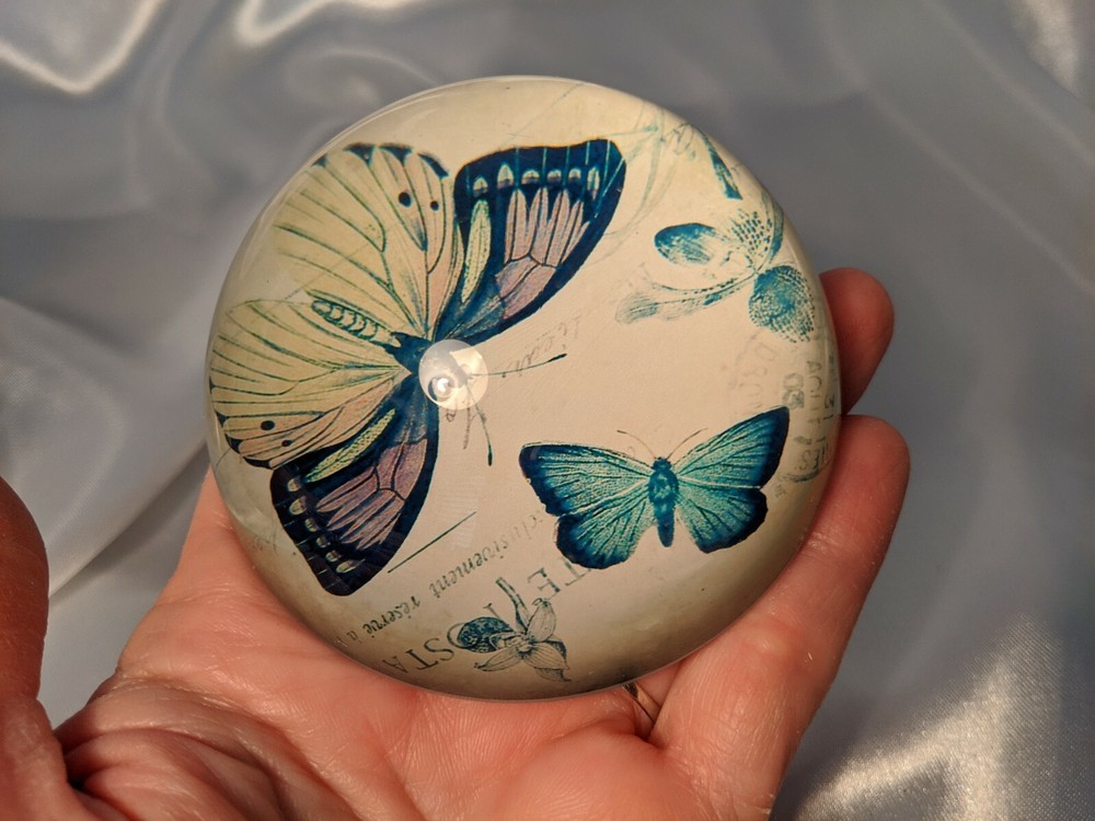 Creative Co-op 3-1/8"D Crystal Glass Paperweight Butterflies Purple Yellow Blue. Condition is used and very nice with just a tiny looks like a place where it was perhaps dropped on the bottom, but it cannot be felt at all and does not extend into the top of the paperweight. Please review all photos before purchase as there are no returns. Shipped with USPS Ground Advantage.