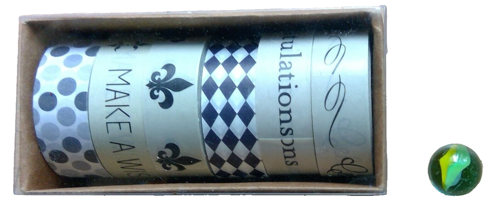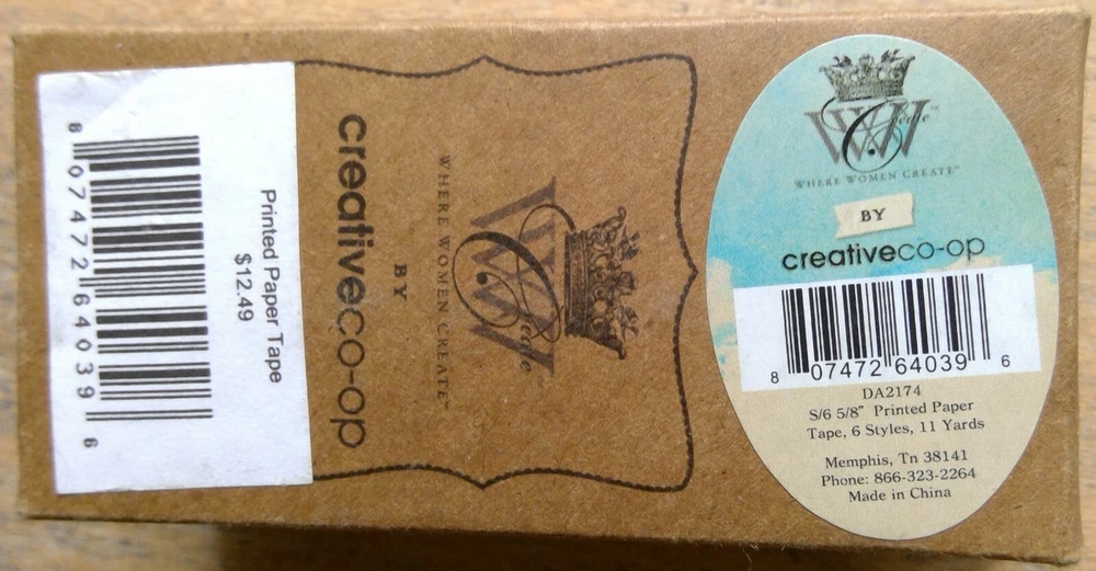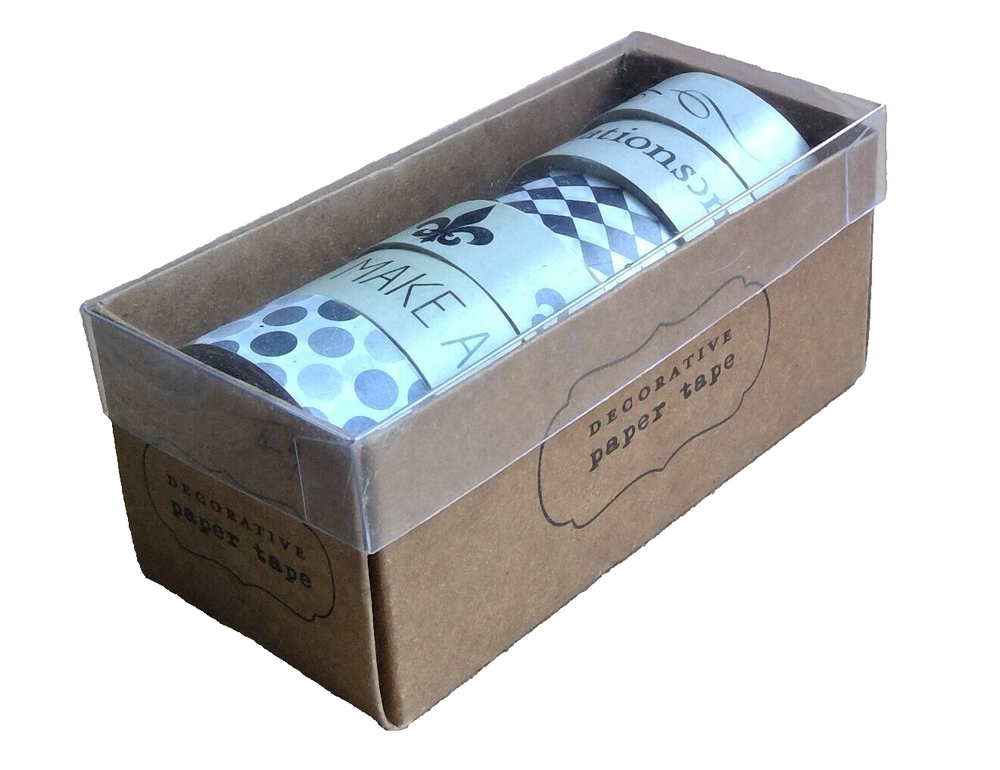 Where Women Create by Creative Co-op decorative paper tape. The package includes 6 rolls of white tape with black print. Printed on the rolls are script 'Celebrate', 'Congratulations', dots, 'Make A Wish', diamonds, and fleur de lis. Pre-owned in original packaging; appear unused. Please email questions. Thank you for your interest. We do combine shipping. Have a great day!