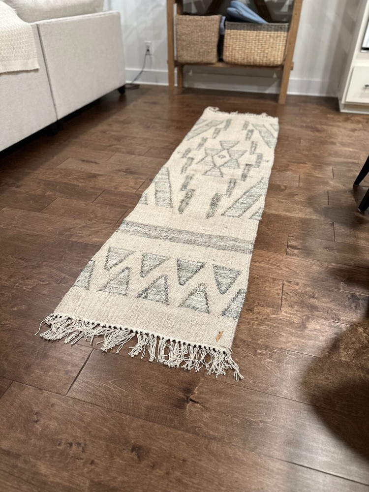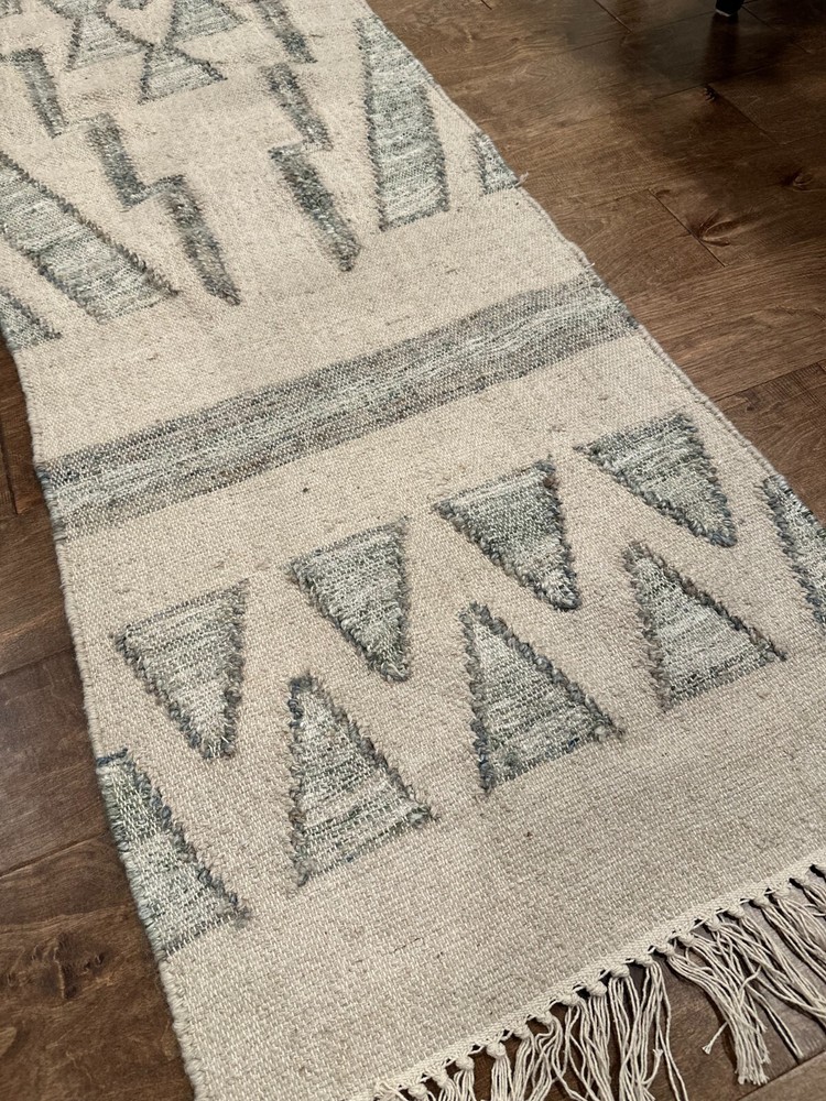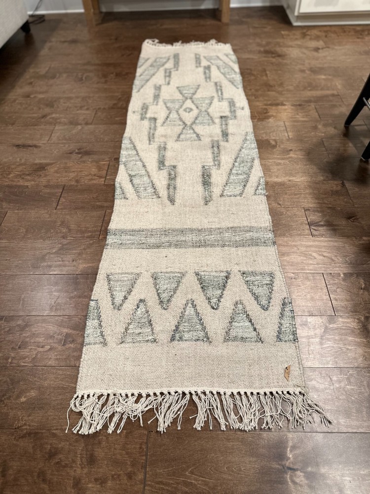 Creative Co-op Wool Blend Runner Area Rug NEW Smoke and pet free home MSRP: $149 Wool blend Spot clean Kilim runner with geometric design Soft colors including off white, oatmeal and blues Perfect for modern farmhouse, vintage and coastal decor with its soft hues Fringe detail Measures 8' X 2' Please ask ANY questions prior to buying all sales are final Have a good day :)