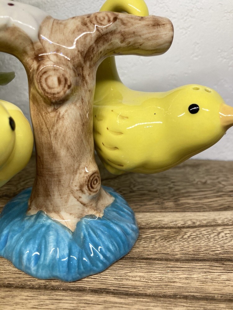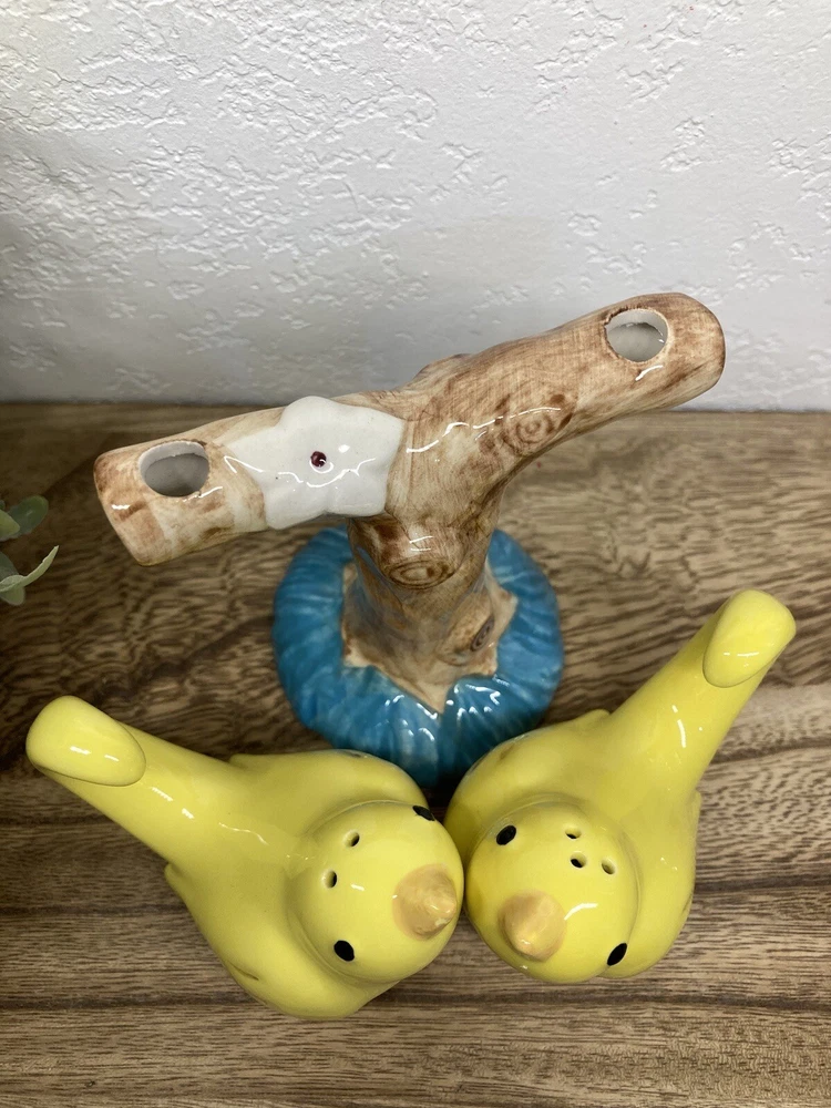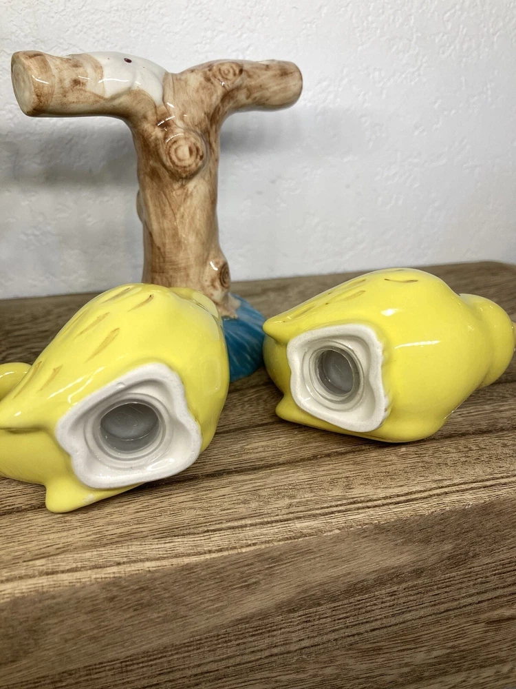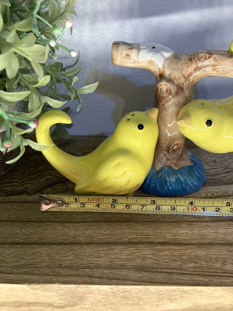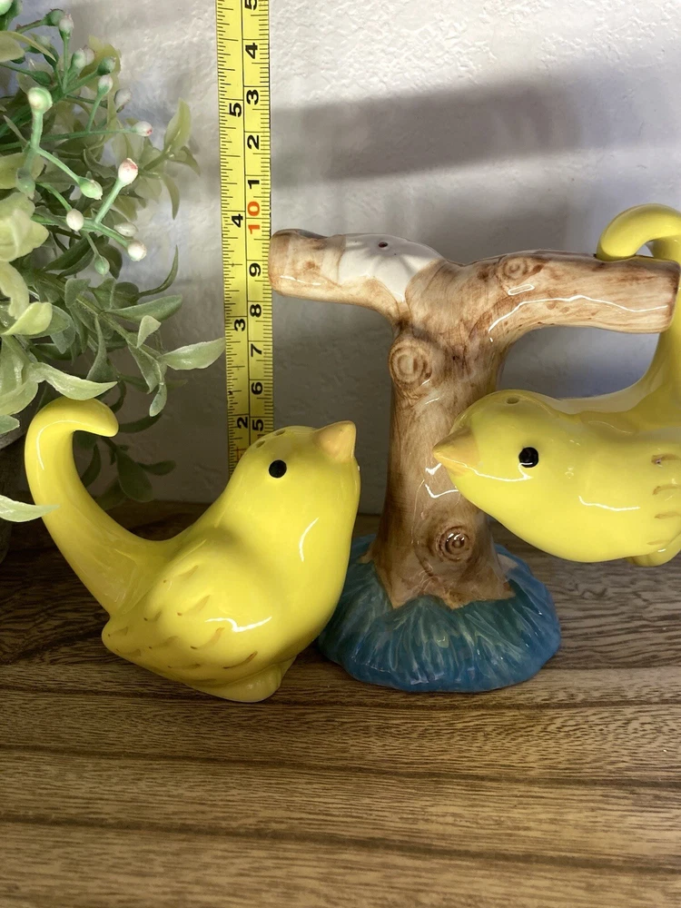 No chips or cracks. 3 piece set. Never used. Has the stoppers in the bottoms. They can sit or hang. The tree branch is 4” tall. The birds measure 2.5” tall. 3” long. Fast shipping! J...