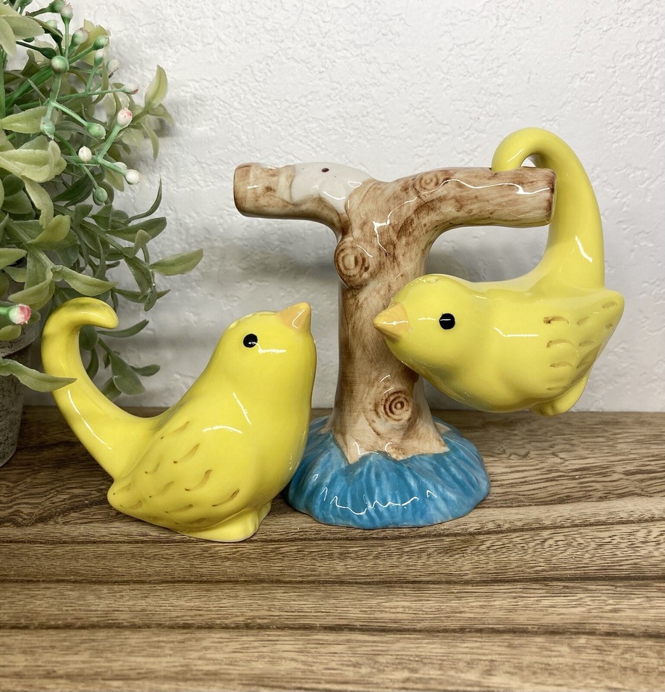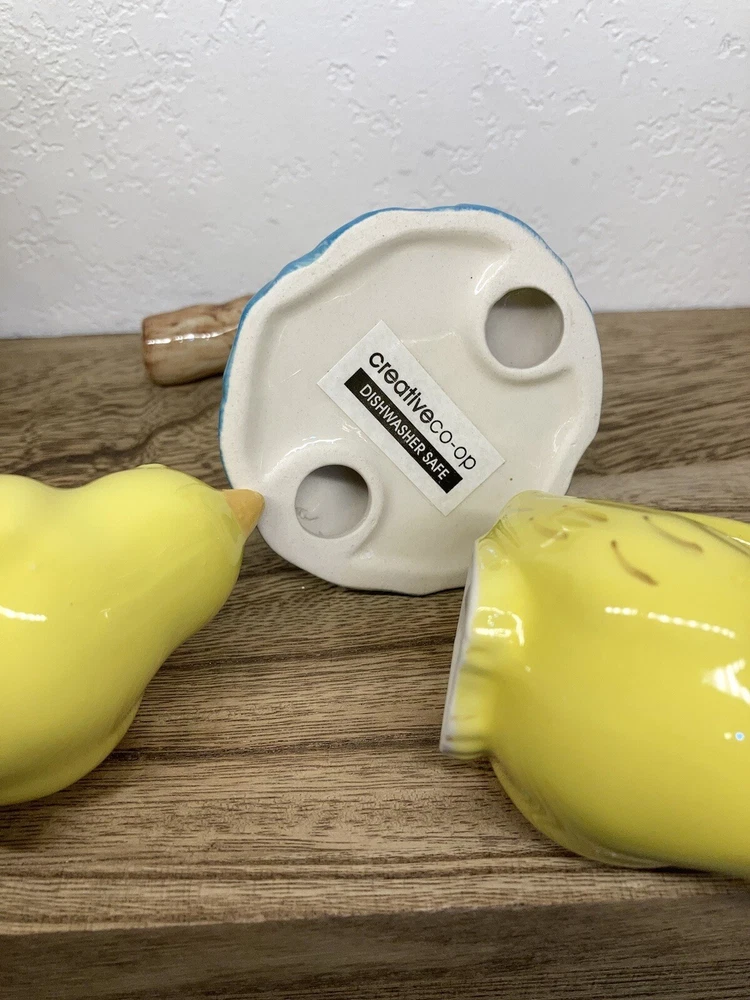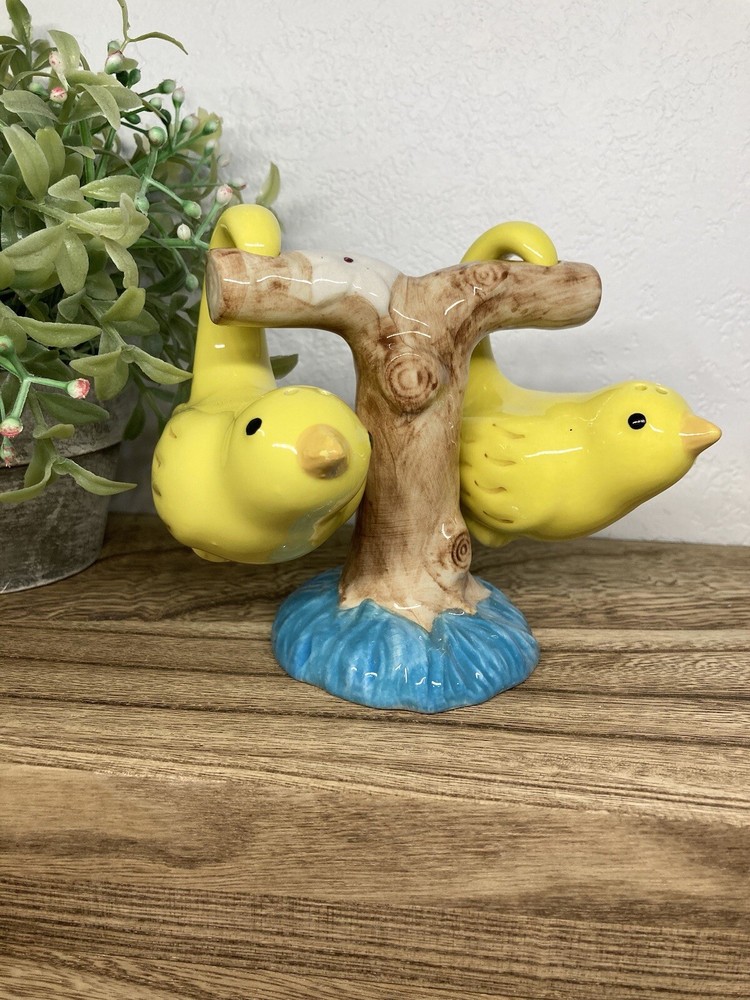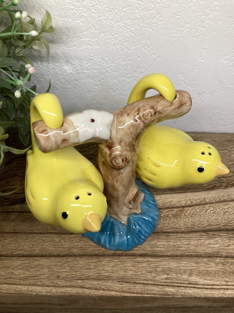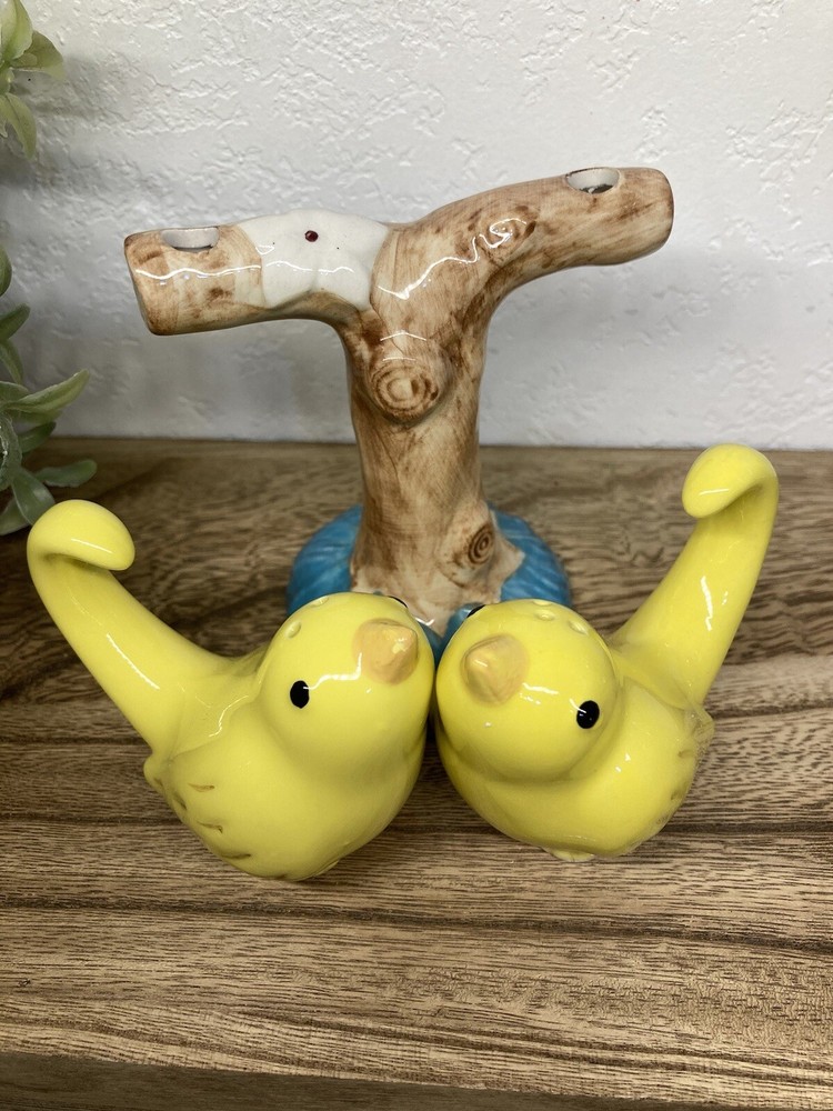 No chips or cracks. 3 piece set. Never used. Has the stoppers in the bottoms. They can sit or hang. The tree branch is 4” tall. The birds measure 2.5” tall. 3” long. Fast shipping! J...