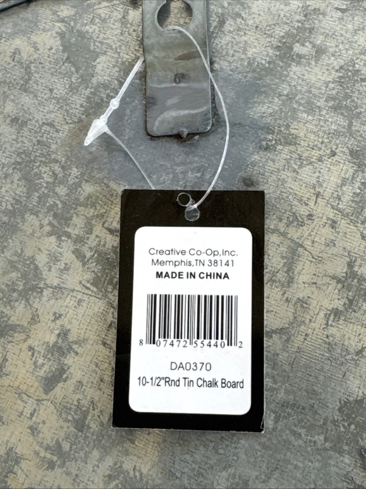Creative Co-op Bottlecap Round Tin Chalk Board - Galvanized Metal Chalkboard NEW 14.5” total width 12” diameter chalkboard Galvanized metal resembles a Metal Bottle Cap. Lightweight, hangs easily. NEW, never used. Original Price: $29 ----------------------------------------------------------------------------------------- This item is part of the inventory of a Home Decor Store, slated for liquidation. Many great finds will be added for sale on a weekly basis, some at significantly reduced prices. Items are NEW, never used unless otherwise specified in the listing. Many are hard to find and unique, or manufacturer discontinued items not available elsewhere.
