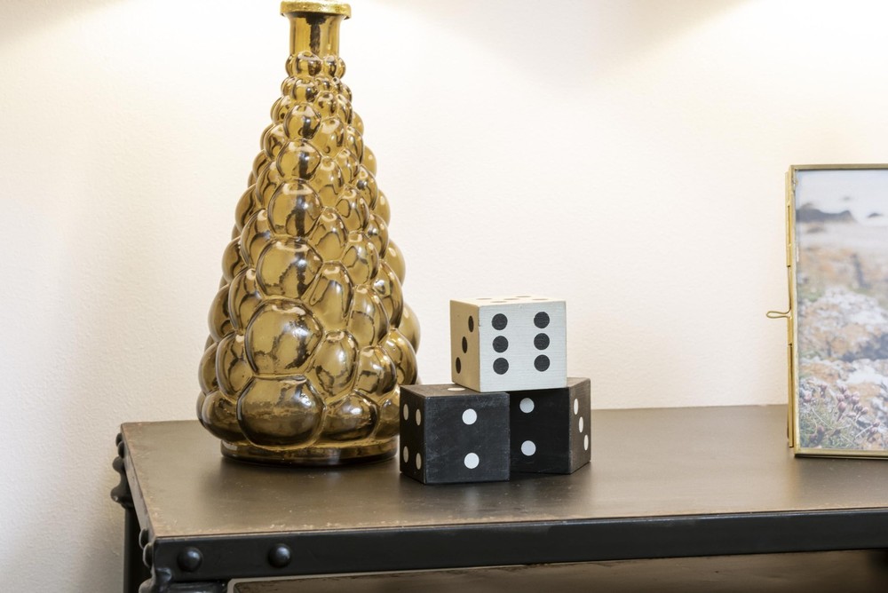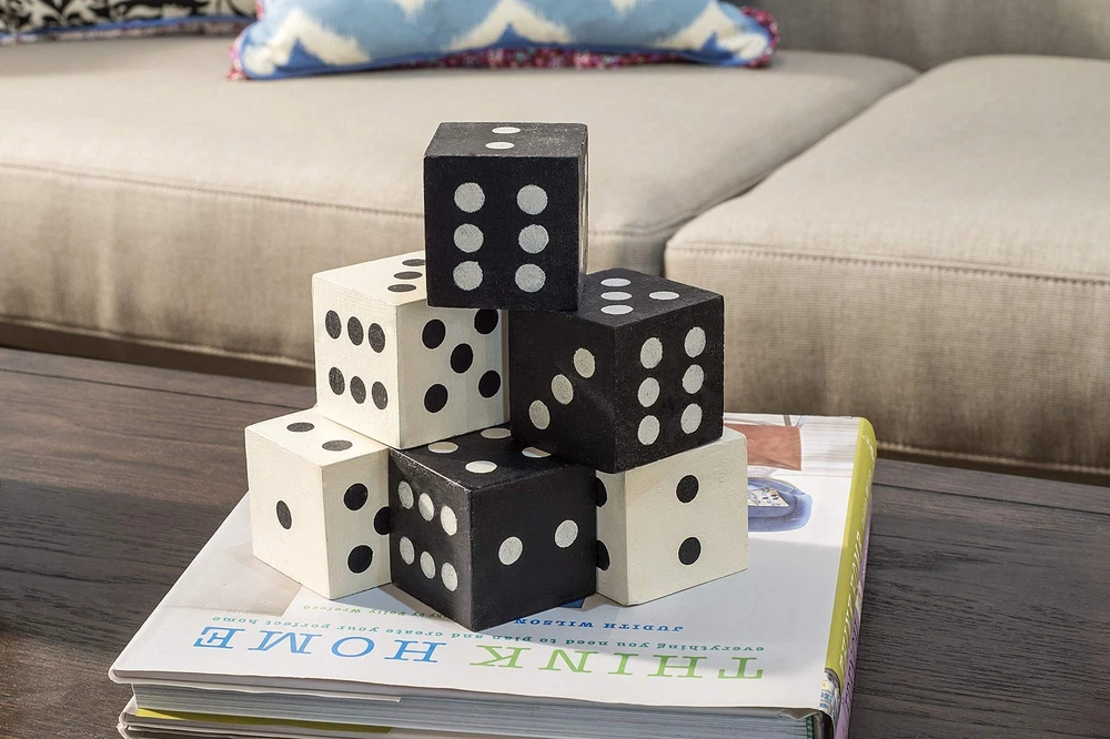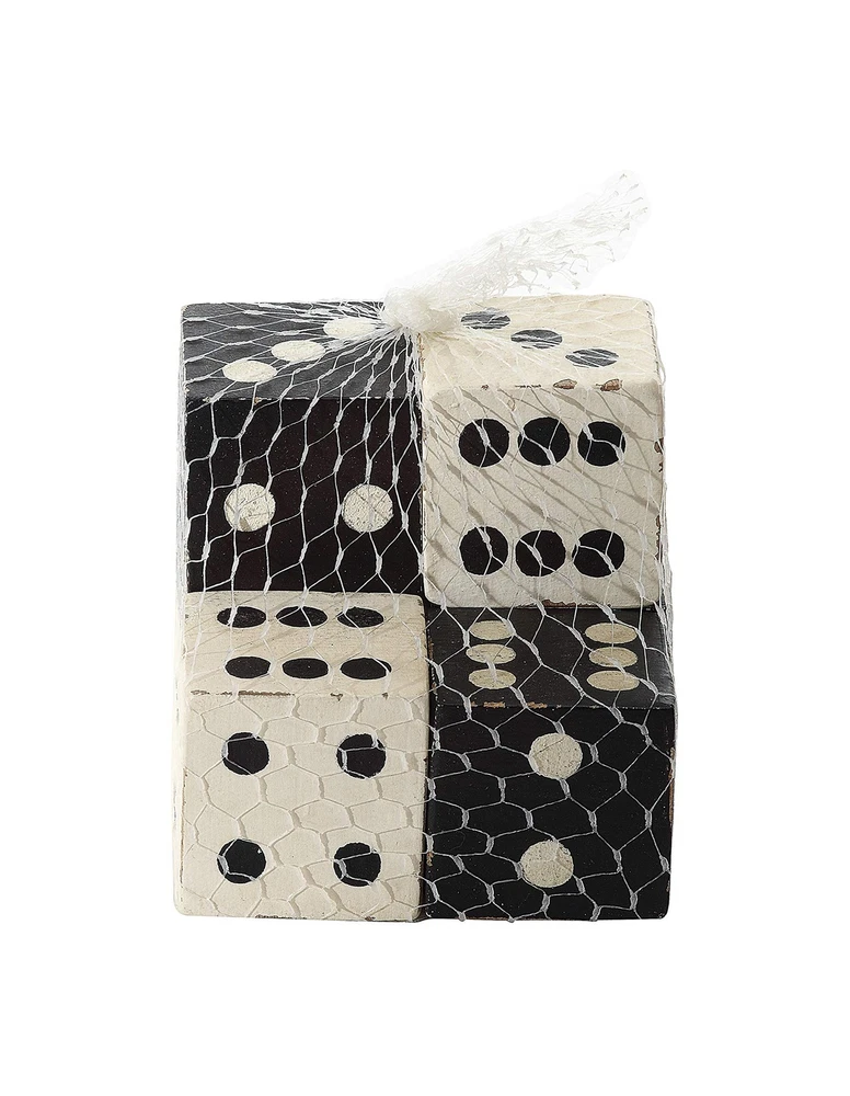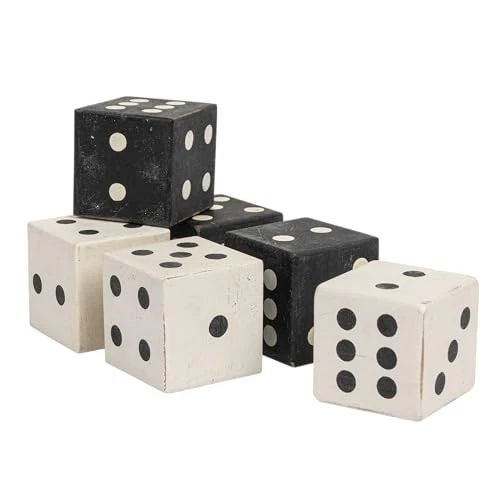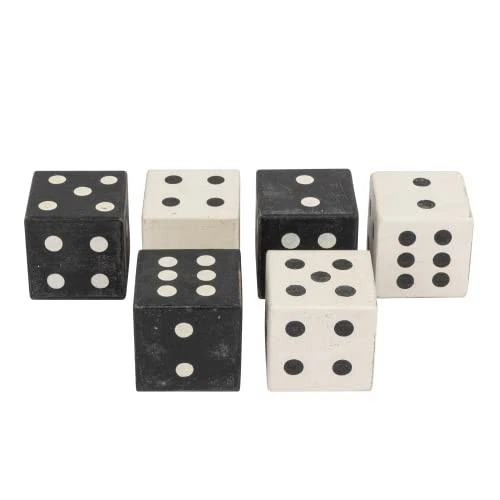 Product Page Decorative Mango Wood Dice (Set of 6 Pieces) Kitchen Description: Add a classic touch to an office or living room shelf with this set of six black and white wood dice. Made of hand carved mango wood, these dice match a variety of decors - from modern to rustic country. These pieces can add a fun touch to any space. Stack and display easily and any which way you please. Features: Mango wood construction Set includes 6 dice Hand carved item Each: 2"L x 2"W x 2"H Black and white dice add a fun touch to any bookshelf Wipe clean with a dry cloth