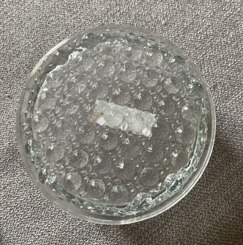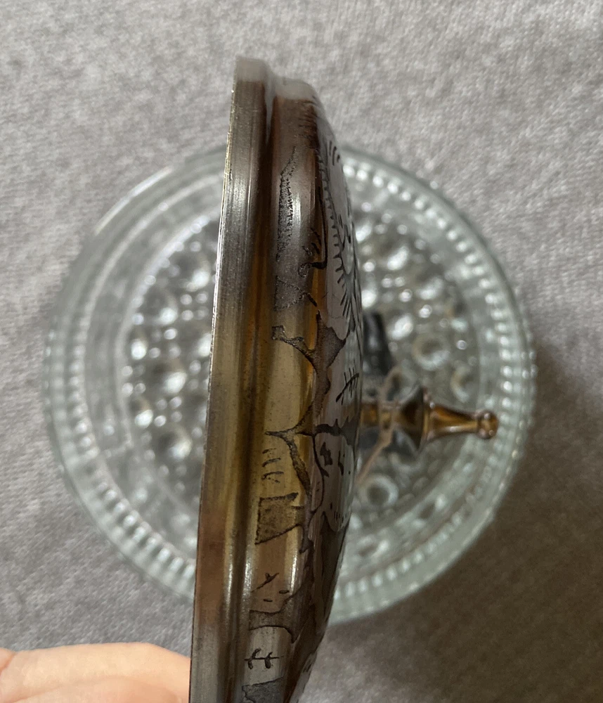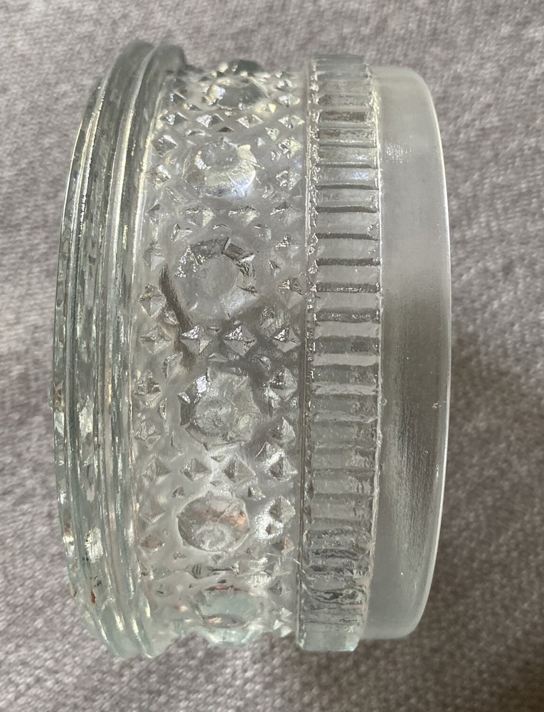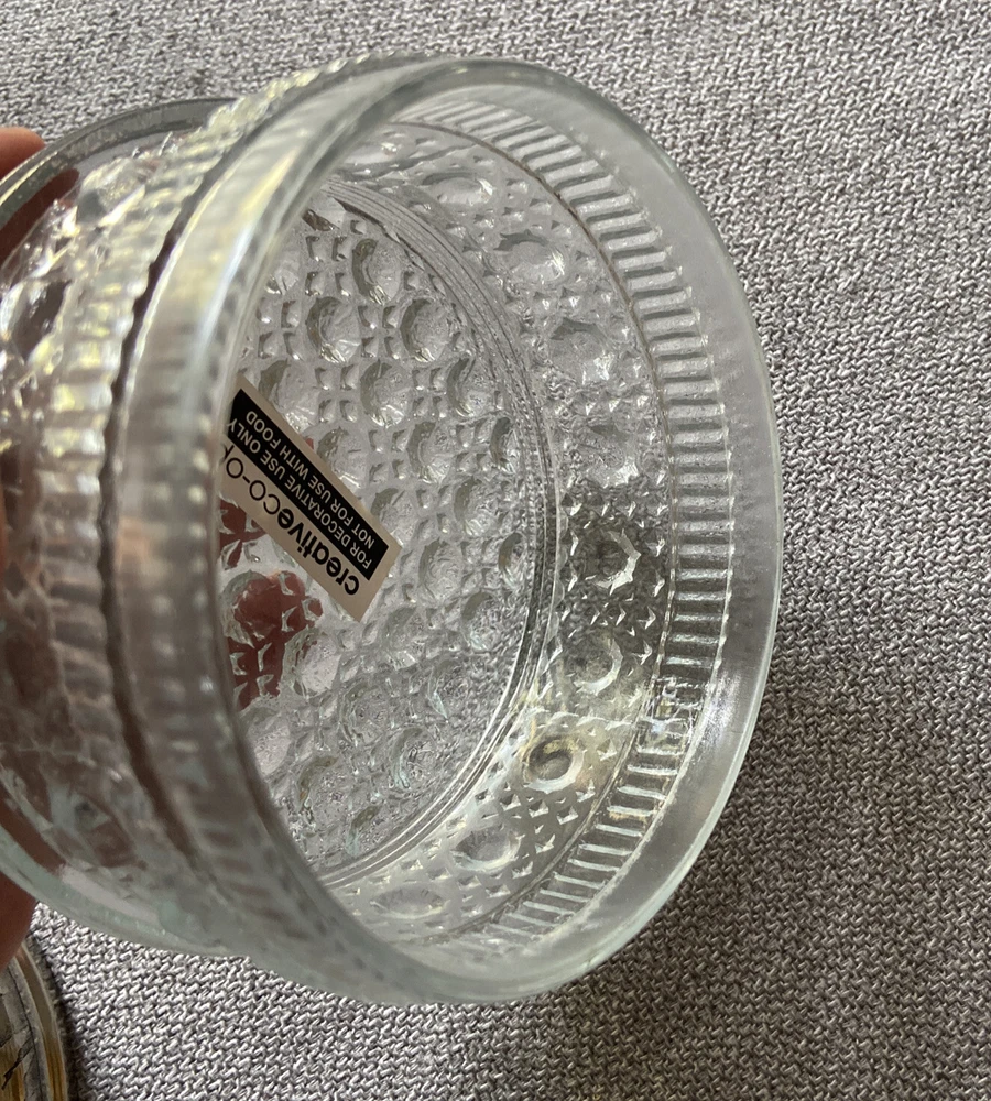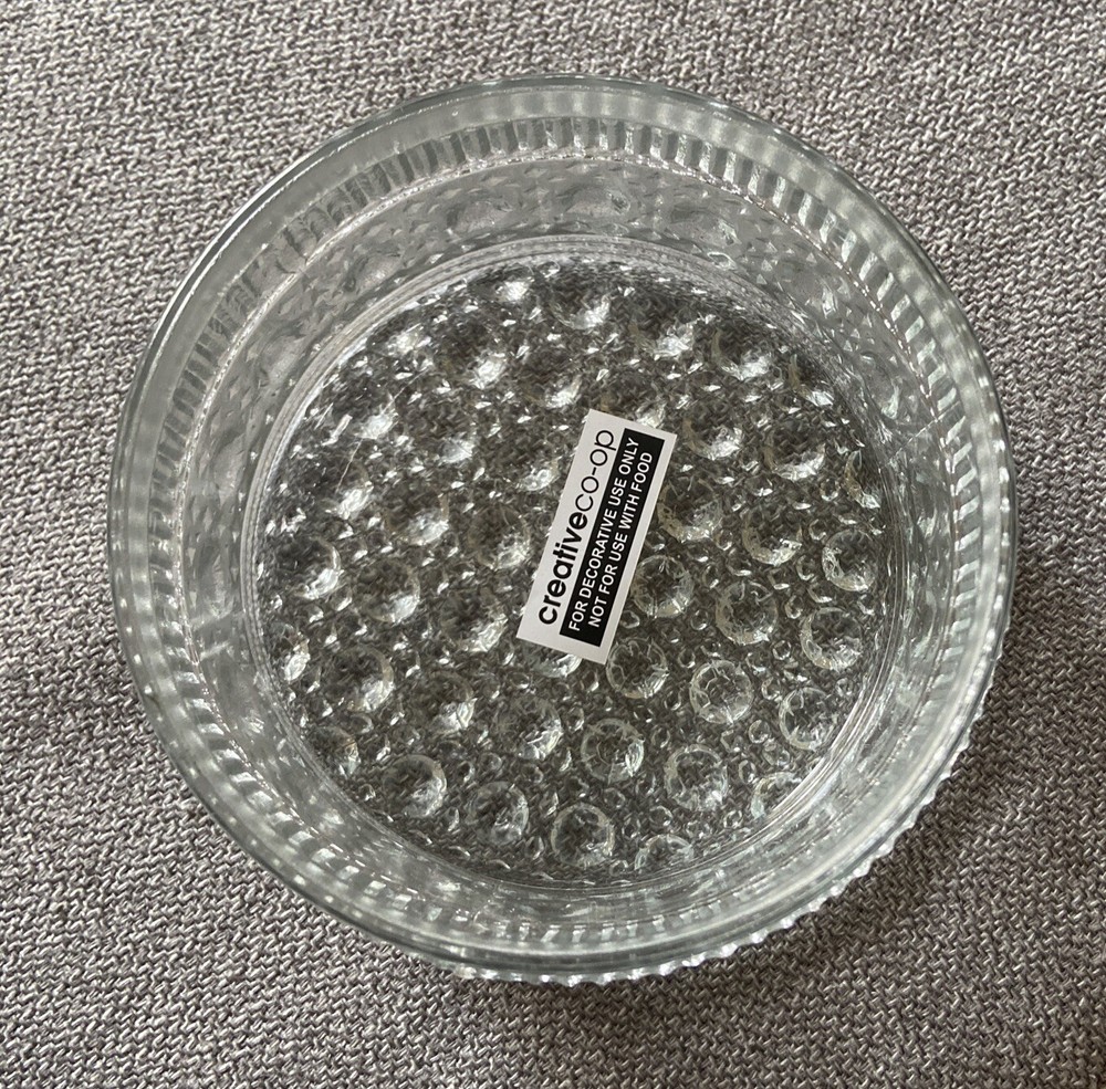 Creative Co-Op DA3997 Embossed Glass Box with Metal Lid. Dish measure 4 1/2" round and 3 1/2" high. No box but item is NEW. I will mail USPS Priority Mail....