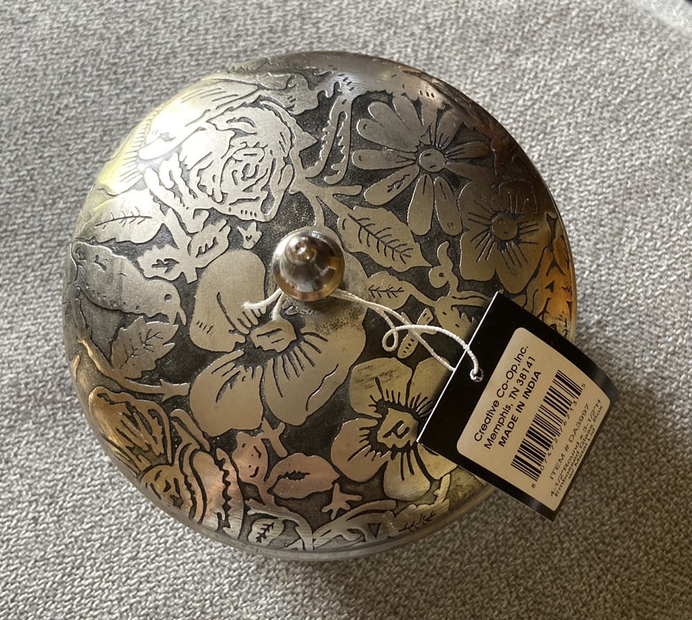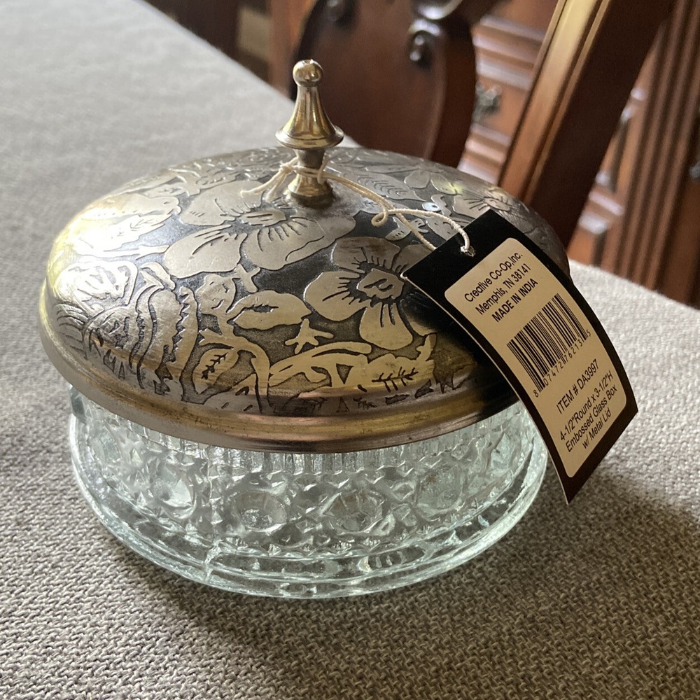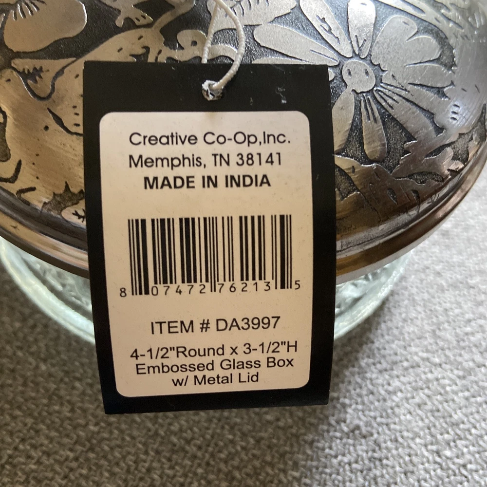 Creative Co-Op DA3997 Embossed Glass Box with Metal Lid. Dish measure 4 1/2" round and 3 1/2" high. No box but item is NEW. I will mail USPS Priority Mail.