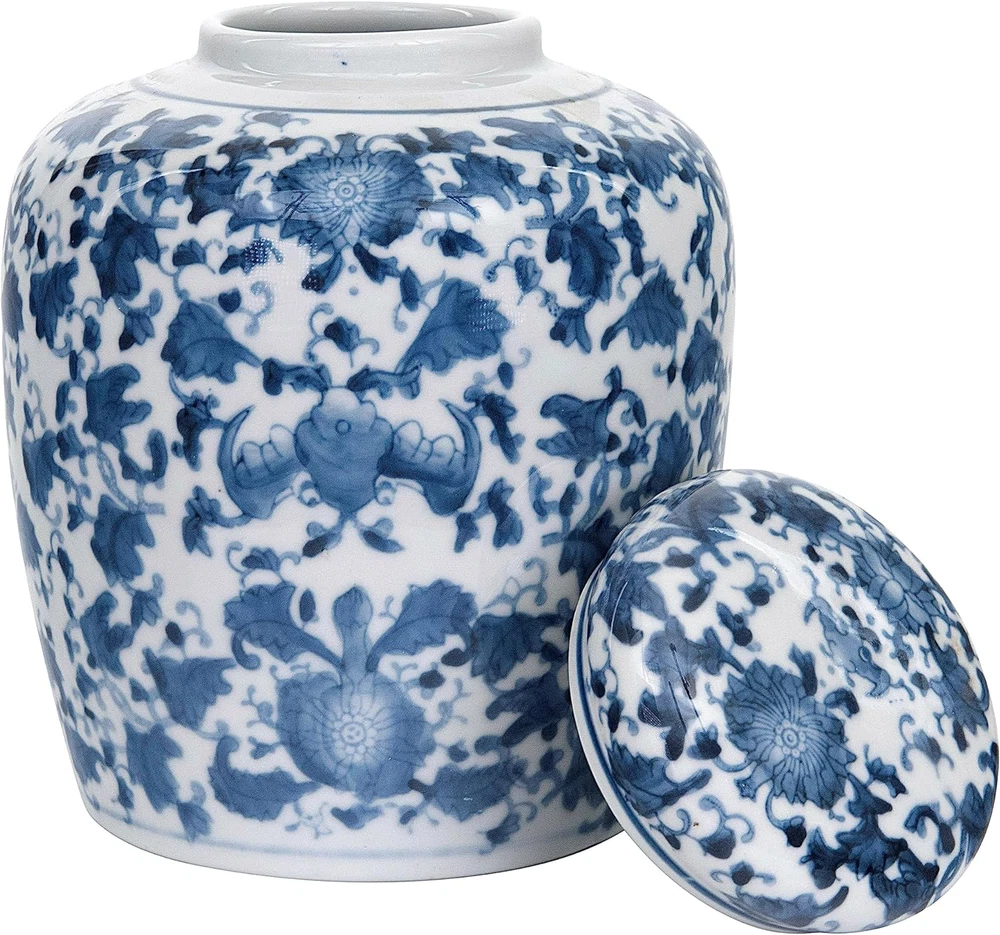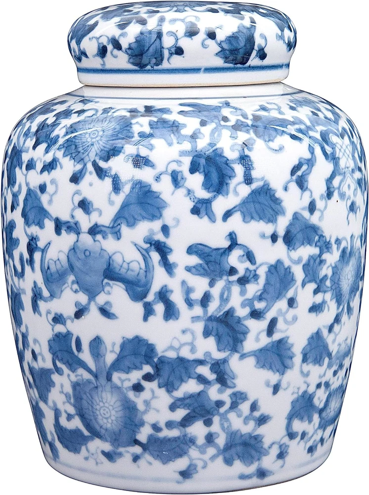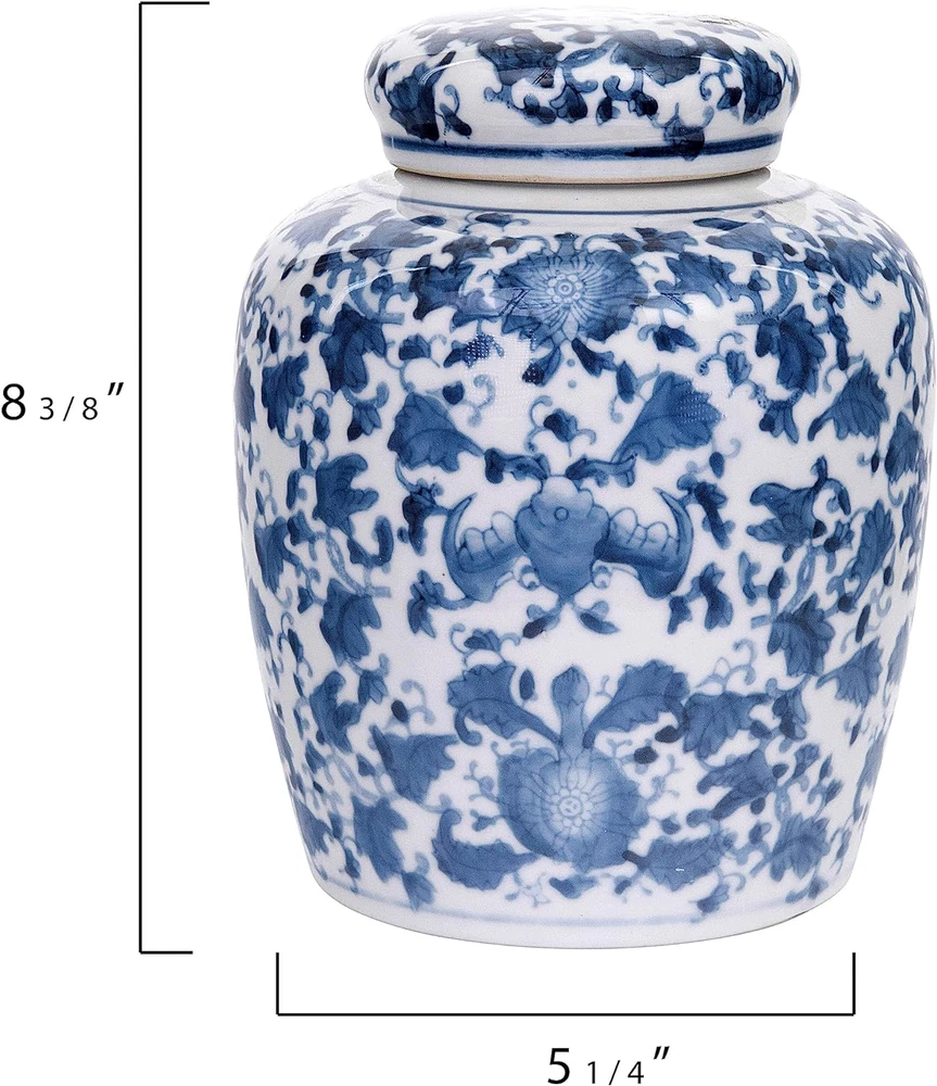 Creative Co-op Decorative Blue and White Ceramic Ginger Jar with Lid, Large Intentionally curate an elegant, storied space with Creative Co-Op's thoughtfully crafted collection of decorative jars and canisters, designed to transform clutter while adding depth and texture to any space. Peruse a vast selection of unique, display-worthy pieces created to stylishly streamline a space of any design scheme, including lidded containers, ginger jars, stoneware vessels, and so much more. Choose from a wide array of materials from hammered aluminum and paper mache to stoneware and ceramic, and styles from mid-century modern and coastal to classic farmhouse and cottage. Elegantly stow unsightly odds and ends, or display treasured trinkets with decorative storage that is sure to impress. This delicately crafted ginger jar showcases a modern take on a classic silhouette with an intricately painted pattern and semi gloss finish Removable lid allows for the storage of teabags or odds and ends, and also doubles as an eclectic vessel for displaying dried or faux florals Do not use harsh cleansers or polish when cleaning Made from 100% ceramic 6.5 inches L x 6.5 inches W x 8.25 inches H