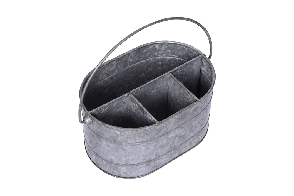 This rustic portable caddy features durable metal construction with four storage compartments and functional handle Organize silverware and napkins, office essentials and craft supplies, or showcase dried florals in the storage compartments Wipe clean with dry cloth Made from 100% iron 12 inches L x 7.5 inches W x 5.75 inches H
