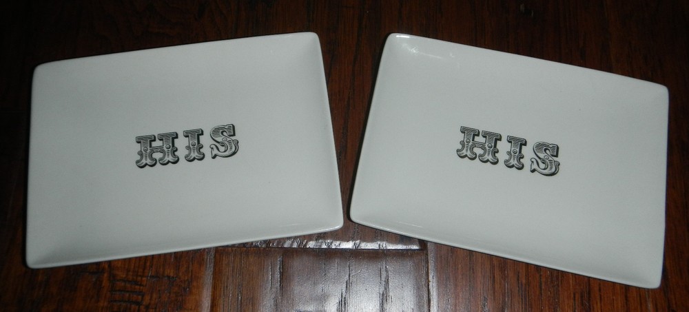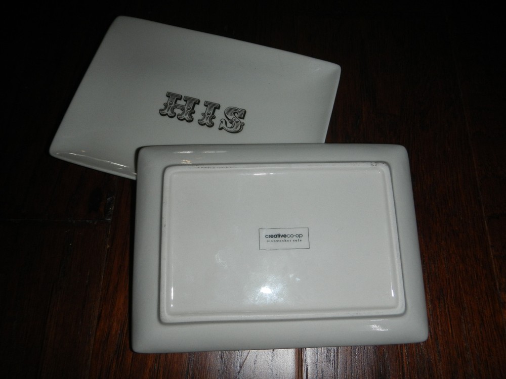 Creative Co-op Flirt HIS and HIS 2 Piece Trinket Tray Plate Set. They are pre-owned but in excellent condition with no visible issues. Set of 2 decorative plates or trinket trays for couples Gold-tone His & Hers decals in western typography Measures 7" long x 5" wide Dishwasher safe Buyer to pay actual shipping. Paypal preferred but other methods of payment also accepted. Send me an email if you have any questions.