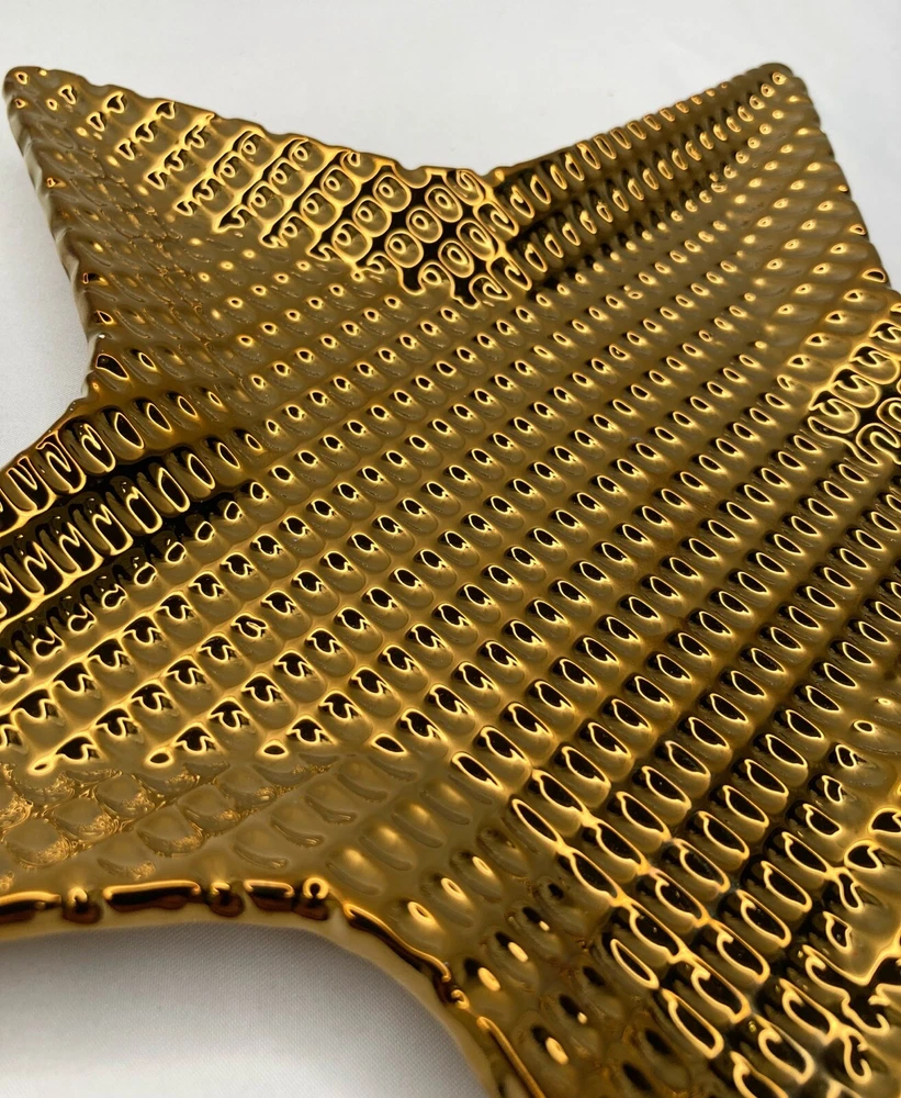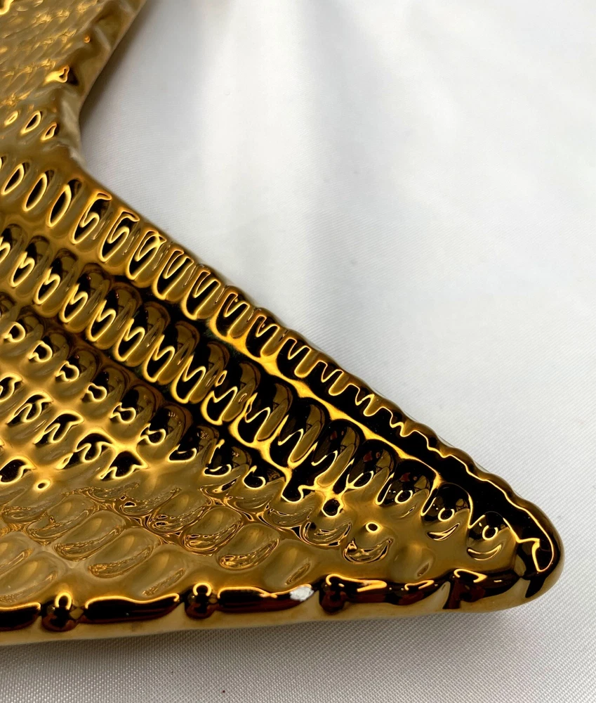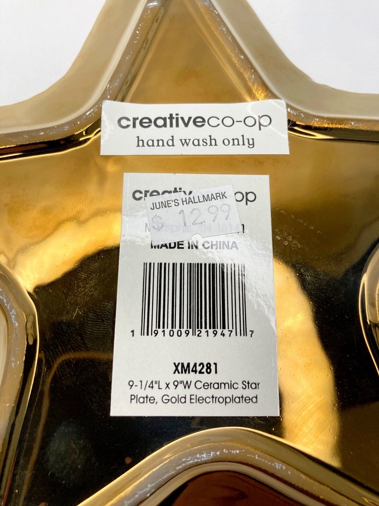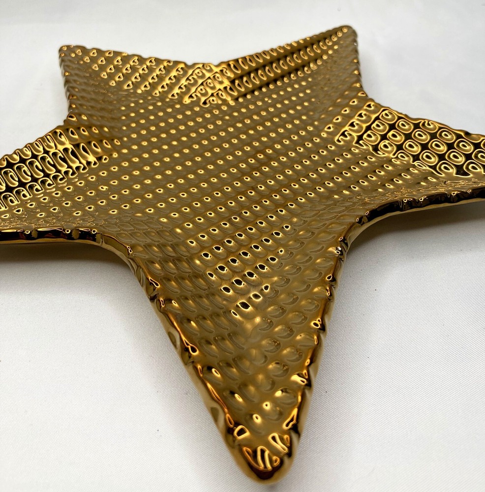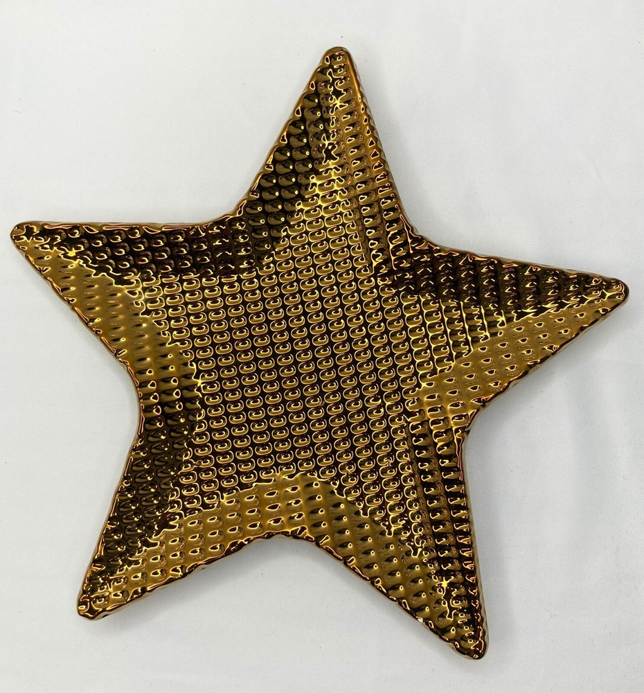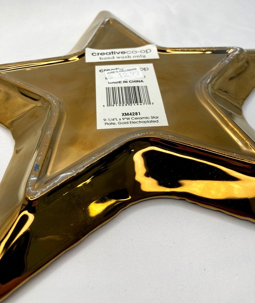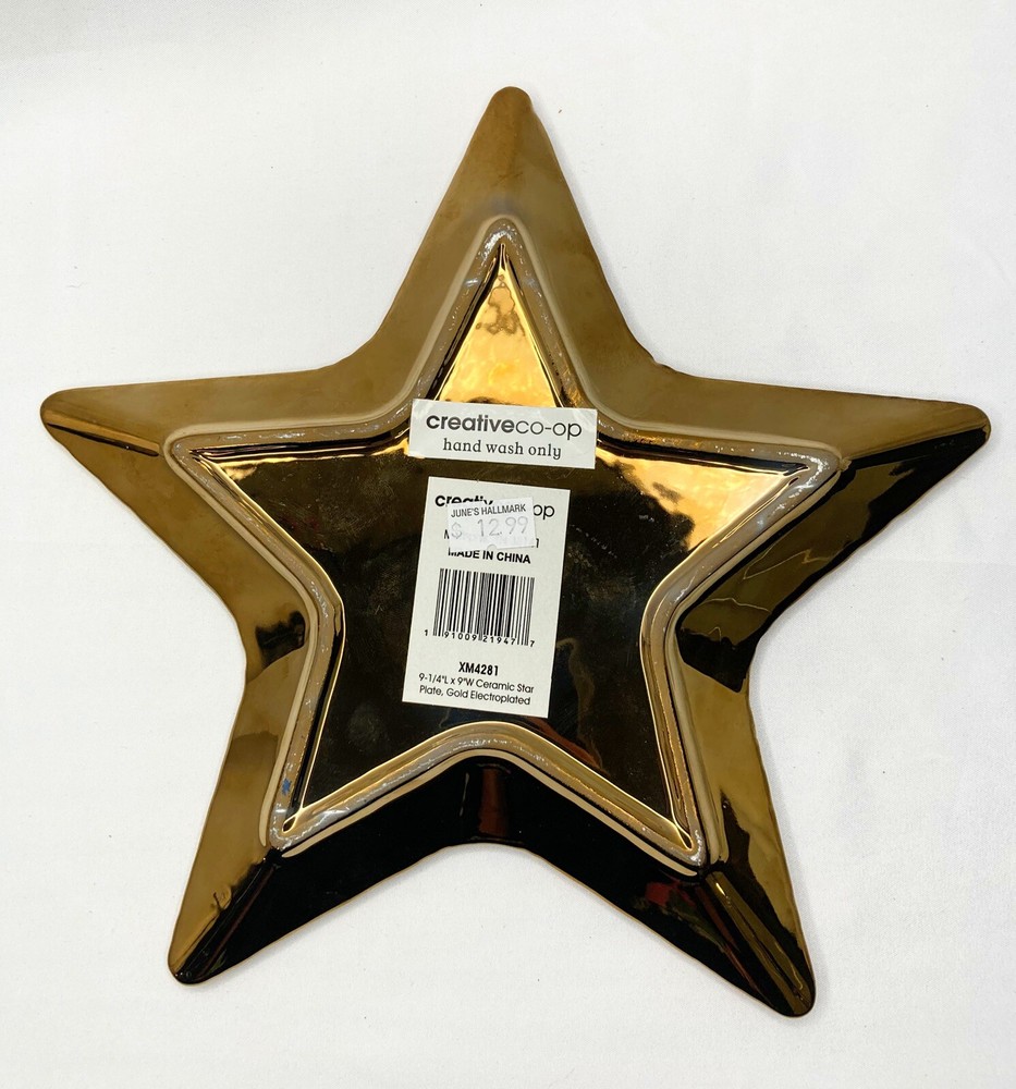 Creative Co-op Holiday Gold Electroplated Star Shaped Dimpled Candy Dish/Plate. Approximately 9 1/4” Long x 9” Wide. Hand Wash Only. Item #XM4281. Condition is “used “ and in good shape. There is a tiny chip as depicted in the pictures. Please be sure to look at all the pictures before you make a decision to purchase. Thanks for looking at my products and please contact me if you have any questions. Shipped USPS First Class Mail.