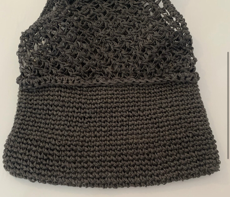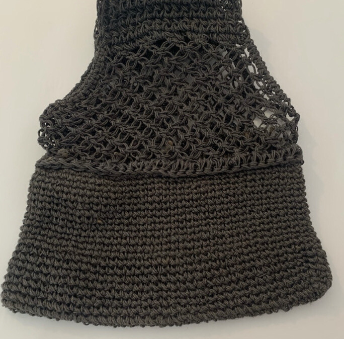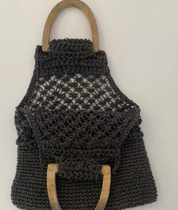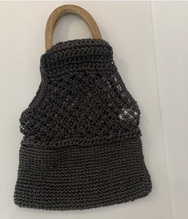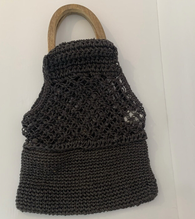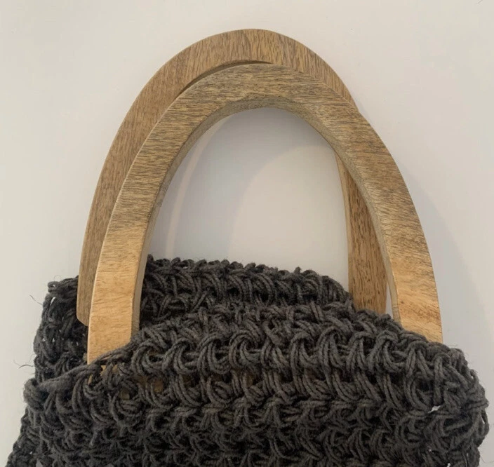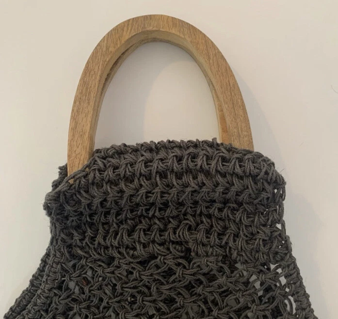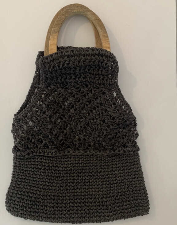 Creative Co-op Inc gray jute crochet handbag. Wooden handbag, not lined, use as purse or grocery bag. Length-Top of handle to bottom of bag 22" Length just crochet area 16" Width 13"