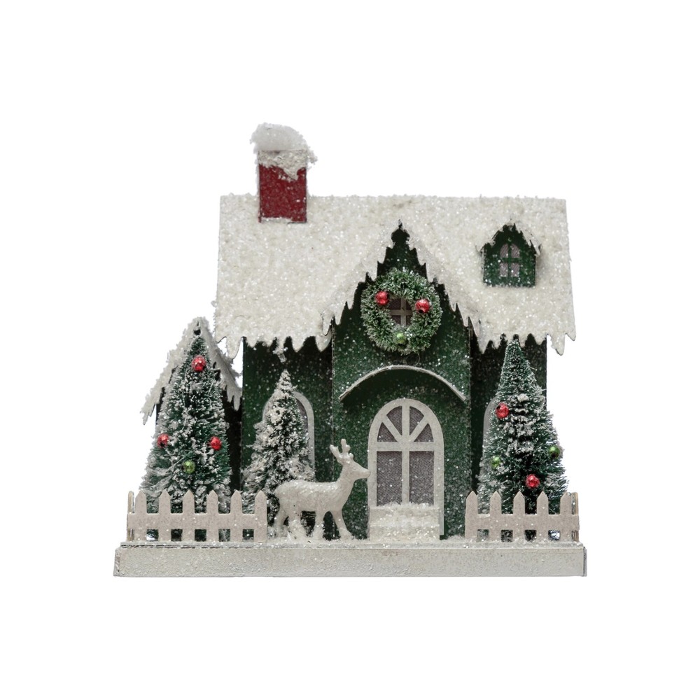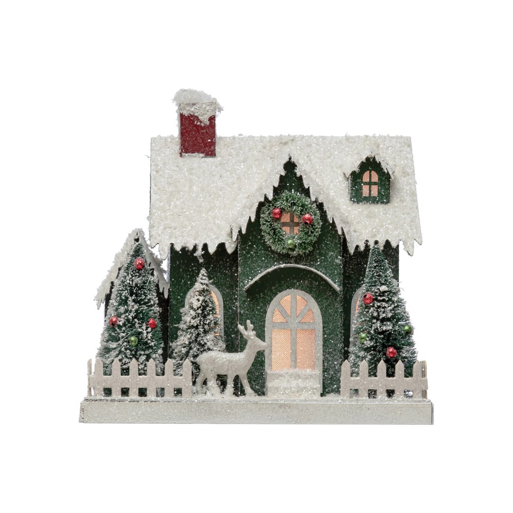 Creative co-op Holiday Christmas house What a great way to show your holiday spirit! Here we have a very festive Creative Co-op Holiday Vintage Style Christmas House . ~~ Our holiday house has icicles hanging from the roof, a picket fence, a deer , a decorated wreath and bottle brush trees & don’t forget the snow! ~~ House lights up with LED Lights ~~ Requires : (3) AAA Batteries (Not Included) and has an “On/Off Switch ” ~~ Made of : 70% Paper (cardboard like) ~ 20% Jatrophal ~ 10% Plastic Have a great day and thanks for browsin g!