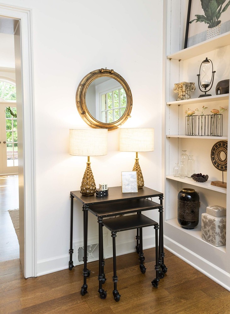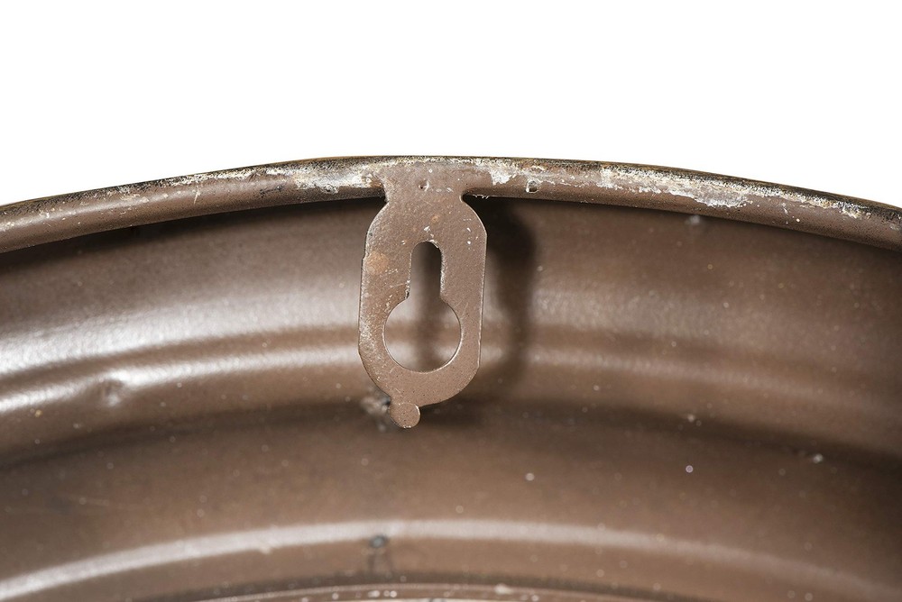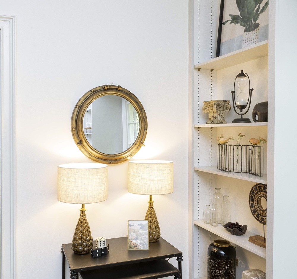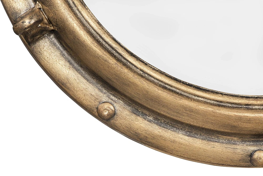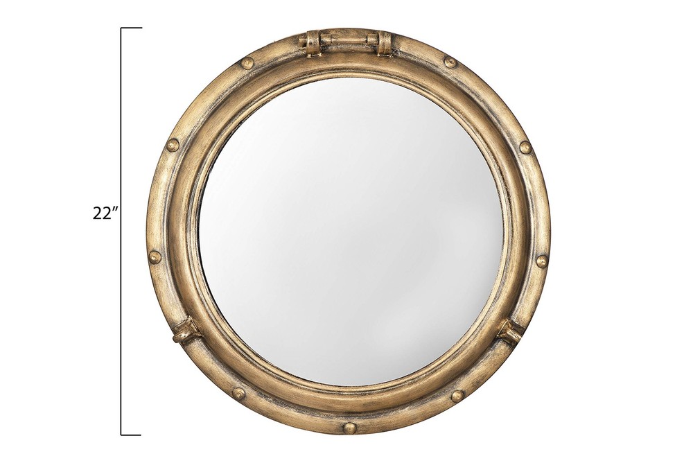 A unique and eye-catching wall mirror with a metal porthole frame in a distressed gold finish Ideal for adding a touch of nautical charm and vintage flair to the living room, bathroom, or bedroom Includes keyholes for easy mounting, can be hung vertically Made of metal and glass Measures 22 inches wide and 22 inches high 1 metal keyhole in back for hanging