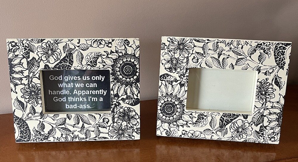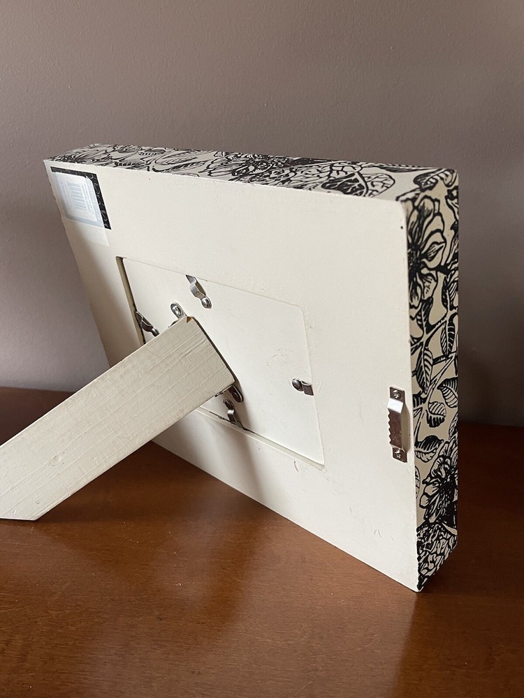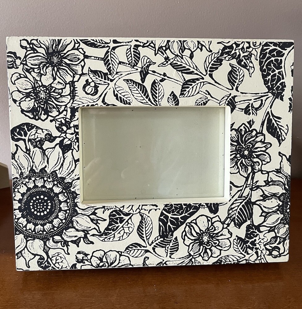 Showcase your precious memories in this charming Creative Co-op Photo Frame. The square-shaped frame is made of high-quality wood and features a beautiful black and cream floral pattern that adds a touch of elegance to any room. The frame is suitable for all occasions and can hold a 4 x 6-inch photo in portrait orientation. This free-standing frame has clear glass and a rear-loading photo insertion type that makes it simple to change out the picture. The item is perfect for adults who love cottage-style decor. It measures 10 1/2 inches long, 8 1/2 inches high, and 2 inches wide, making it a perfect size for any tabletop. Add a personal touch to your space. Frame has minor imperfections photo’s included.
