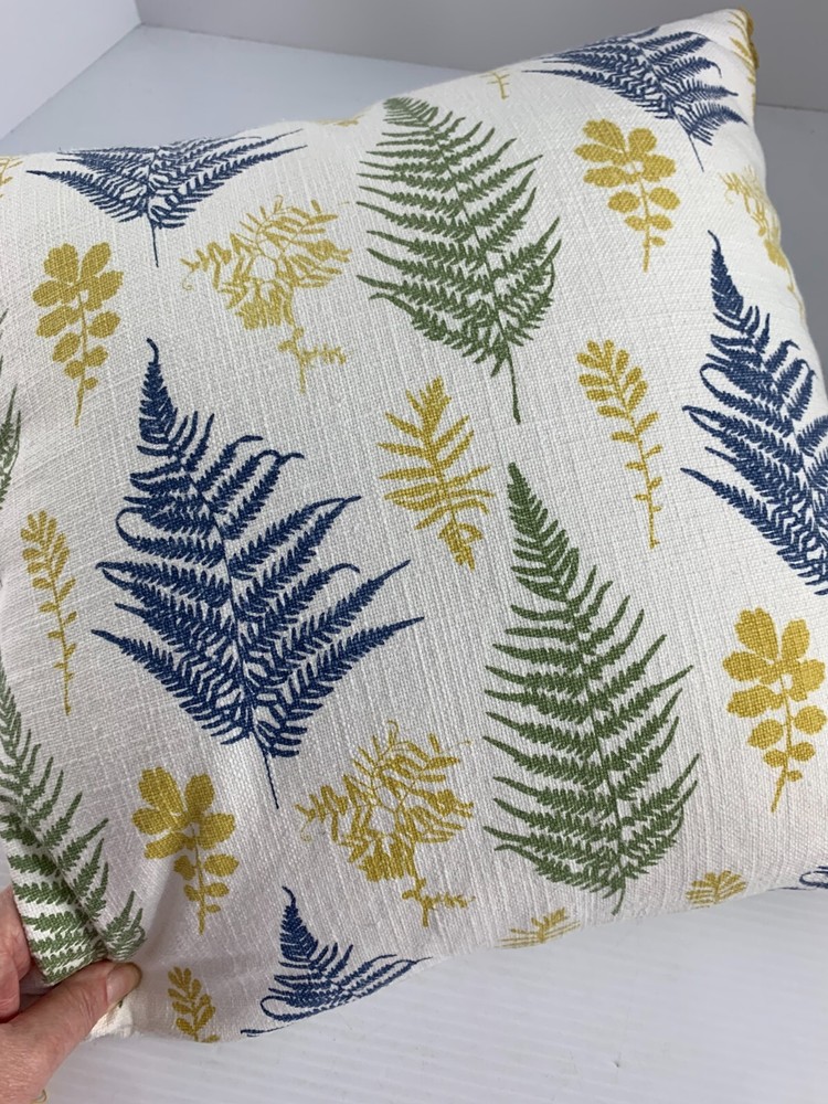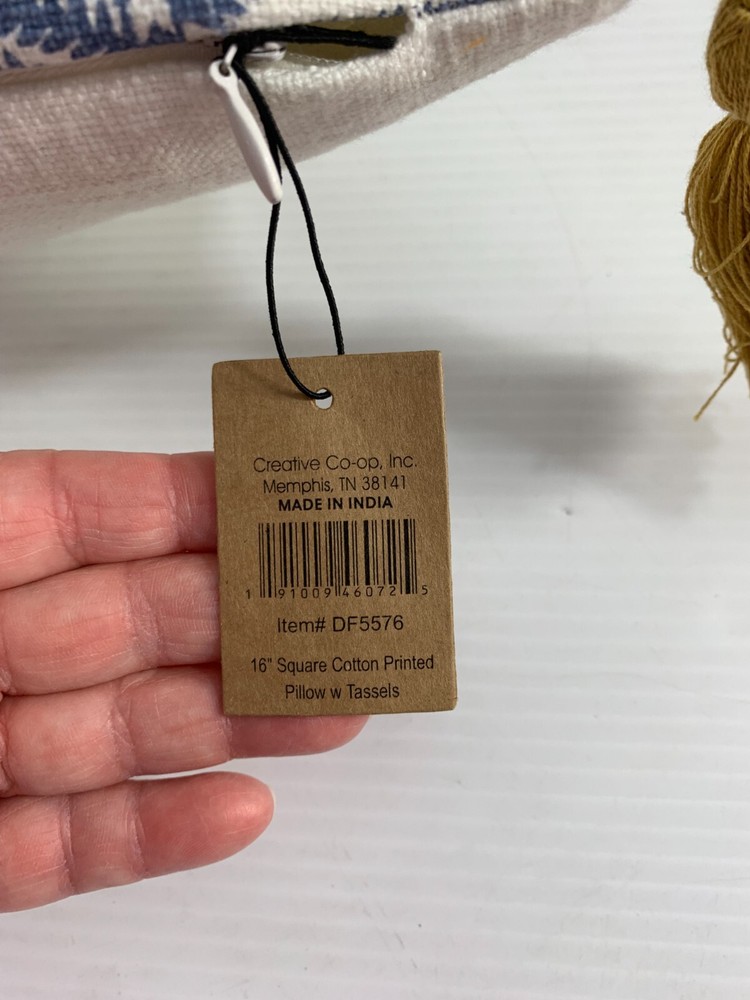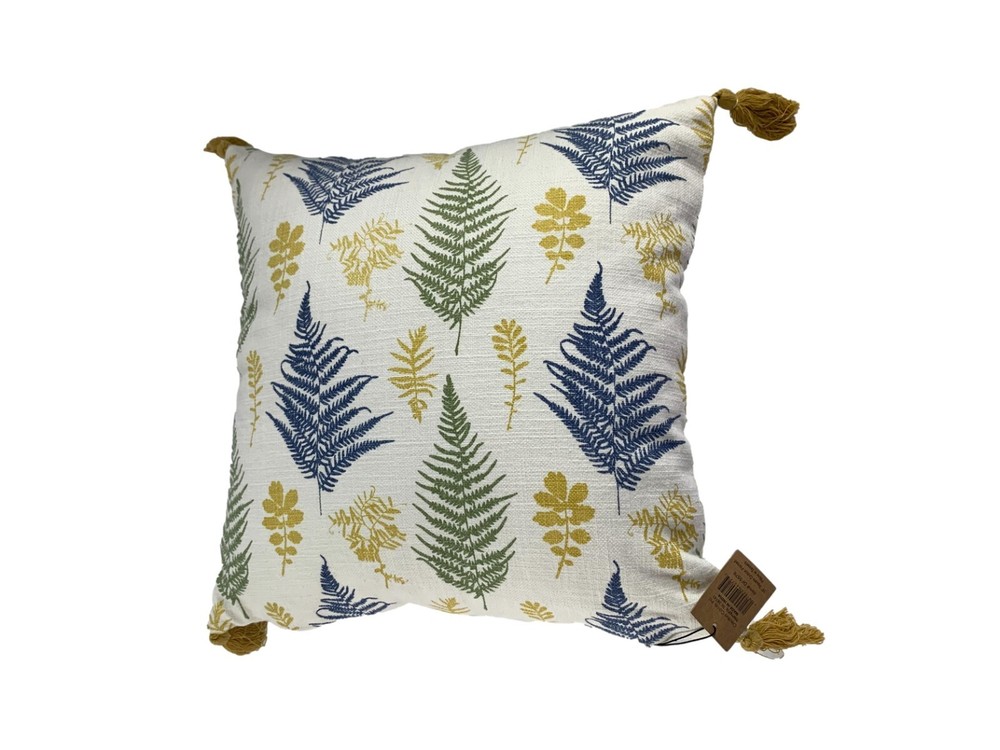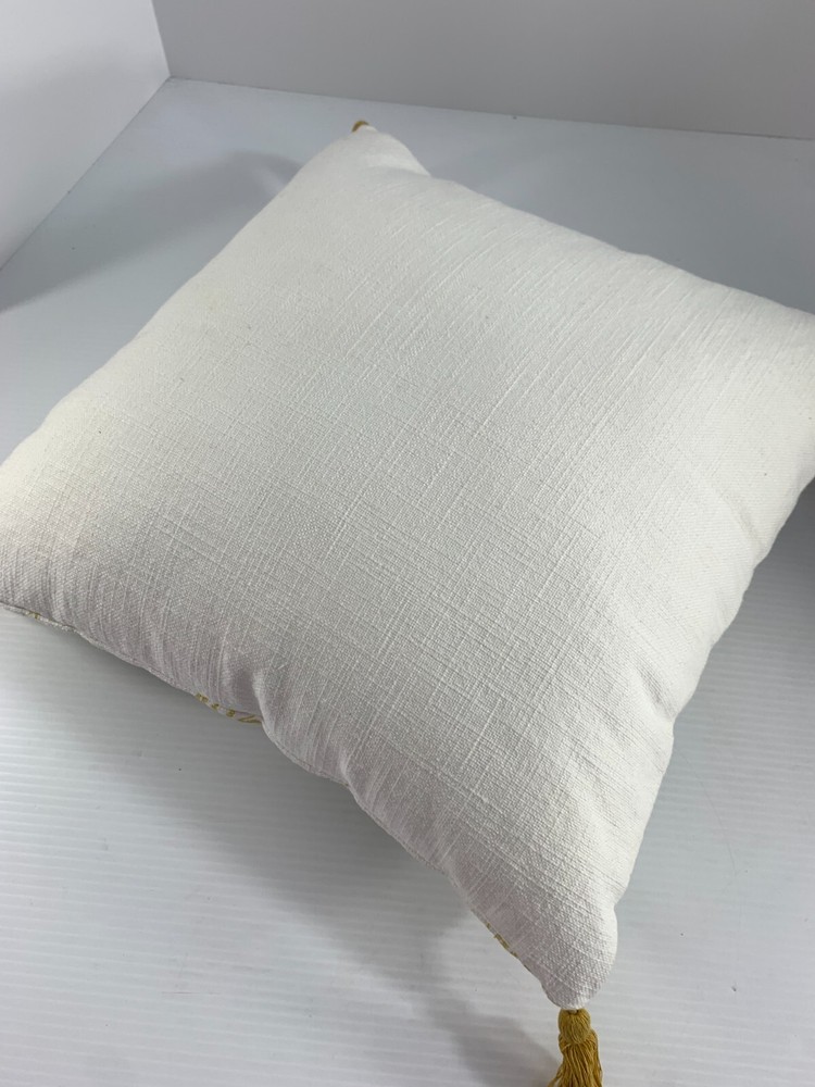 Creative Coop Pillow White Blue Green Gold Leaf Pattern 16" Square Tassel Corners New With Tags Plain White on Other Side Accent Decorative.