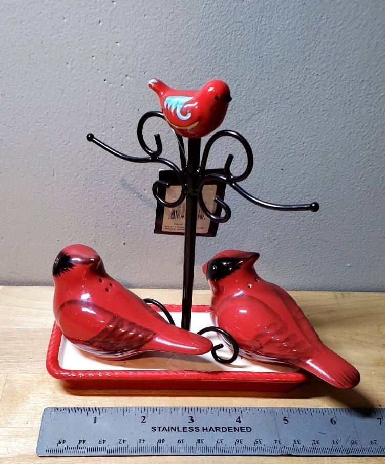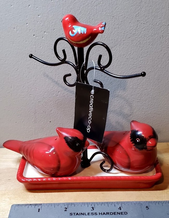 Creative Co-op Red Cardinal Salt & Pepper Shakers w/ Stand New Ships USPS First Class Mail...