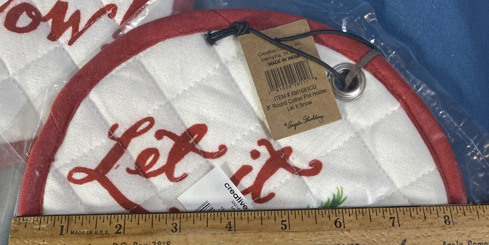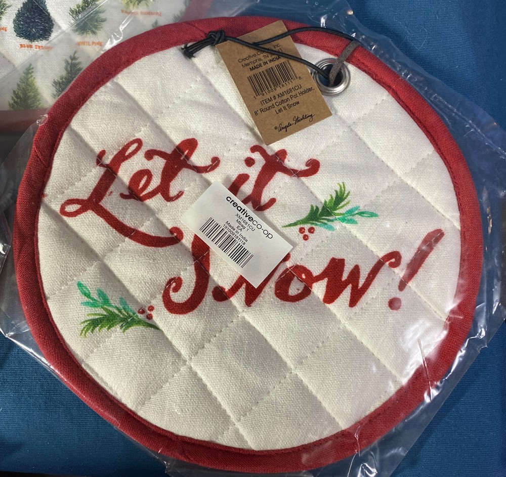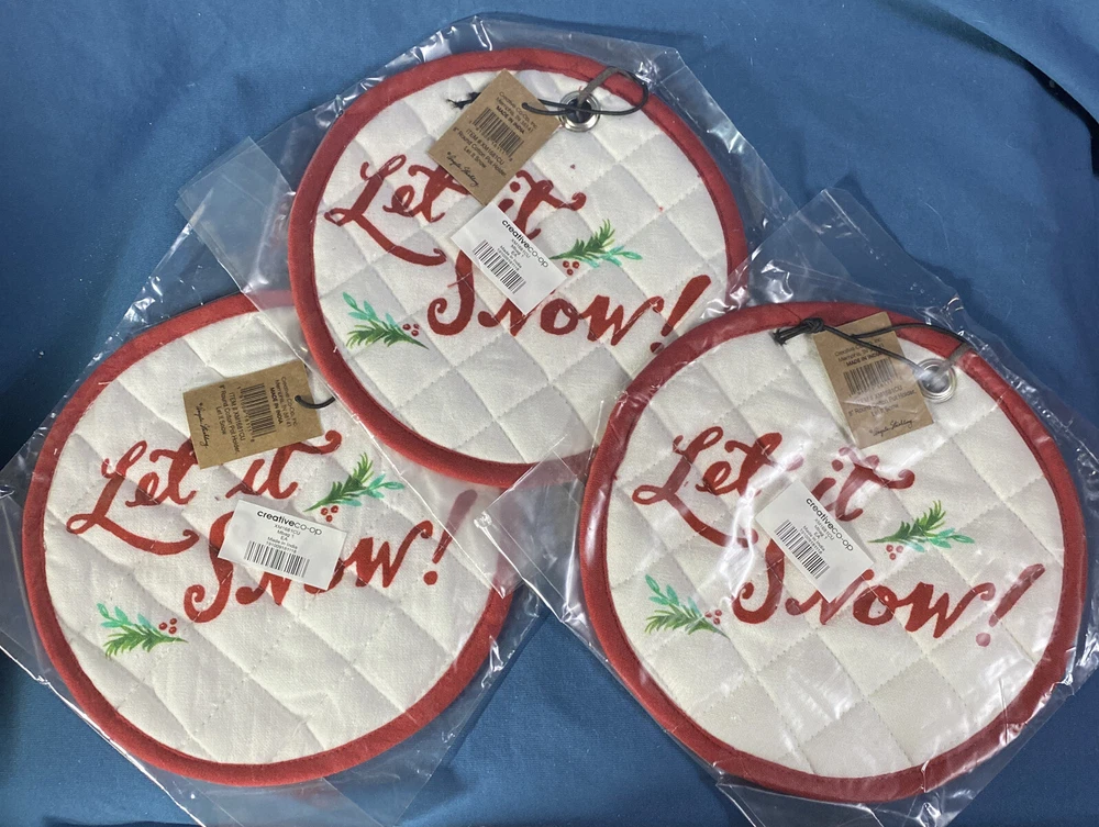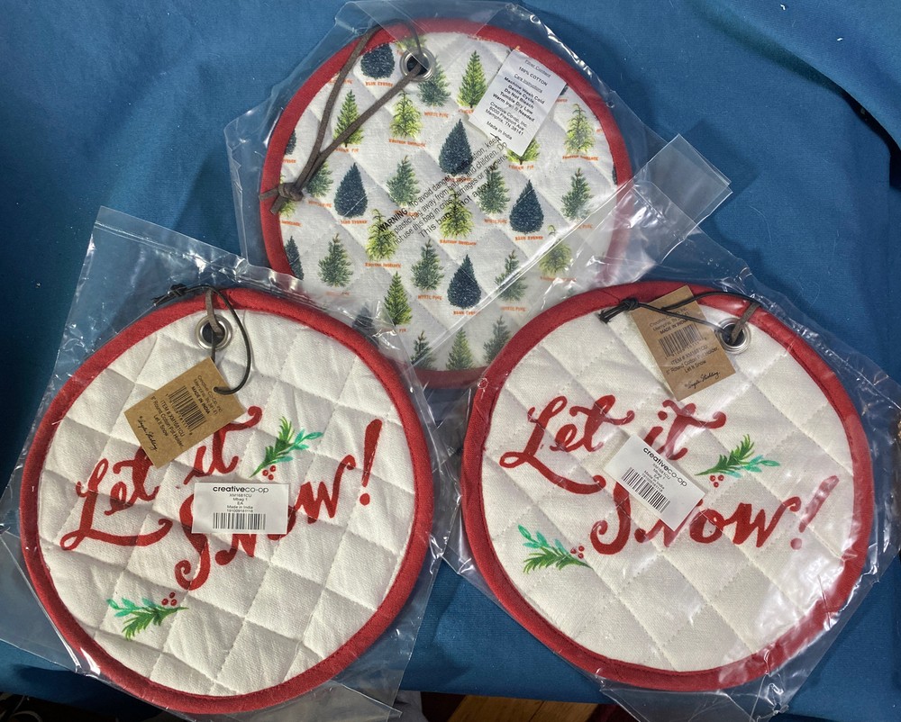 Creative Co-op "Let It Snow" on One Sides & Field of Christmas Trees on Other Reversible Round Cotton Potholders SET OF THREE ~ Brand New/Never Opened Approximately 8 Inches in Diameter Be sure to check out our Ebay Store "Bison Boys Treasures" for hundreds of other great Holiday Decor items and great gift ideas. (Click the Christmas or Ornament Category) Contact me with any questions or additional photos. Visit my store for more great items. YES I DO COMBINE SHIPPING . JUST LET ME KNOW AND I WILL SEND A NEW INVOICE OR REIMBURSE ANY EXTRA THAT IS PAID IF SHIPPING ON SAME DAY. FOR AUCTIONS LET ME KNOW YOU ARE WAITING ON MORE TO END AND I WILL HOLD OFF UNTIL YOU TELL ME KNOW YOU ARE DONE. We DO NOT SHIP TO P. O. BOXES for heavy or large items. WE NEED A PHYSICAL STREET ADDRESS TO SHIP. ***** International Buyers – Please Note: · Import duties, taxes and charges are not included in the item price or shipping charges. These charges are the buyer's responsibility. · Please check with your country's customs office to determine what these additional costs will be prior to bidding/buying. · These charges are normally collected by the delivering freight (shipping) company or when you pick the item up – do not confuse them for additional shipping charges. 3 Day guarantee shipping is through eBay not my store. I ship all items on the next business day. I can not control how long USPS or FedEx takes to deliver the item. Many of the items I sell are pre-owned and have had a past life unless otherwise indicated. Normal wear can be expected. I make every effort to point out any obvious problems. Please keep in mind the age of the item and that there may be some slight flaws from time to time. Please check out all photos for full description. I try to take photos of all areas and all issues.