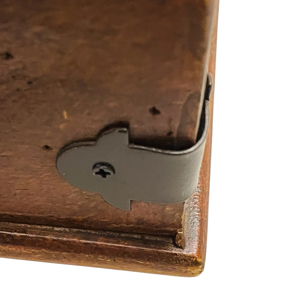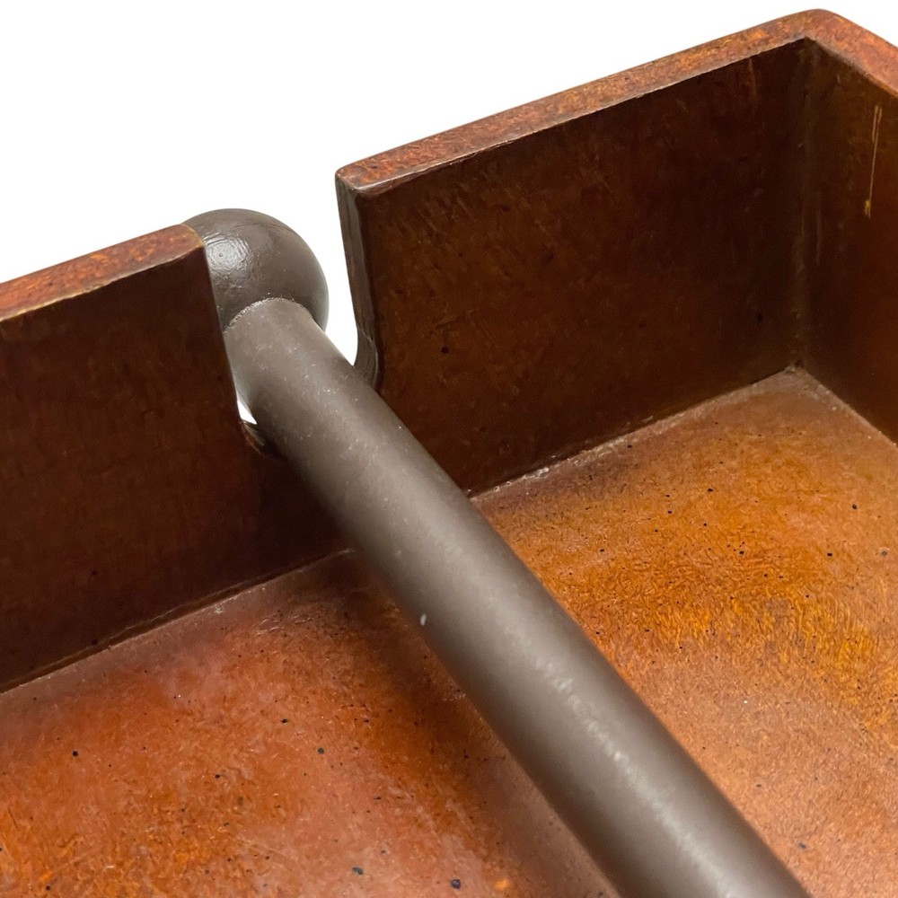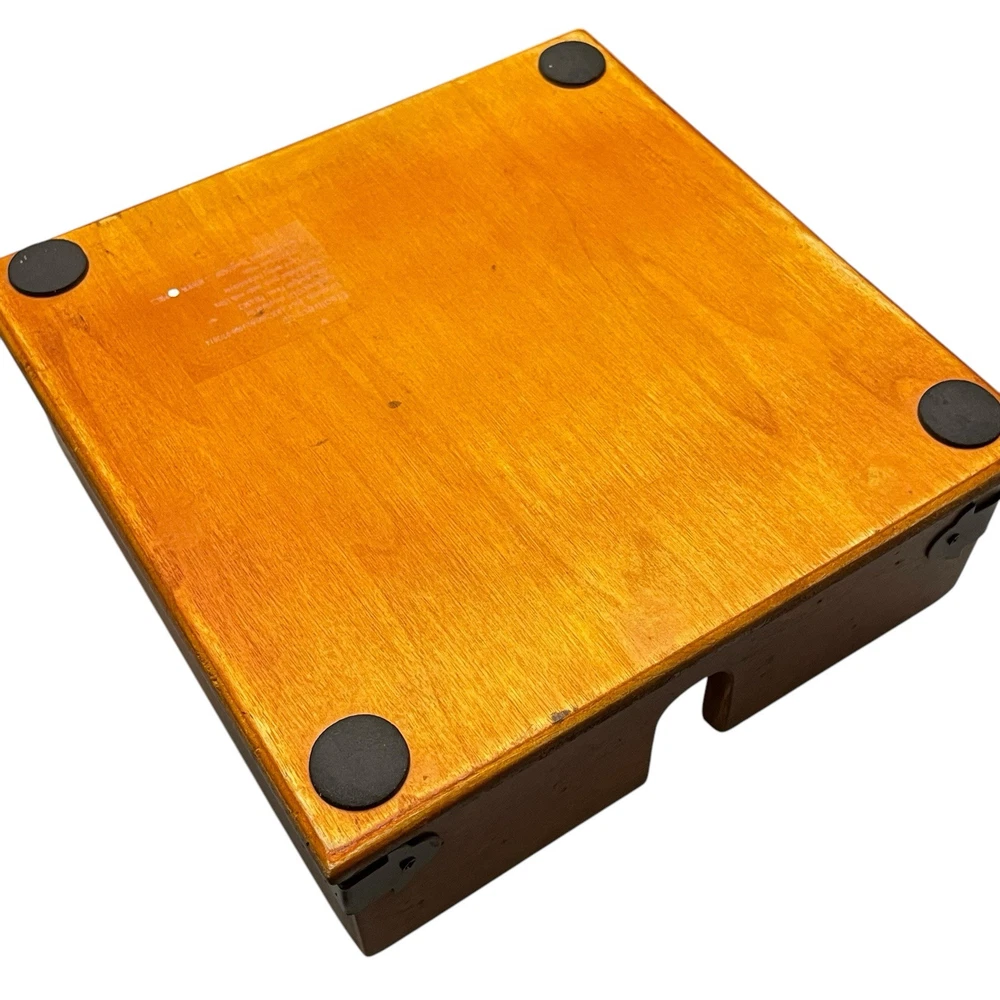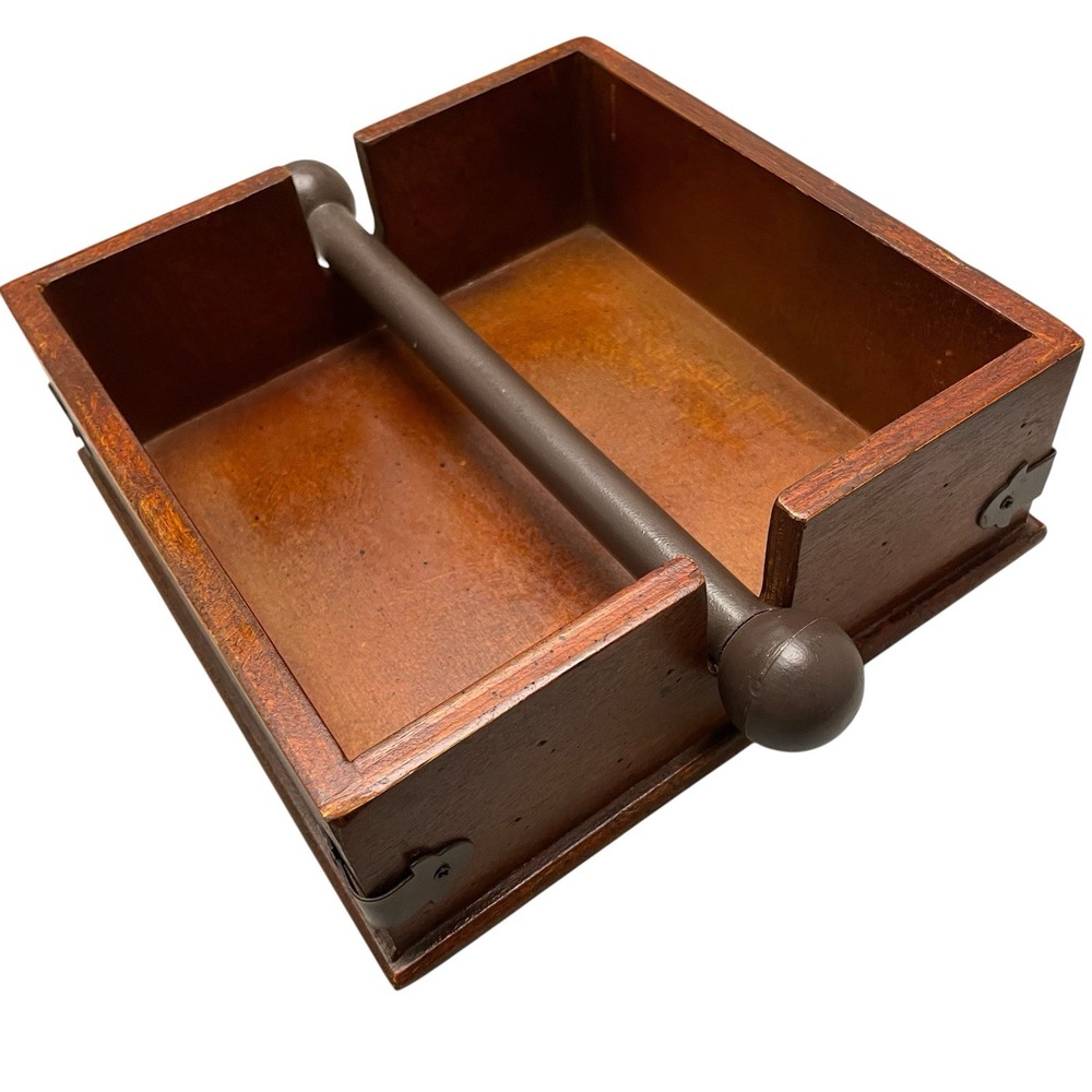 Creative Co-op Rustic Napkin Holders Cross bar prevent napkins from taking flight making it ideal for patio, porches & picnics Bar lowers as napkins are used Holds 6.5” x 6.5” luncheon napkins Made from composite wood with a distressed dark brown finish and accented with rustic black metal corner bracket A heavy plastic bar won’t rust Bottom is finished in a lighter color and has rubber feet to prevent scratches to table top & counter tops Approximately 7.75” square x 2.75” tall Napkin holder has wear consistent with use including superficial scratches and scuffs, but no stains, cracks or notable chips