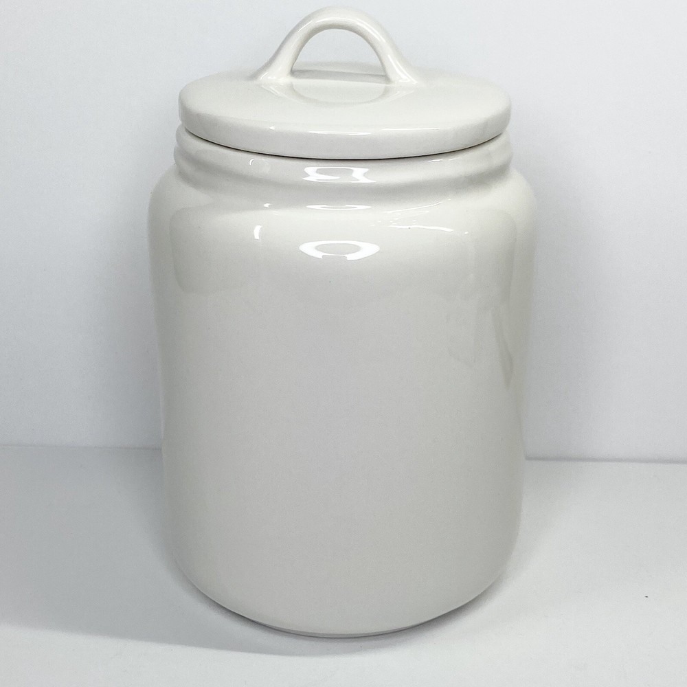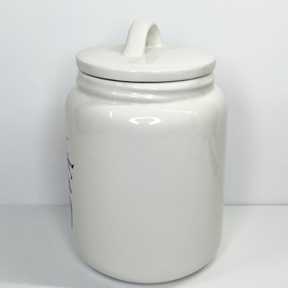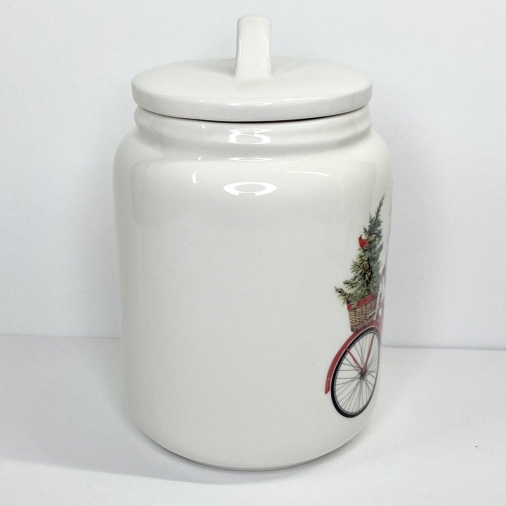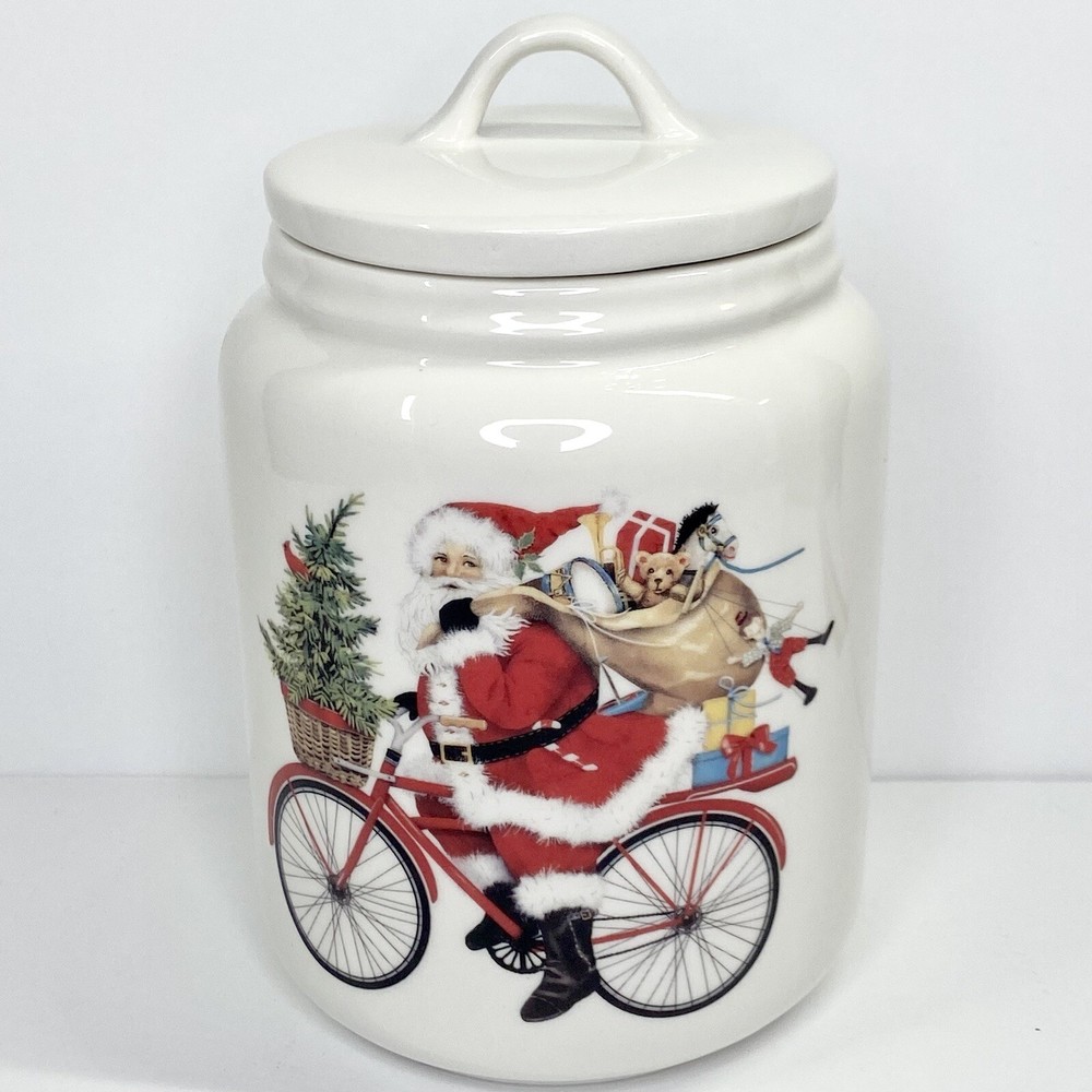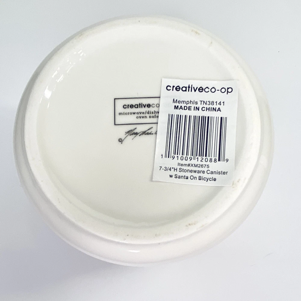 Creative Co-op Santa On Bicycle 8”h Stoneware Canister With Lid. In original box.