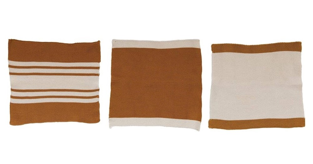 Woven out of premium-quality cotton, these dish towels for kitchen are strong and durable and offer high absorbency; they have a square shape and come in a mustard and cream coloring in 3 different designs Freshen up a neutral or farmhouse decor with these kitchen towels; use them for cleaning up messes, drying utensils, and setting out for decoration on the countertop or table. These kitchen accessories make for a great housewarming gift for family and friends