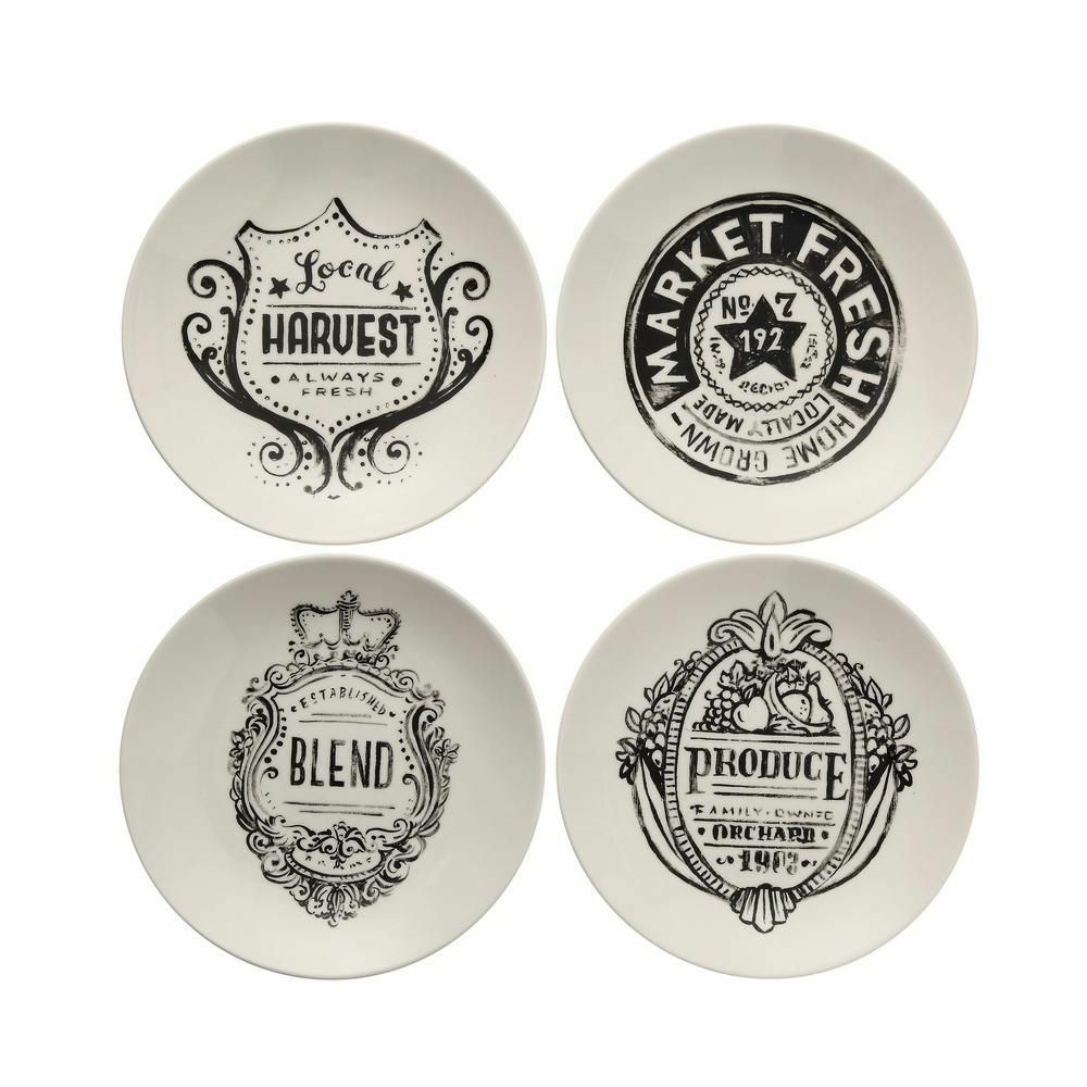 Creative Co-Op Set of 4 Farm Market Plates Eight-Inch dinner or salad plates with a different farm market design on each. White with black design New! (These were purchased in a shop, so there is some sticker residue on the back. Easily removed with water or sticker-removal product.)