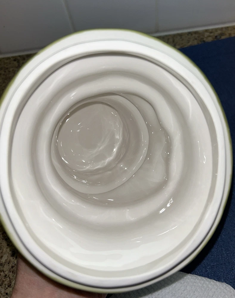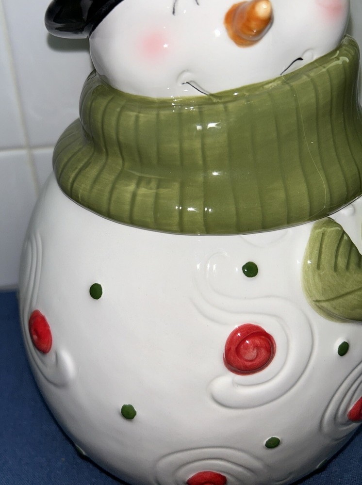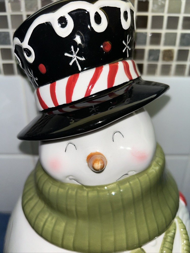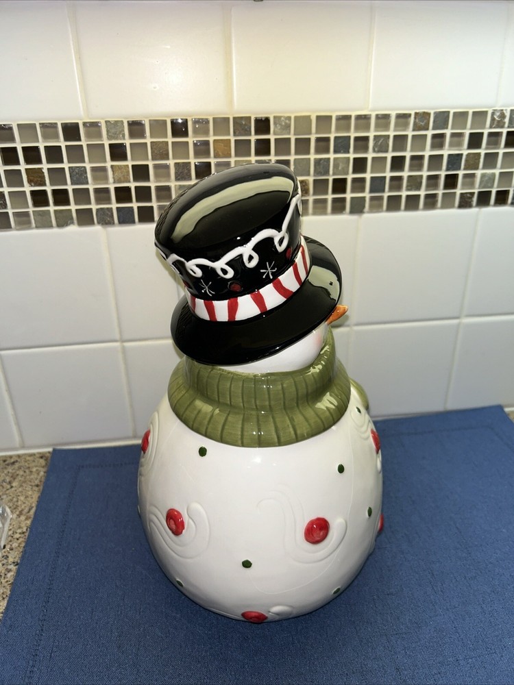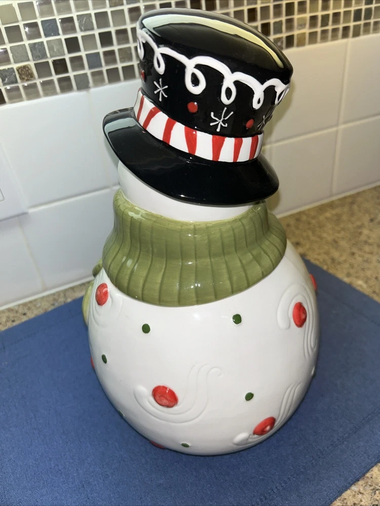 This adorable Creative Co-op cookie jar features a festive snowman design, perfect for storing your favorite holiday treats. With one compartment and a height of 11.5 inches, it's a great addition to any kitchen or collector's shelf. The jar is made of ceramic and has a width of 7 inches, making it a traditional size for easy storage. Whether you're a collector or just looking for a fun and functional kitchen accessory, this snowman cookie jar is sure to delight. Very rare and hard to find. Super cute design. I only used for display without cookies. I see a very light crazing line that is hard to see on left side but under the green neck scarf. See my other cute Christmas items and request combined shipping.