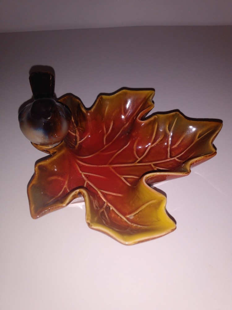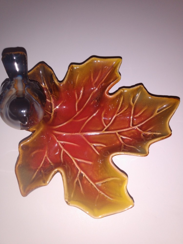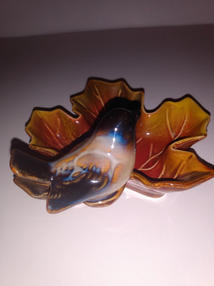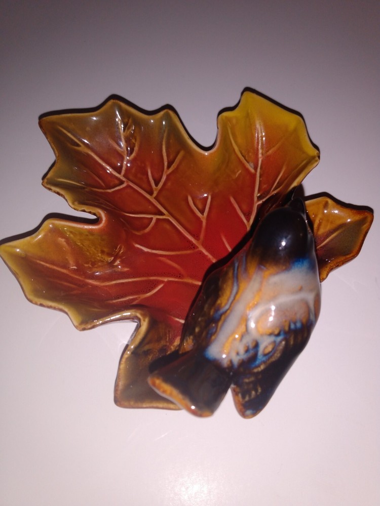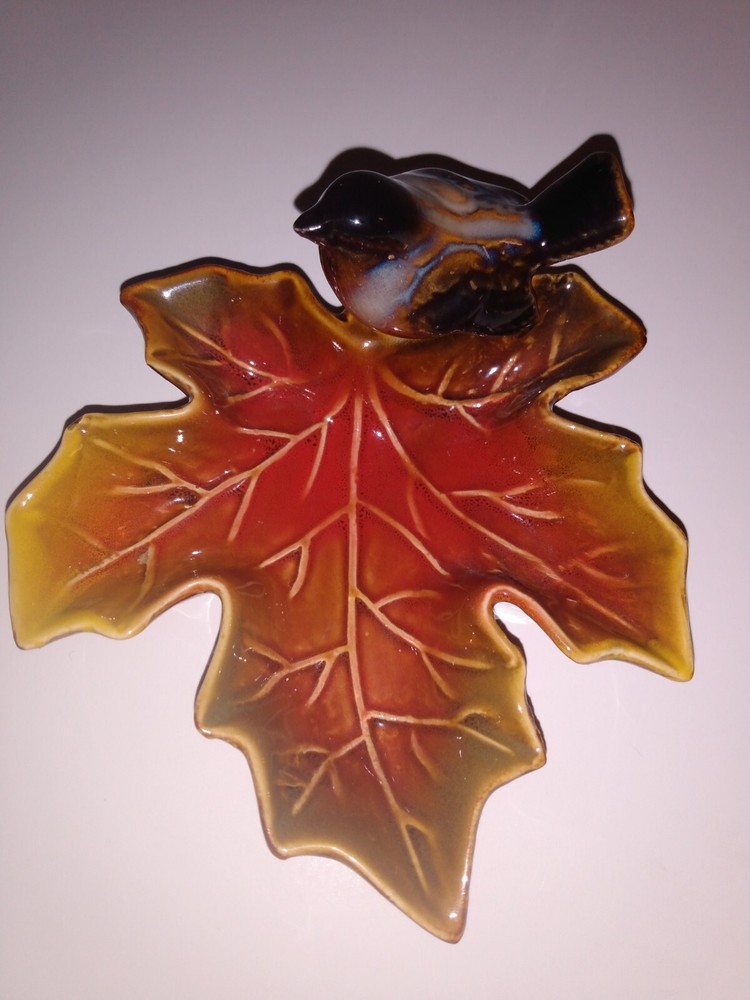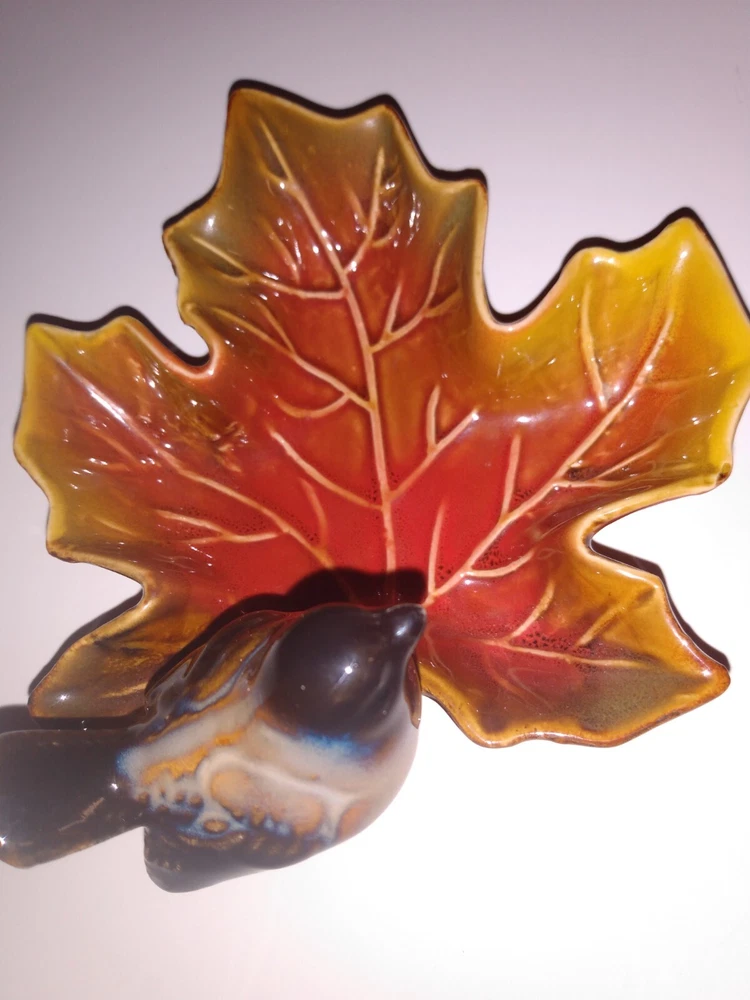 Creative Co-op Sparrow Bird On Maple Leaf Trinket Dish Tray Ashtray. Beautiful Gold And Green Tones Are In The Leaf And The Sweet Little Sparrow Is Black Gray And White And The Entire Piece Has A Very Pretty Gloss. Leaf Is 5" From Tip To Tip Bird Is 2". Very Nice. If You Have Any Questions Please Contact Me. Thank You For Shopping My Site!