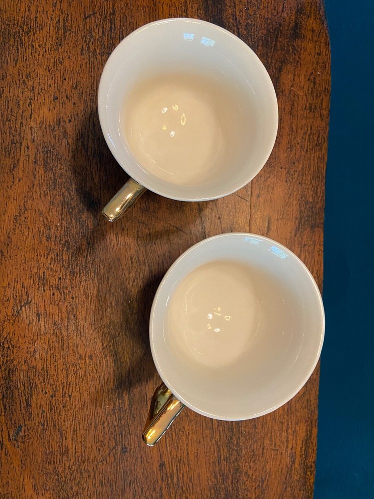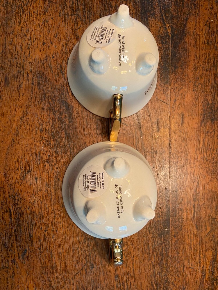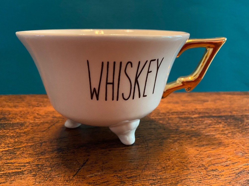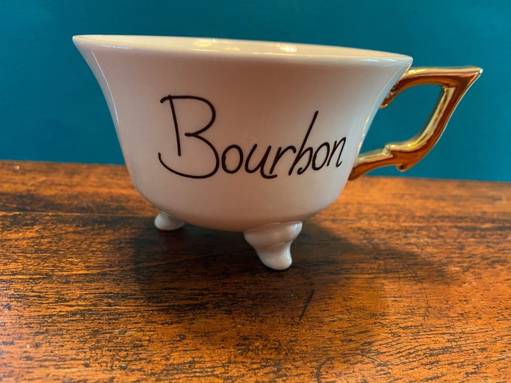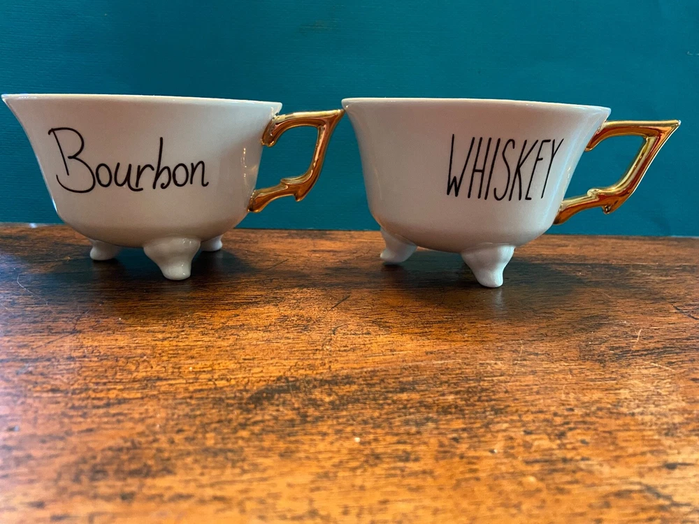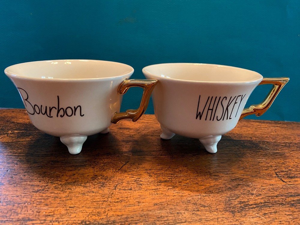 Creative Co-op Stoneware Bourbon/Whiskey 3 Footed W/Gold Handle 2 Tea Cups of Enjoy this 2 beautiful coffee tea / mugs in the beautiful color white with gold handle and black writing. Excellent condition looks unused Shipping is $9.50