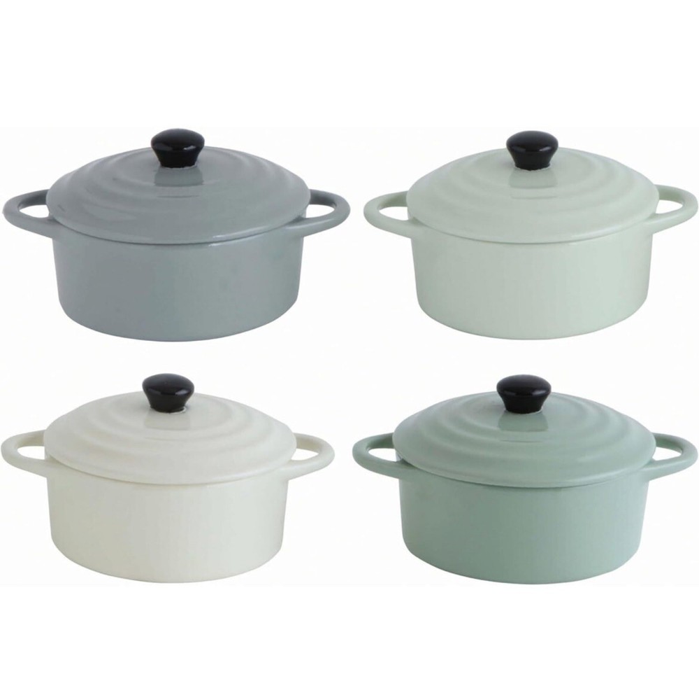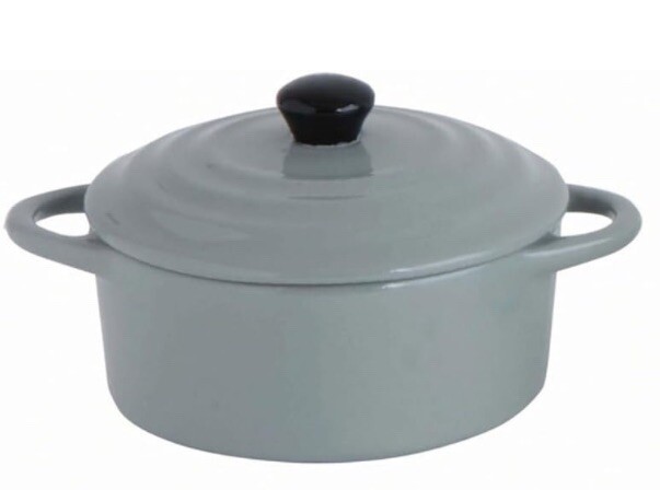This Creative Co-Op stoneware mini baker is the perfect addition to your kitchen. With a round shape and gray color, it is compatible with any stove type. The item diameter is 6.5 inches and it comes with a lid. This baker is made of high-quality stoneware material and features a creative design. Collect all 4 colors!