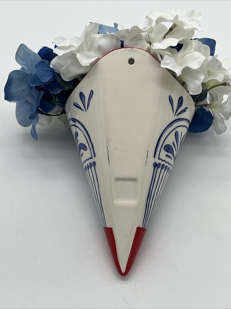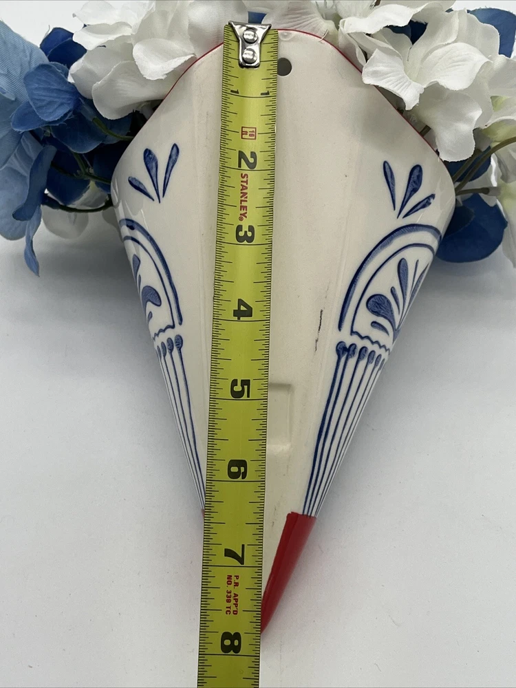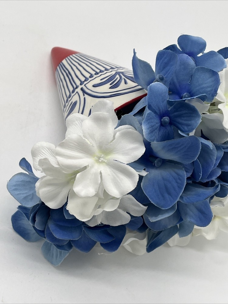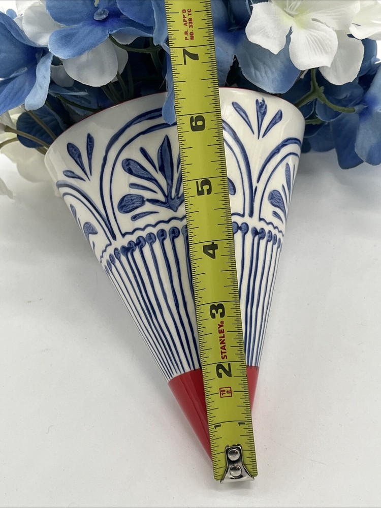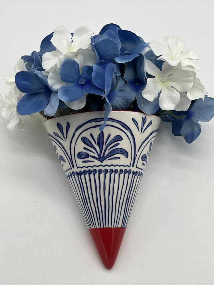 Add a touch of creativity to your home decor with this beautiful stoneware wall cone vase. The vase features a stunning abstract flower pattern in blue, white, and red, making it a perfect addition to any room. Its glossy finish and pottery production technique add to its unique charm. It is by the Creative Co-Op brand and is a great way to add a touch of flower art to your home. PLEASE NOTE: flowers are removable. Currently they are in a gummy type adhesive at the base of the wall pocket.