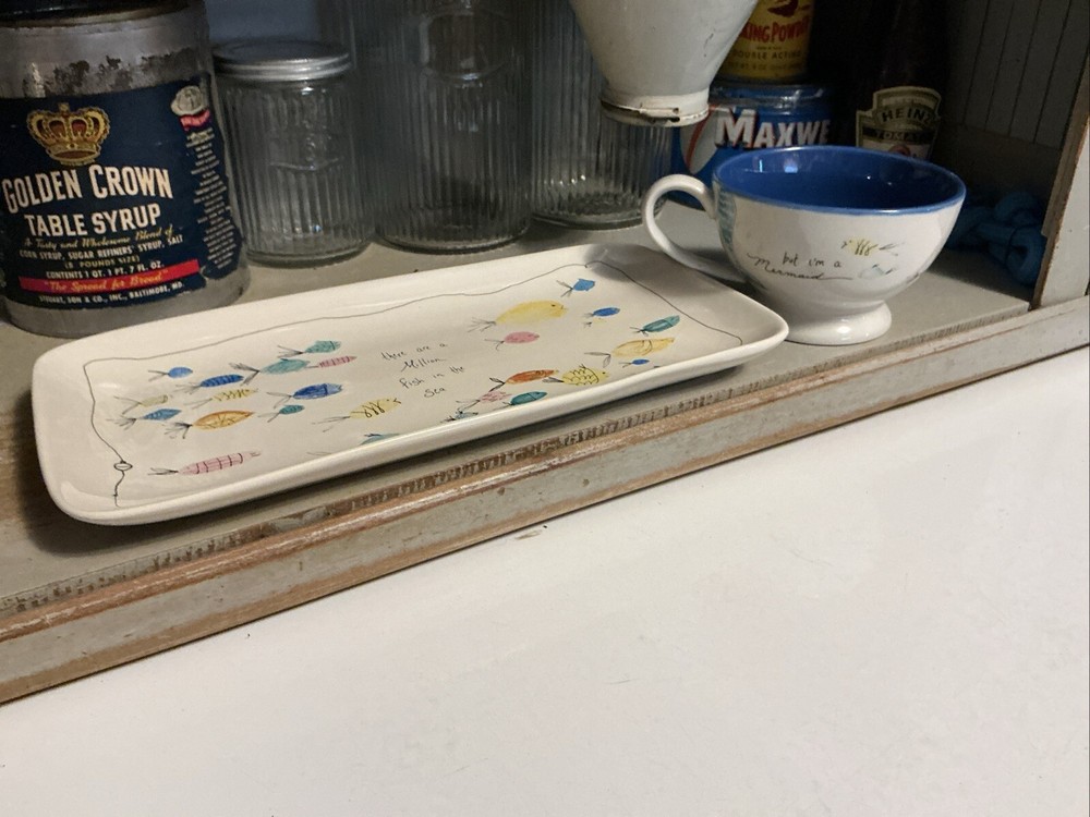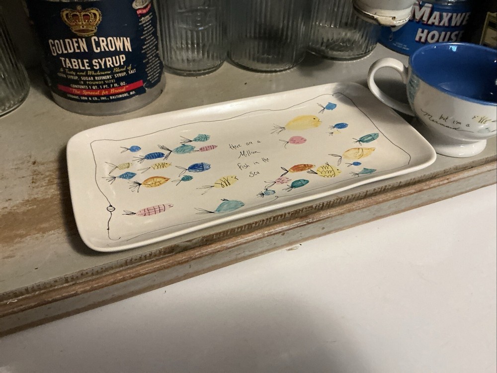 This Creative Co-op Tawnya Norton platter and Mermaid Mug set is a must-have for any collector of decorative items. The white color of the platter and mug perfectly complements the fish-themed design, making it an eye-catching addition to any display. Crafted by Creative Co-op, a trusted brand in the industry, this set is sure to impress. Perfect for serving drinks or displaying as a decorative piece, the platter and mug are both functional and beautiful. Add this unique set to your collection today!