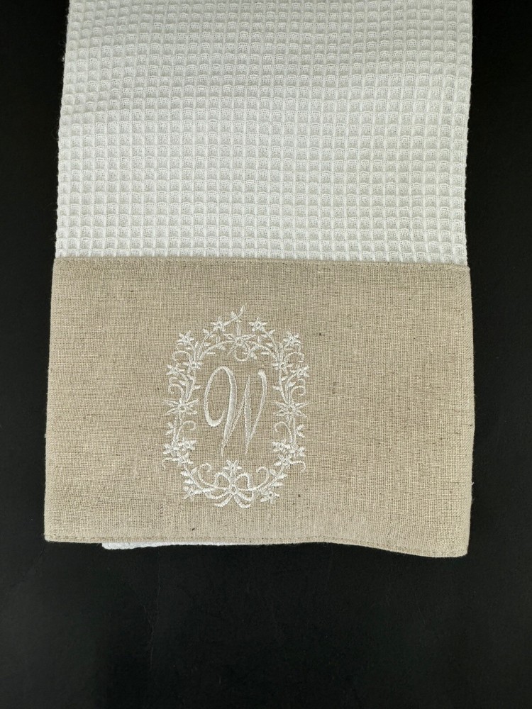 This towel is fantastic! The waffle weave is super absorbent and the monogram adds a lovely personal touch. It feels durable and looks beautiful in my kitchen.