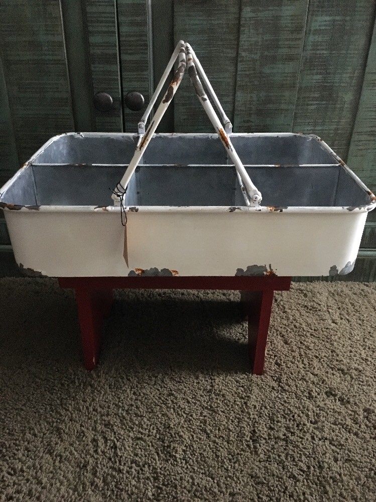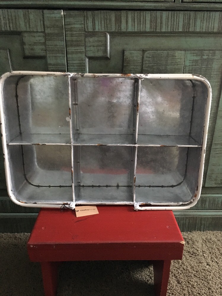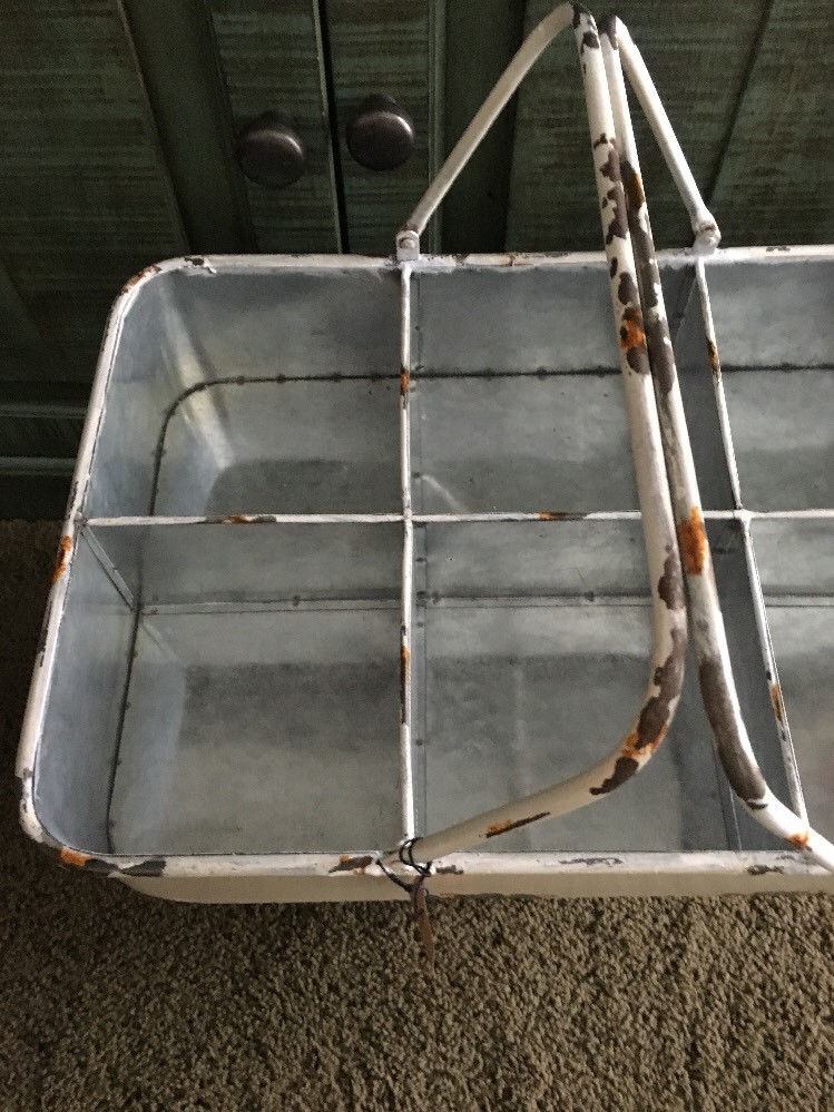 NWT creative co-op Distressed compartment tin basket with handles. Measures 18 1/2” long Price is for 1(2 available)