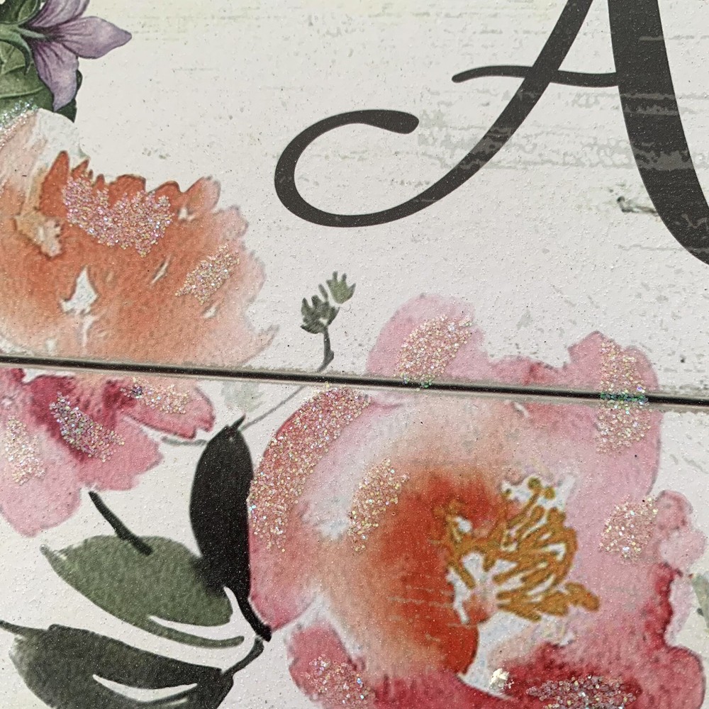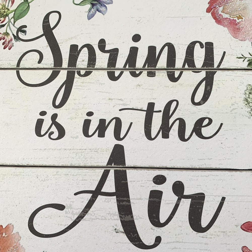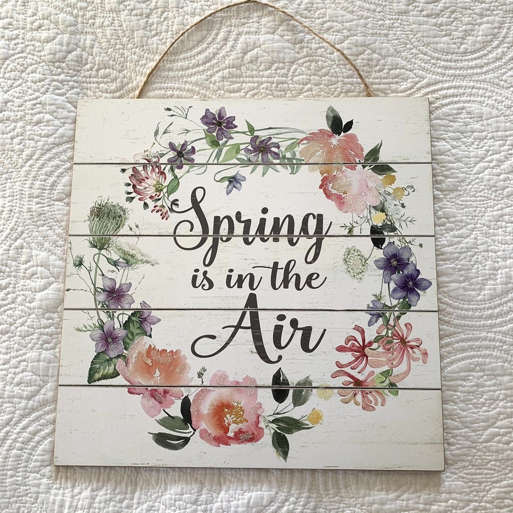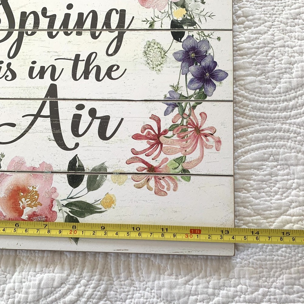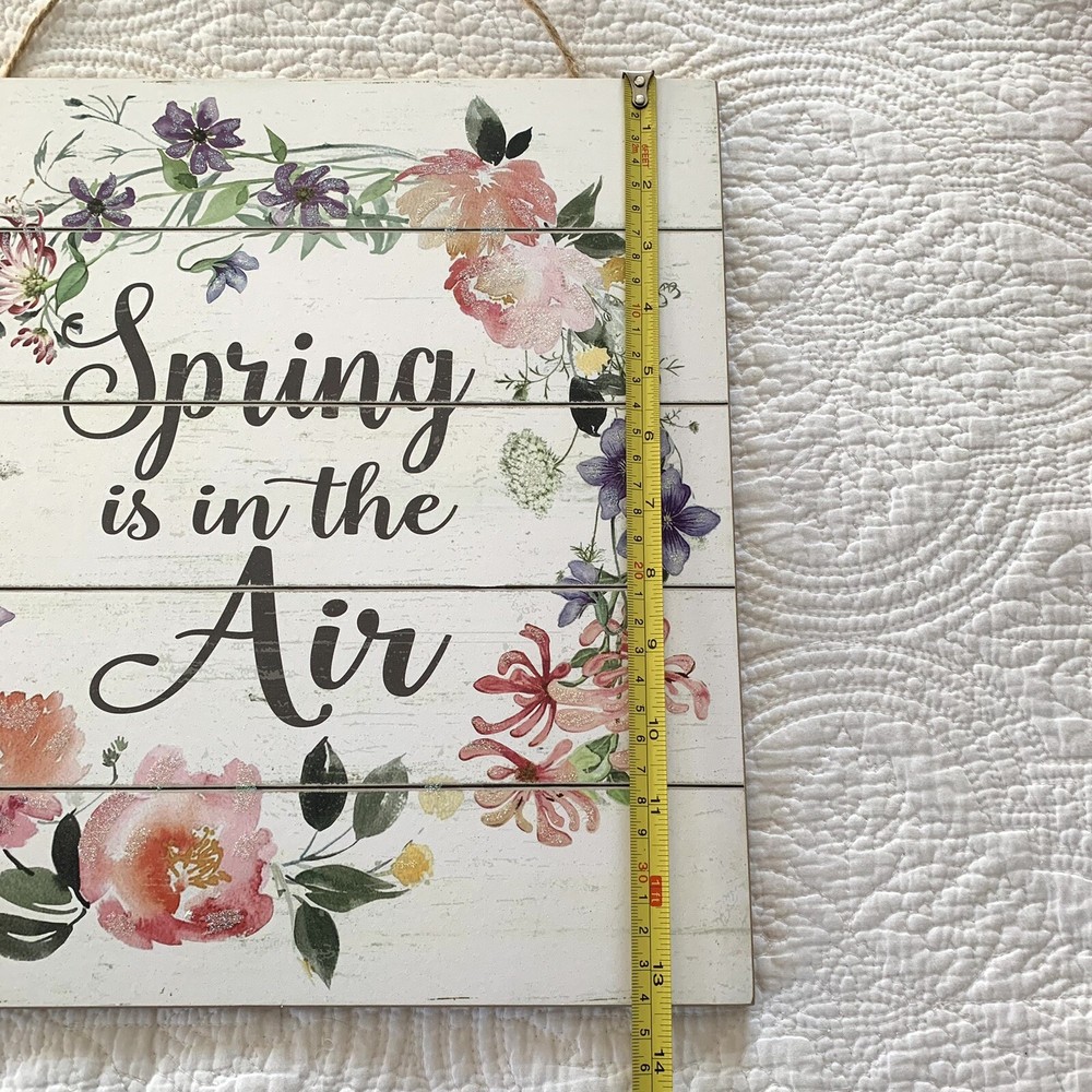 Bring spring indoors with this cute wall art from Creative Co-op! This wall hanging has a farmhouse and shabby chic esthetic featuring a distressed “ship lap” base with a glittery floral print. “Spring is in the Air” is printed in calligraphy. Pre-owned in very nice condition. Approx. 13” x 13” square. Can be hung by attached twine or by back brackets.