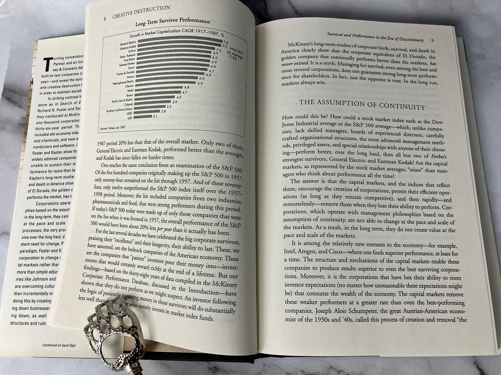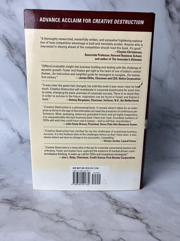 This book, titled "Creative Destruction: Why Companies That Are Built to Last Underperform the Market--And How to Successfully Transform Them" is a must-read for anyone interested in business and economics. Written by Richard Foster and Sarah Kaplan, it was published in 2001 by Crown Publishing Group, T.H.E. The book is a trade paperback with 384 pages, measuring 9 inches in length and 6 inches in width, with a height of 0.9 inches and a weight of 22 ounces. It is a reprint and has features that make it stand out. The book is written in English and covers topics such as infrastructure, development/business development, economic conditions, management, strategic planning, and organizational development.